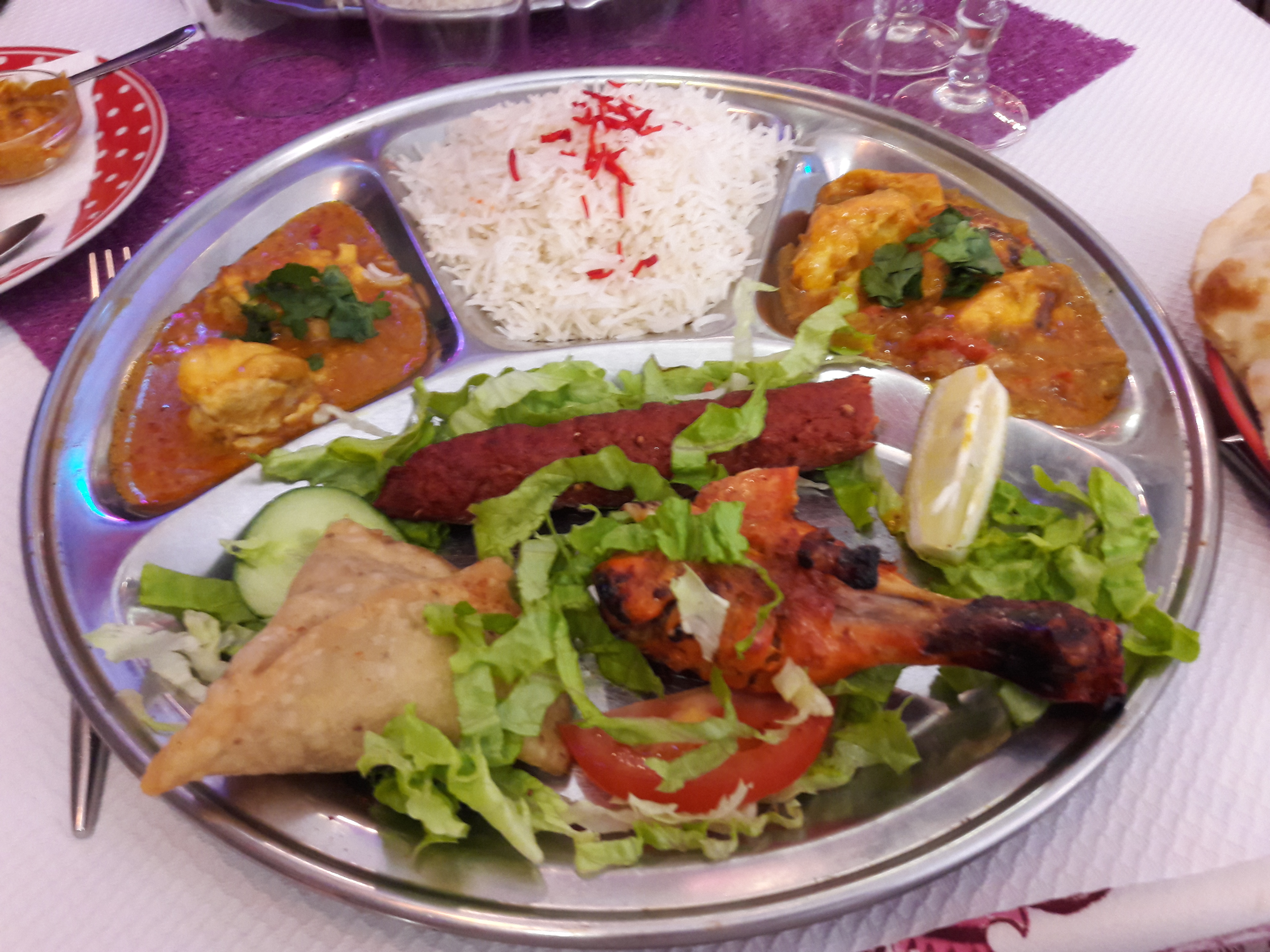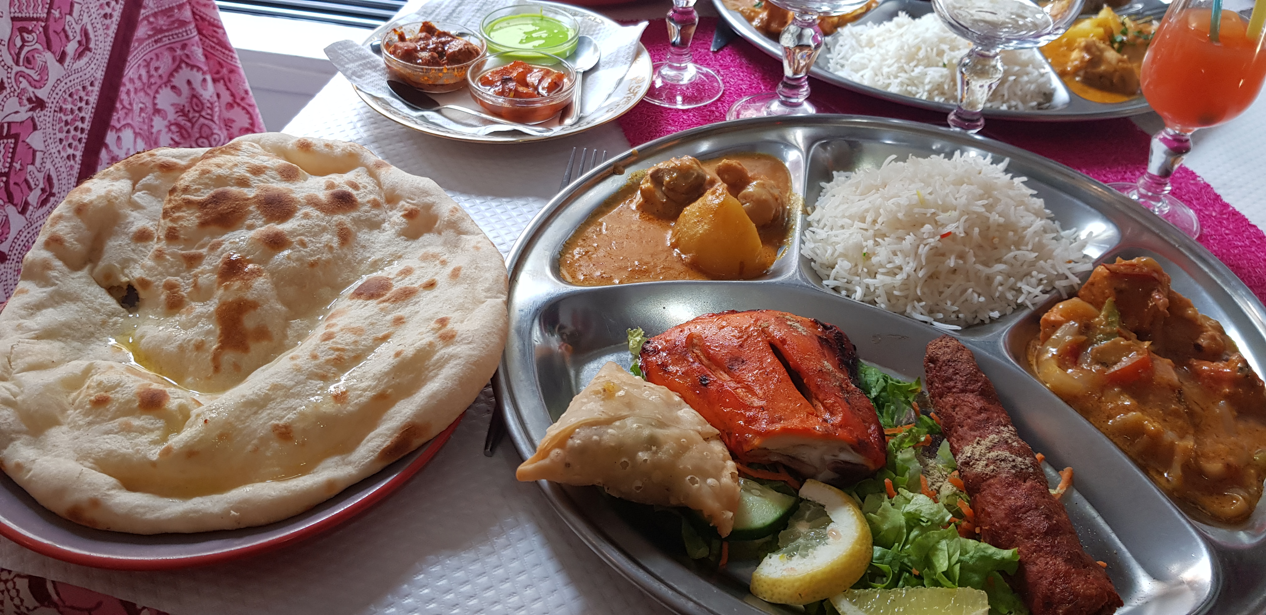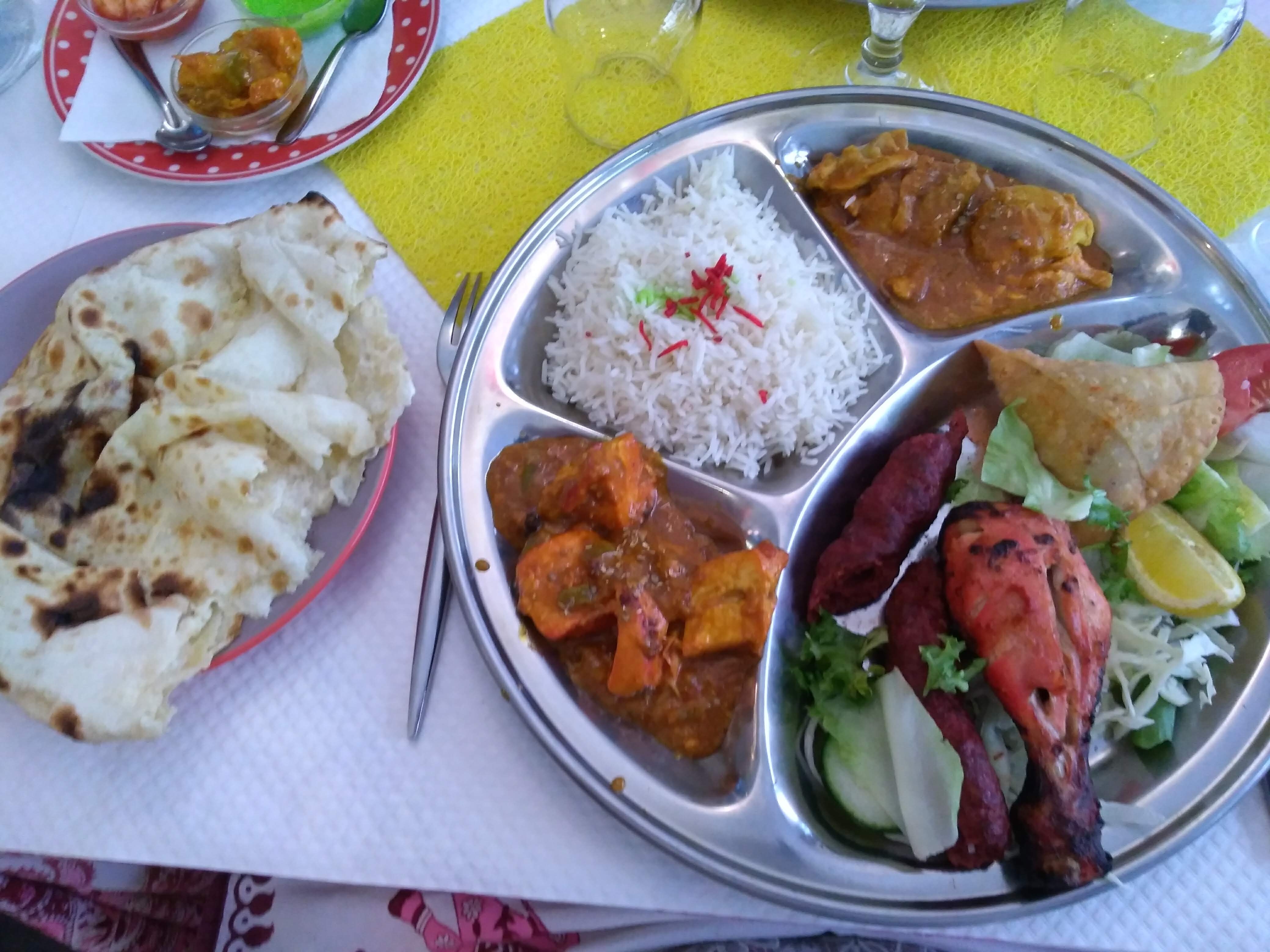 Commande à emporter prête et encore chaude le temps que je vienne la récupérer. Dans une rue animée, restaurant avec possibilité de manger en extérieur, accueil fort sympathique. Le menu Rajathan2 est vraiment pour deux ! Excellents samoussas de légumes, le poulet tika bien assaisonné avec de bons poivrons. Nan à l’ail excellent. Je recommande à 💯 %
