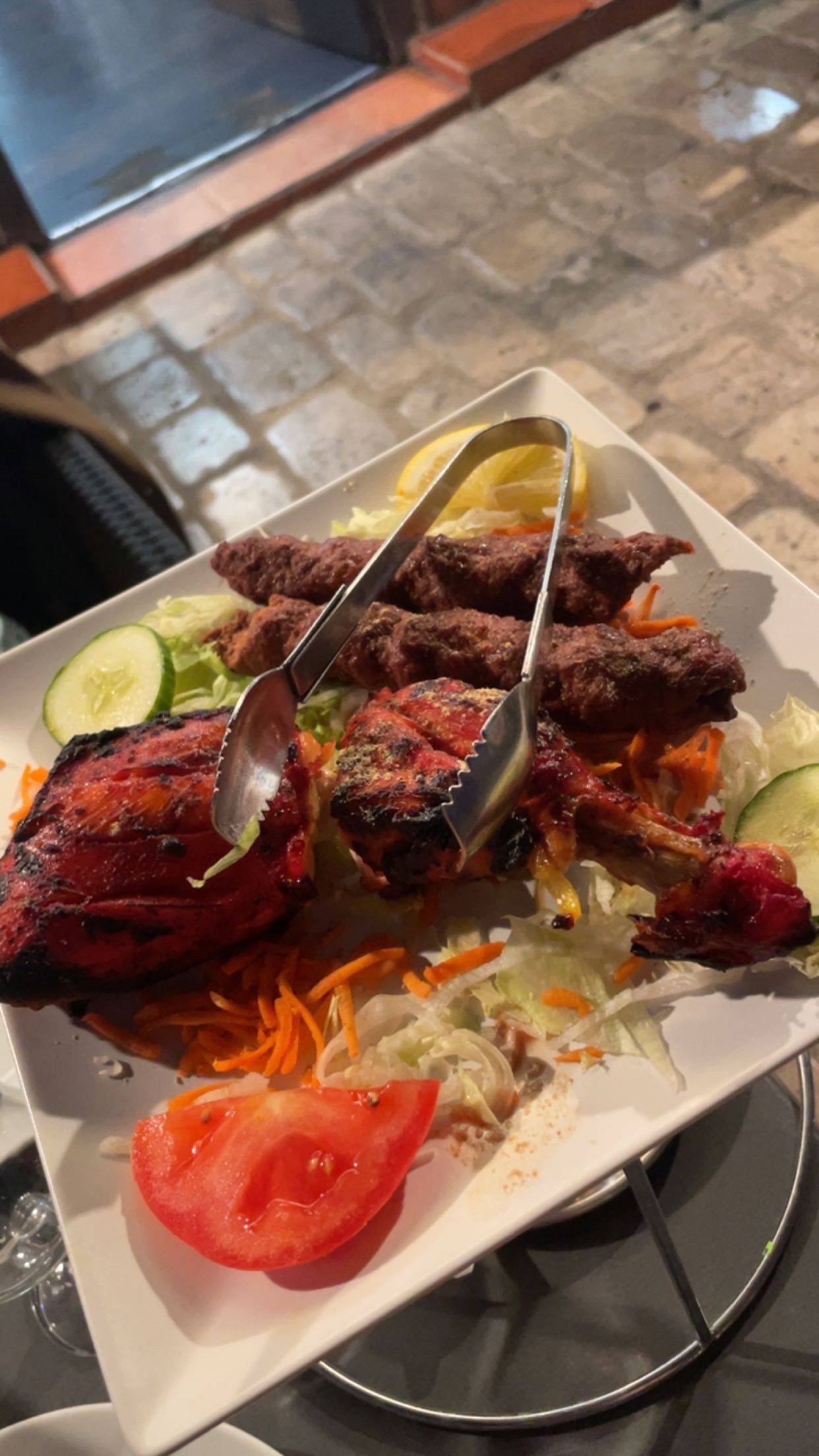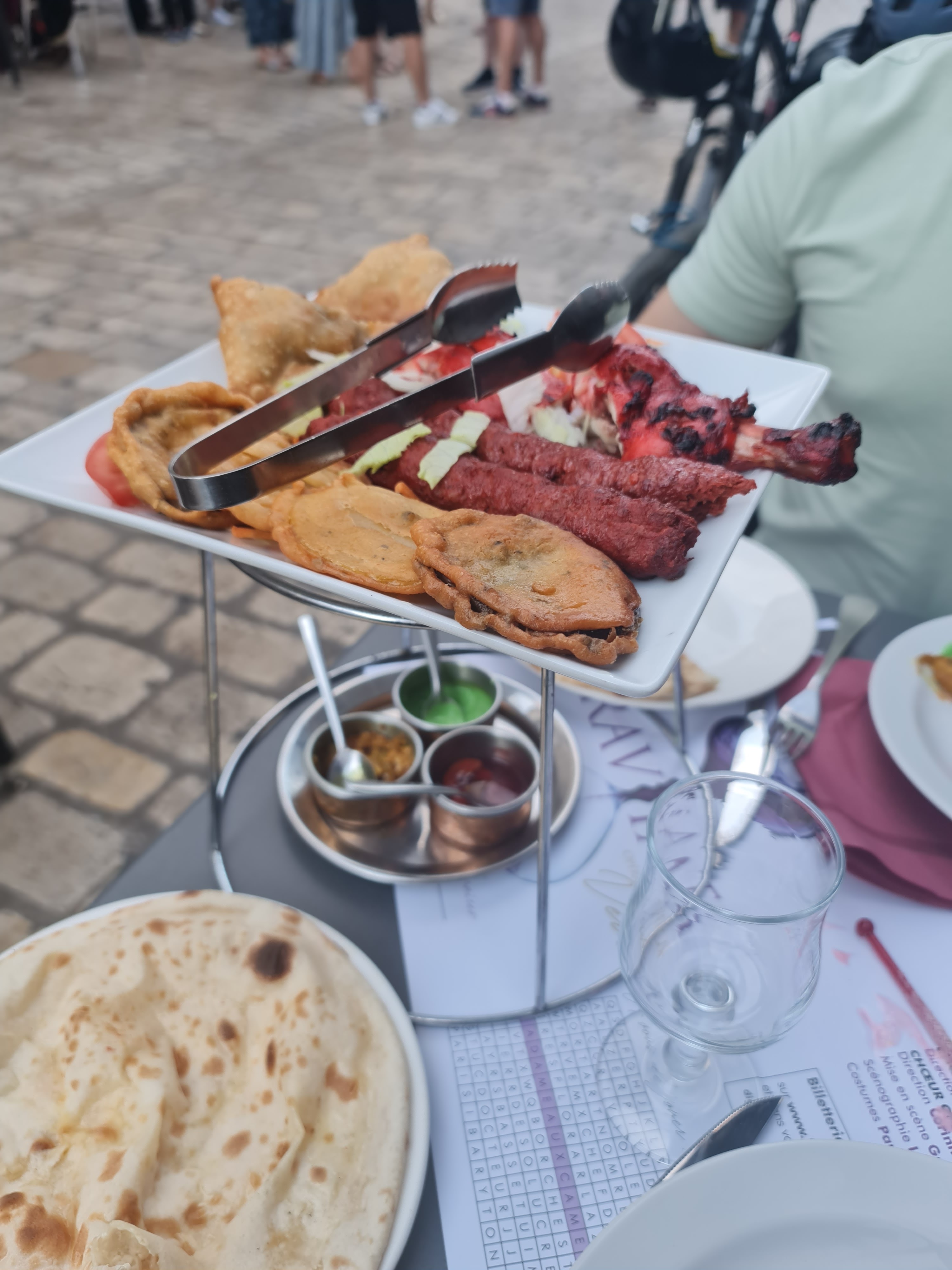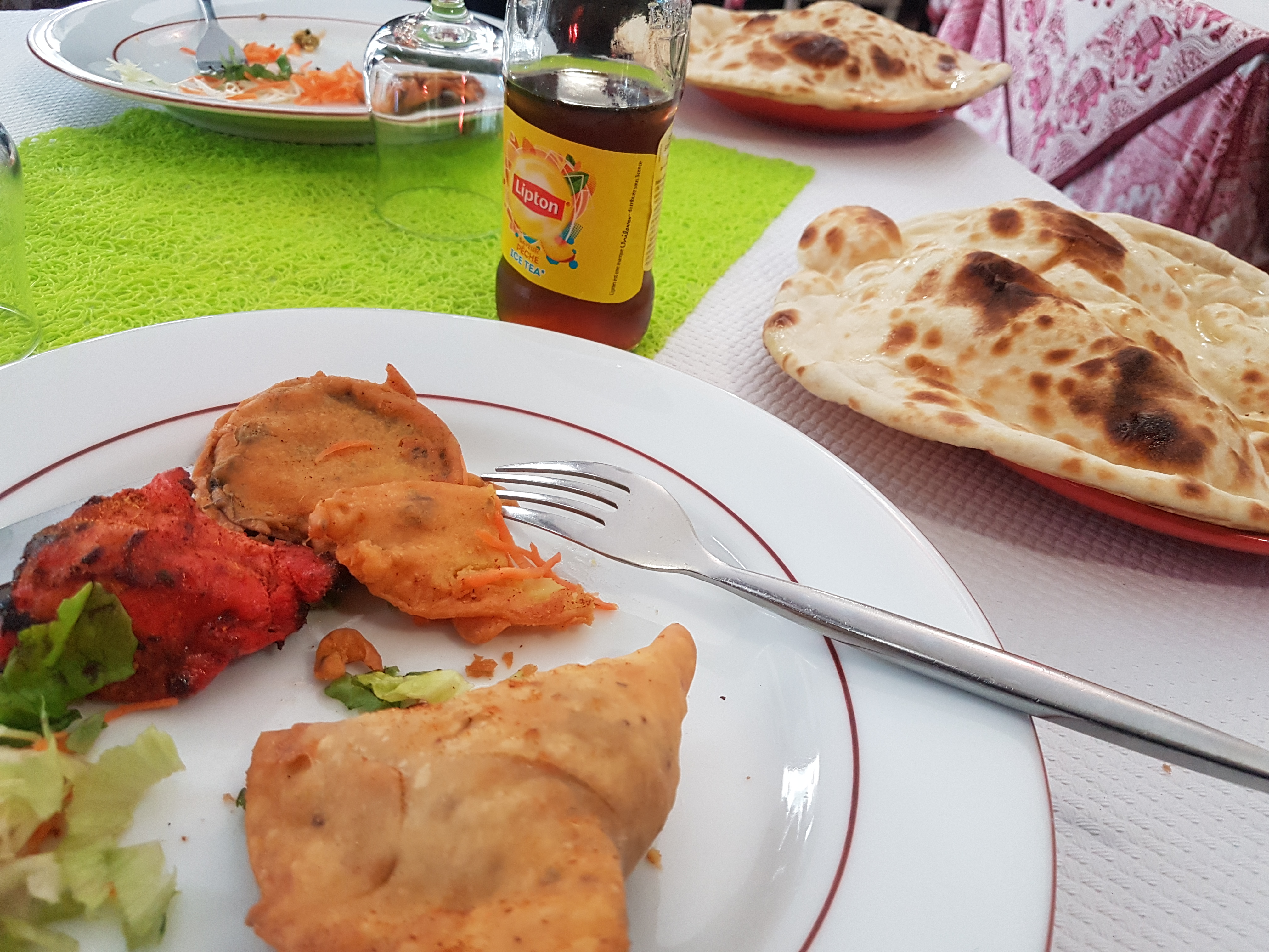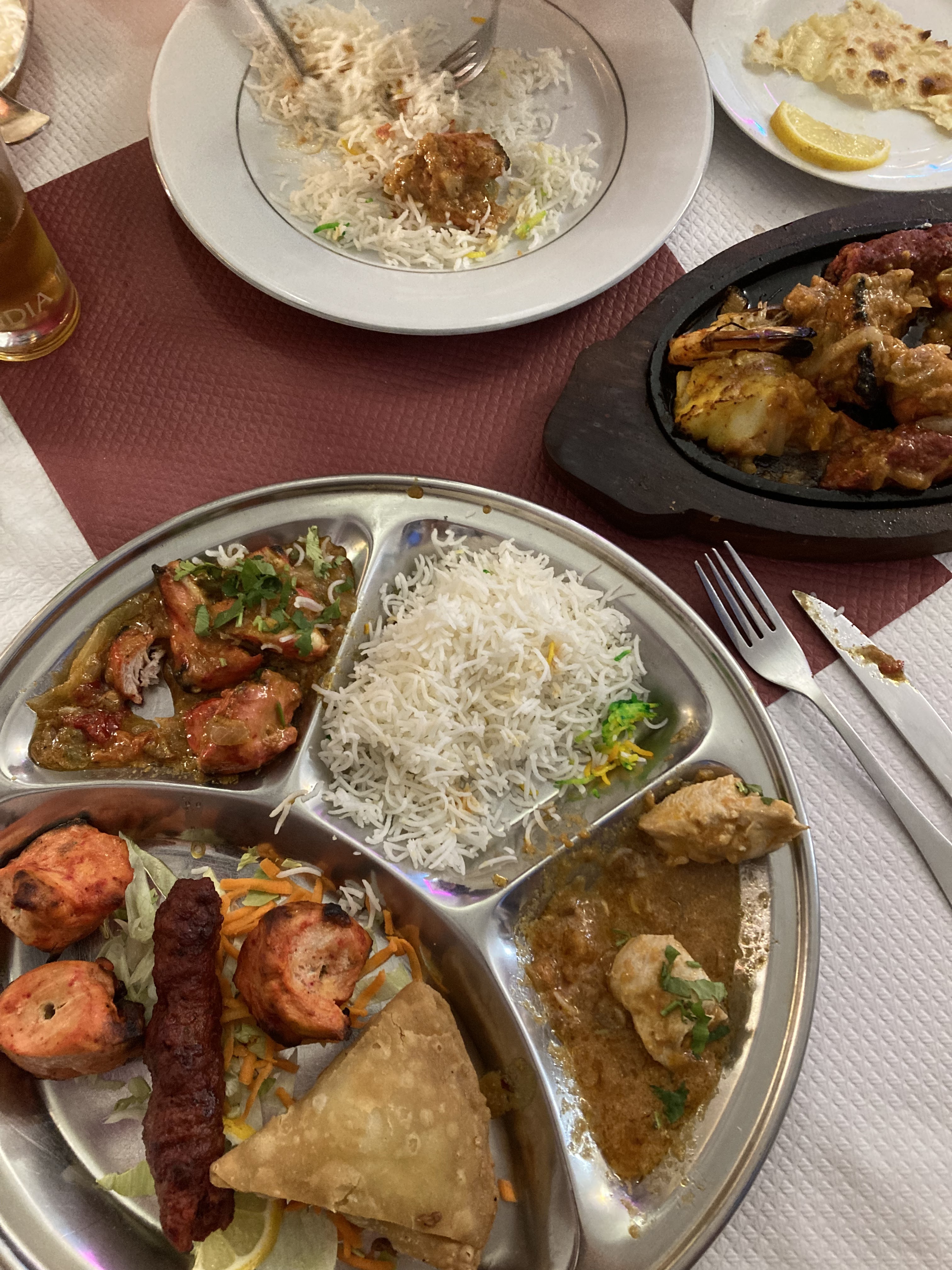 Commande à emporter prête et encore chaude le temps que je vienne la récupérer. Dans une rue animée, restaurant avec possibilité de manger en extérieur, accueil fort sympathique. Le menu Rajathan2 est vraiment pour deux ! Excellents samoussas de légumes, le poulet tika bien assaisonné avec de bons poivrons. Nan à l’ail excellent. Je recommande à 💯 %
