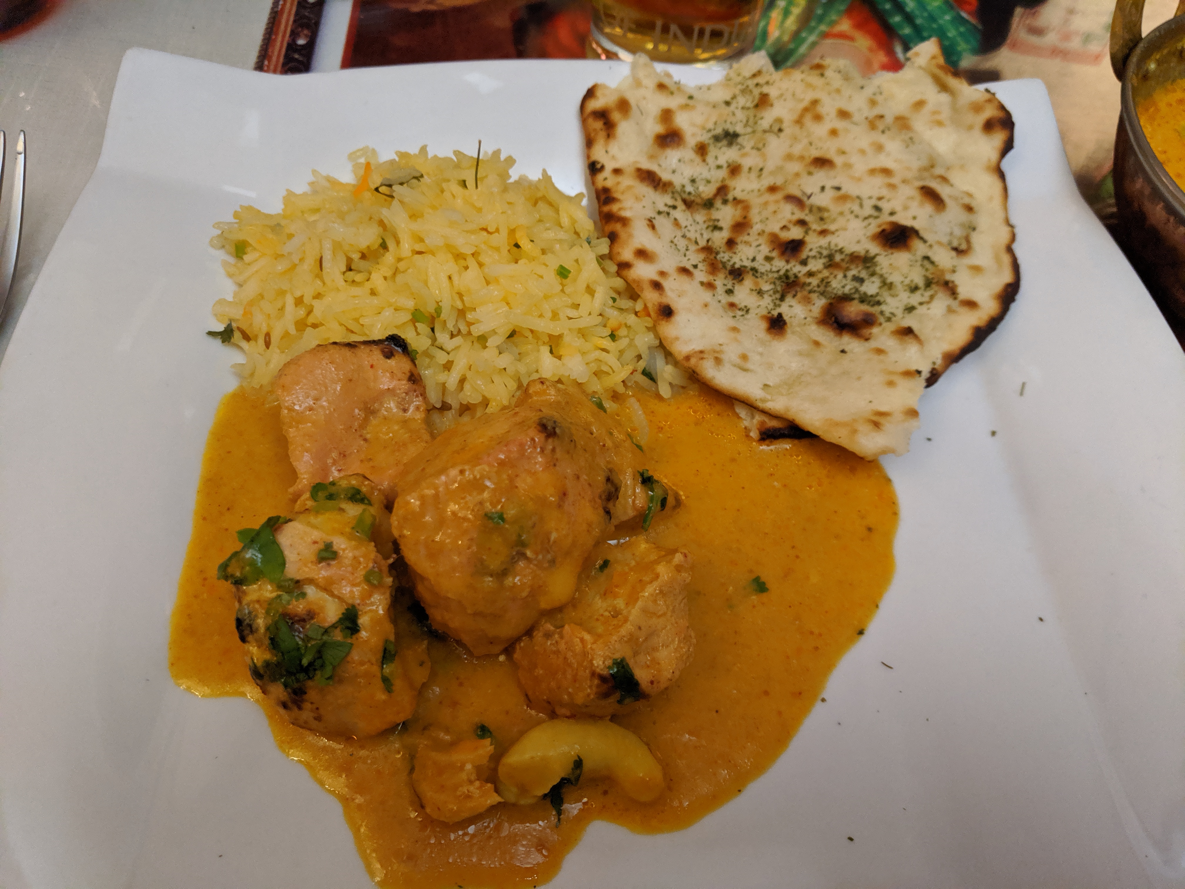 Plutôt bon, pas le meilleur indien que j'ai mangé, lieu un peu petit difficile à trouvé dans une ruelle, riz au citron très bien fait mais j ai pas aimé, excellent poulet (probablement du fermier) mais en trop petite quantité, beignet au légumes plutôt bon, Naan fromage manquait de goût. Addition un peu élevé pour un indien.
