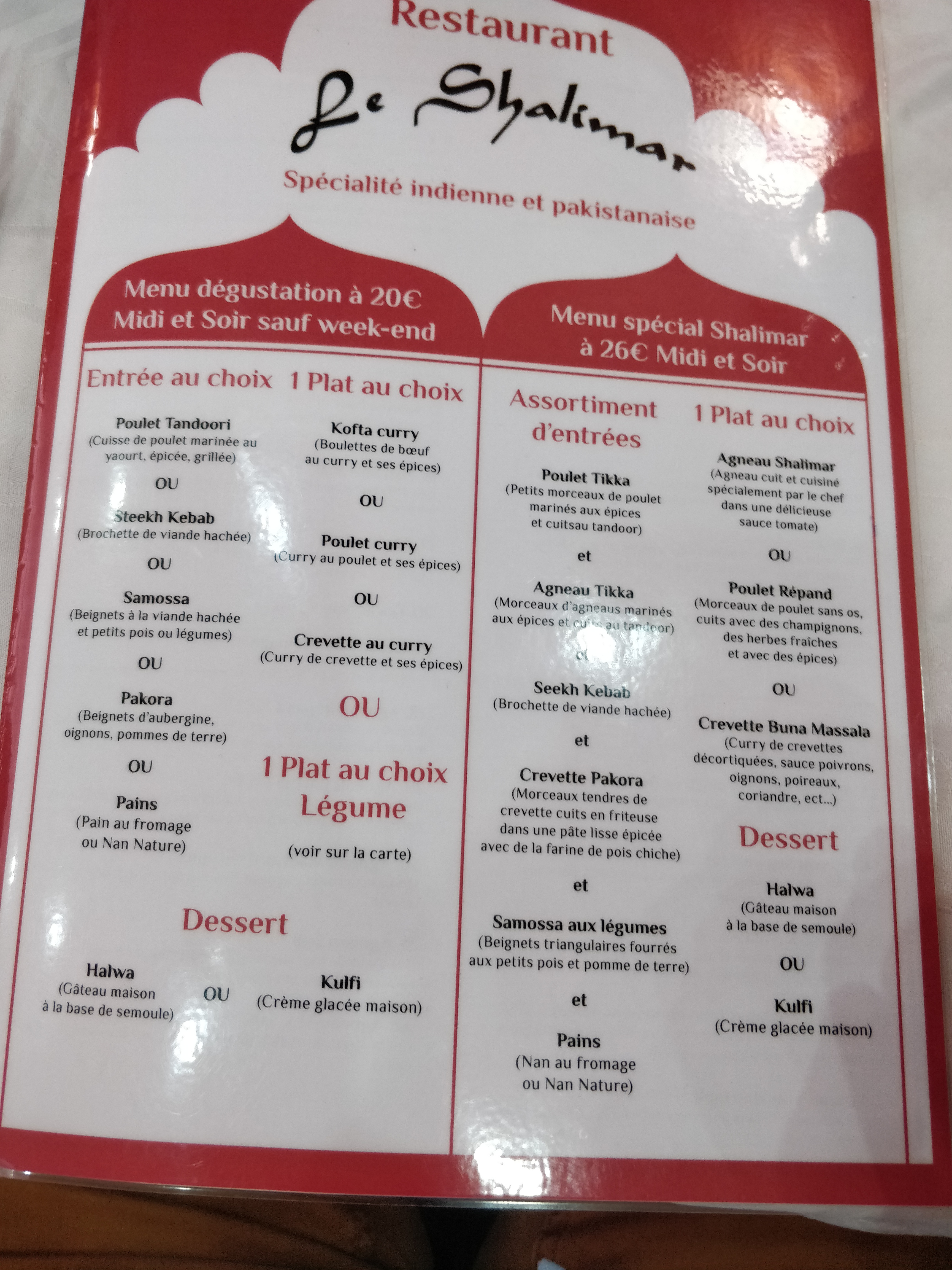 Je recommande le restaurant Shalimar à 100% pour plusieurs raisons : la diversité des plats indiens/pakistanais, j'ai presque goûté tous le menu, il n'y a pas un seul que je n'ai pas aimé, le restaurant jouis d'une hygiène parfaite, les personnels sont très sympathique et accueillant, ils vous accordent du temps surtout le monsieur qui a un vrai sens d'humour, possibilité de se faire livrer chez soit que ce soit en passant par des plateforme comme uber eat ou delivero, ou même par les livreurs du shalimar. Personnellement je suis cliente depuis 4 ans, et j'ai jamais été déçue.