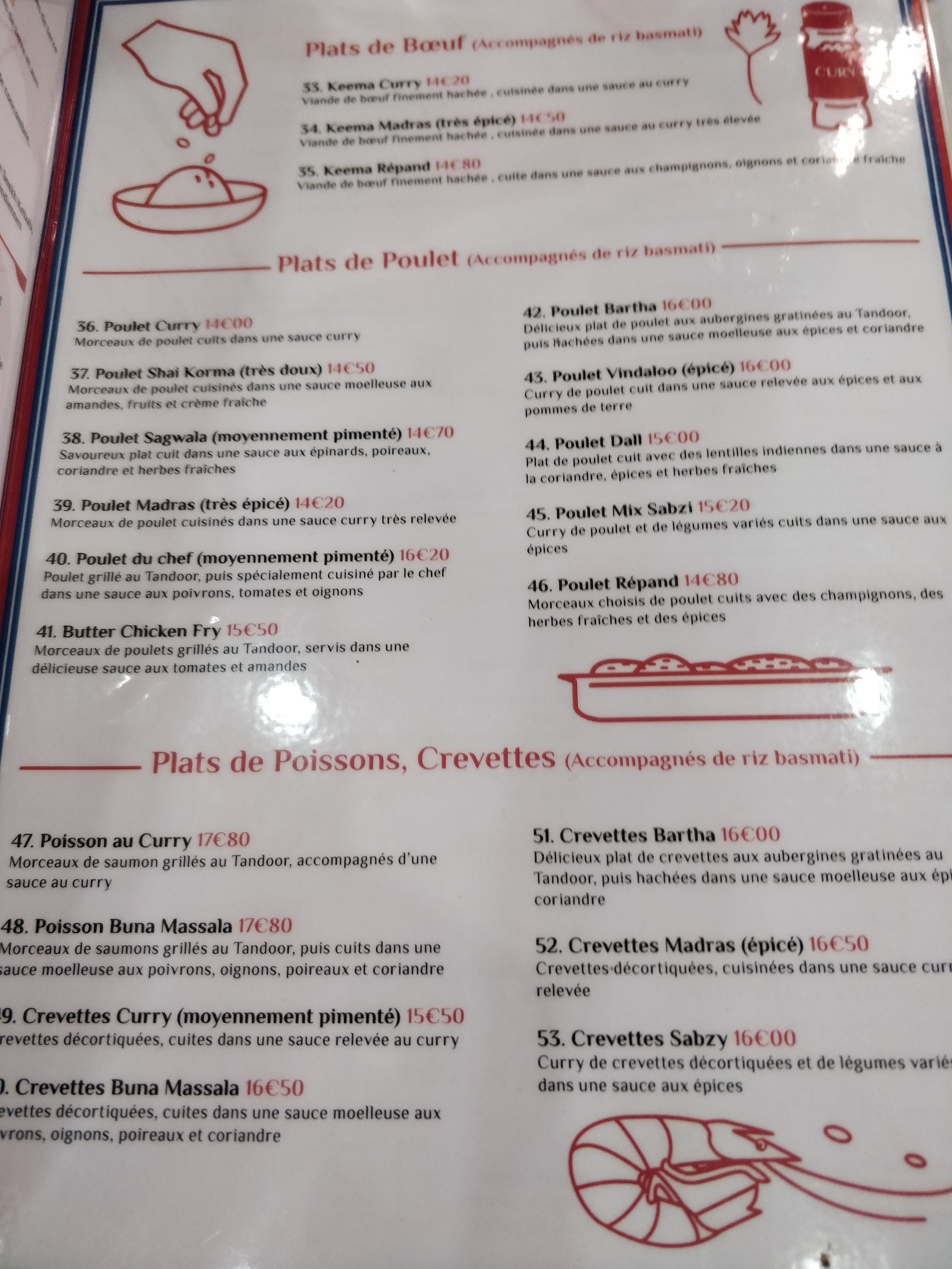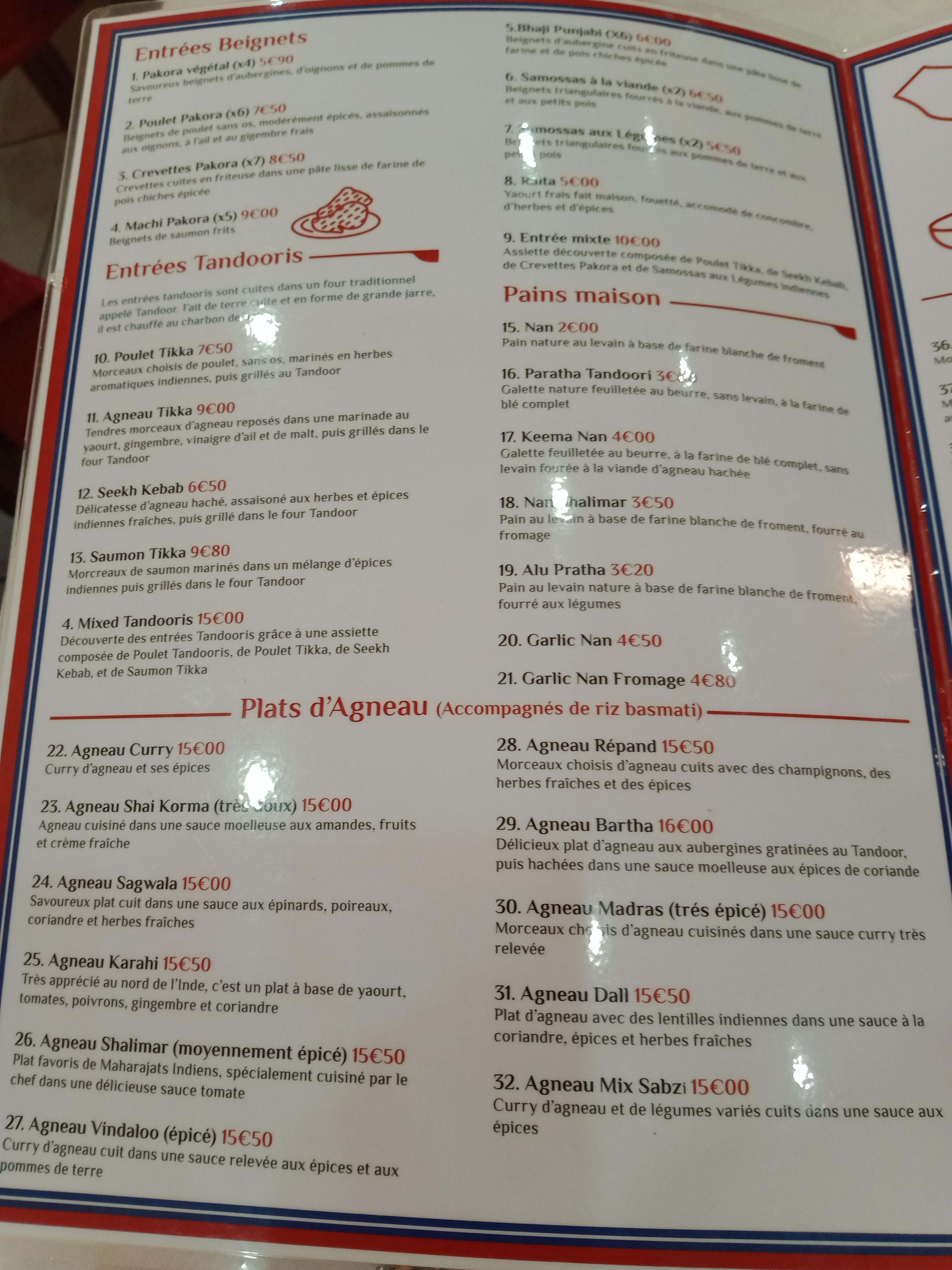 Une très belle découverte. Le menu à 26€ (entrées, plat + dessert, même le week-end) permet de goûter plusieurs spécialités Indiennes et tout était très bon. La carte est bien fournie, le lieu est typique, et ils sont très généreux et commerçants !