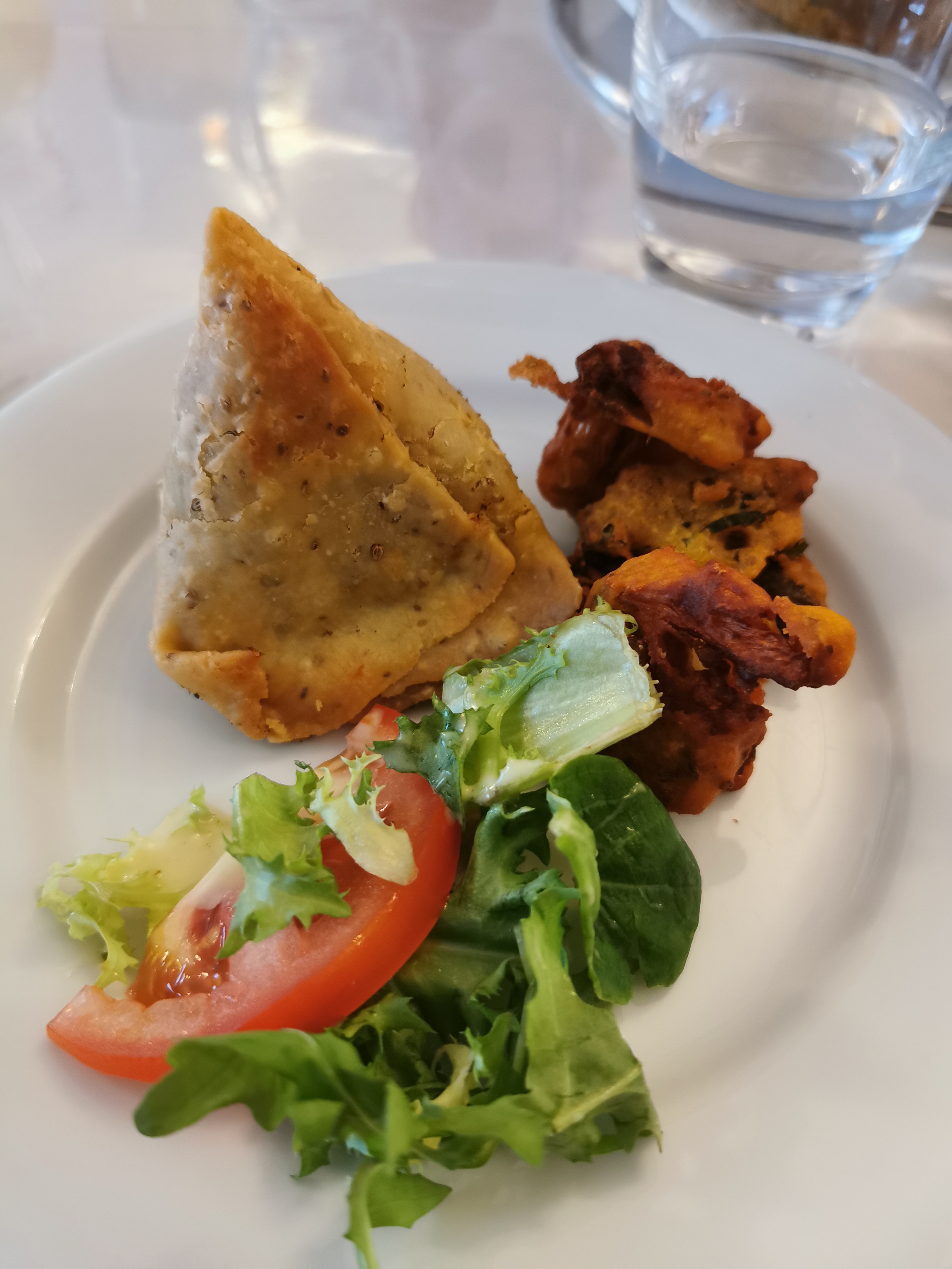 Plats épices indiennes bien dosées. Assiette copieuse. Espacement des tables permettant les échanges.