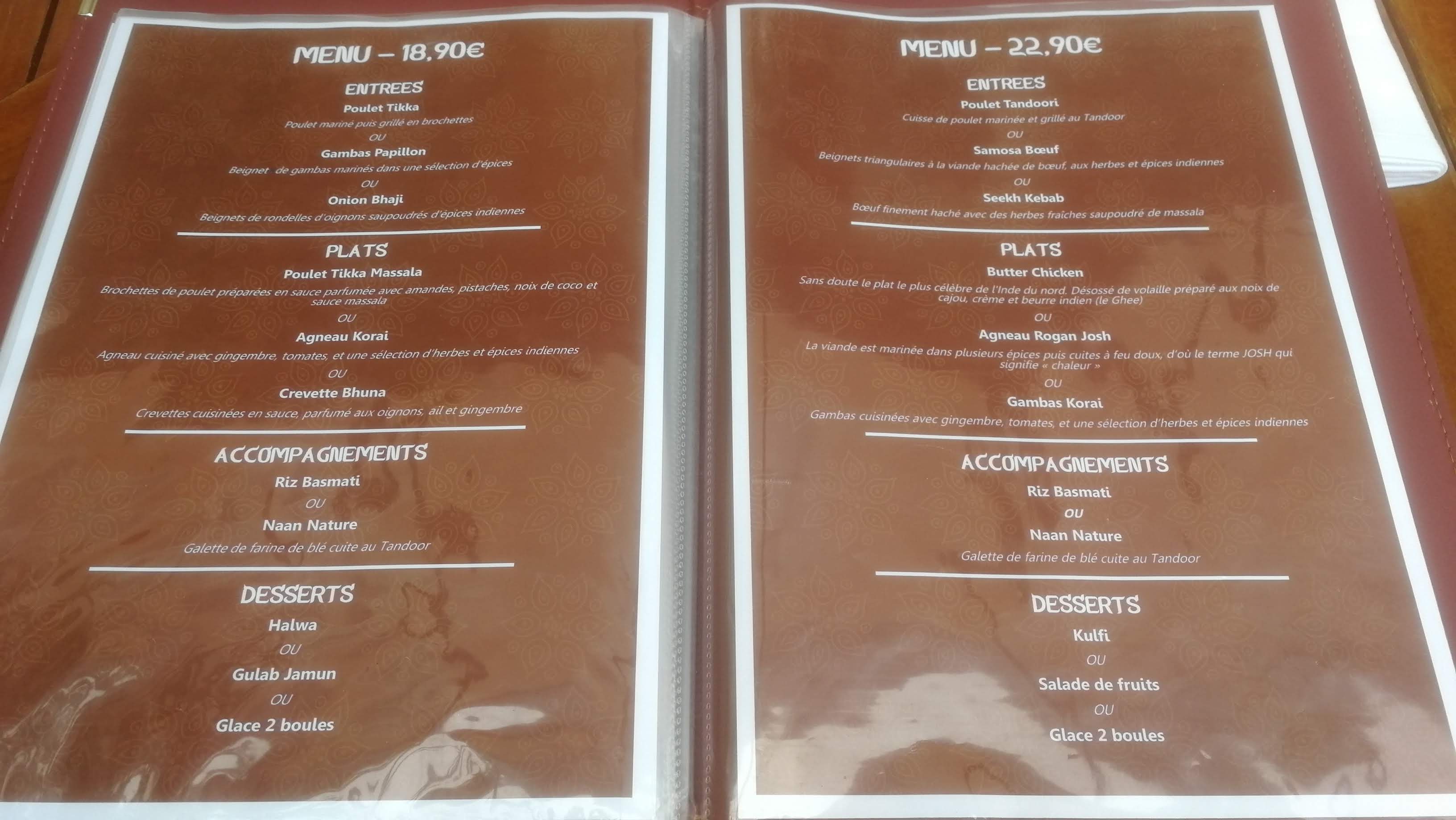 un très bon acceuil nous avons pris des crevettes en entrée très bonne mais manque de quantité je pense que deux de plus aurait etait necessaire en plat peincipal l'agneau etait excellent mais pour les novices de la cuisine indienne attention cest assez relevé pour les dessert tres bon aussi mais consistant surtout le gateau de semoule lambiance est tres agréable et le décor tres jolie