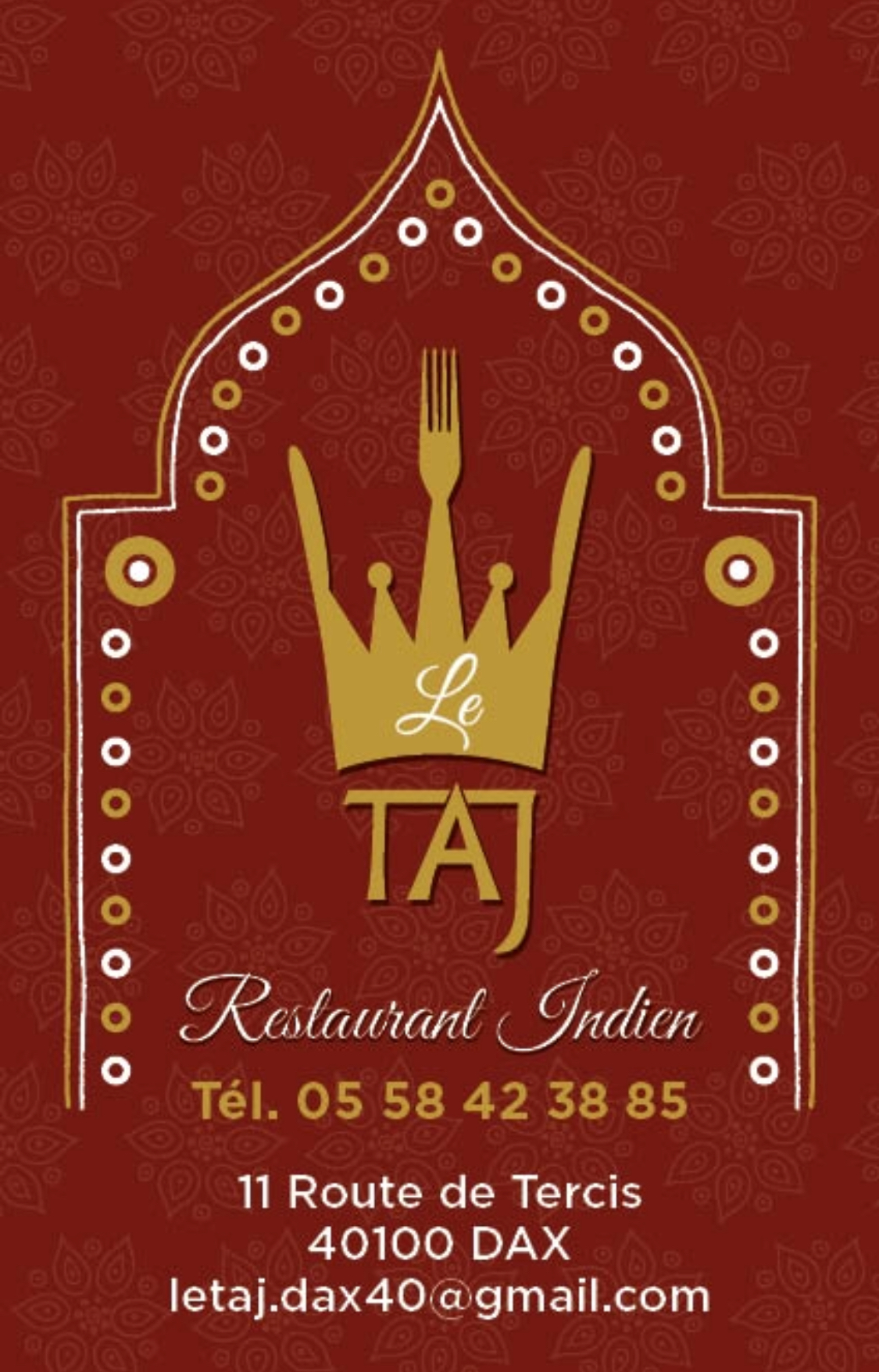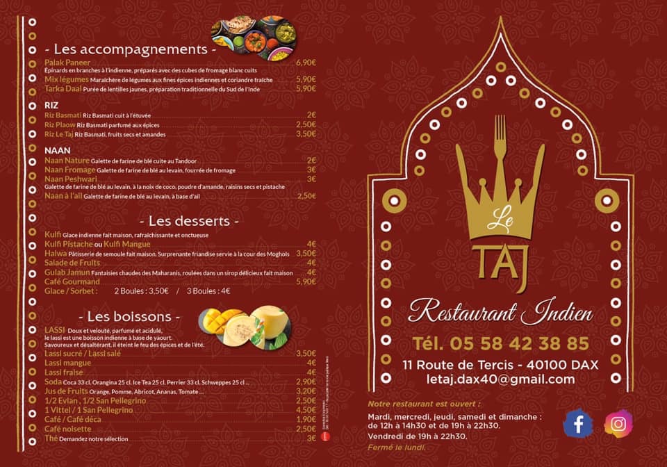 Voici toutes les informations sur le Restaurant indien Le Taj qui ce trouve au 11 Rte de Tercis, 40100 Dax (40). Sur cette fiche vous trouverez les photos, l'adresse, les horaires d'ouverture, le numero de téléphone et les avis clients.Vous pouvez églement rédiger un avis si vous le souhaitez en bas de page.