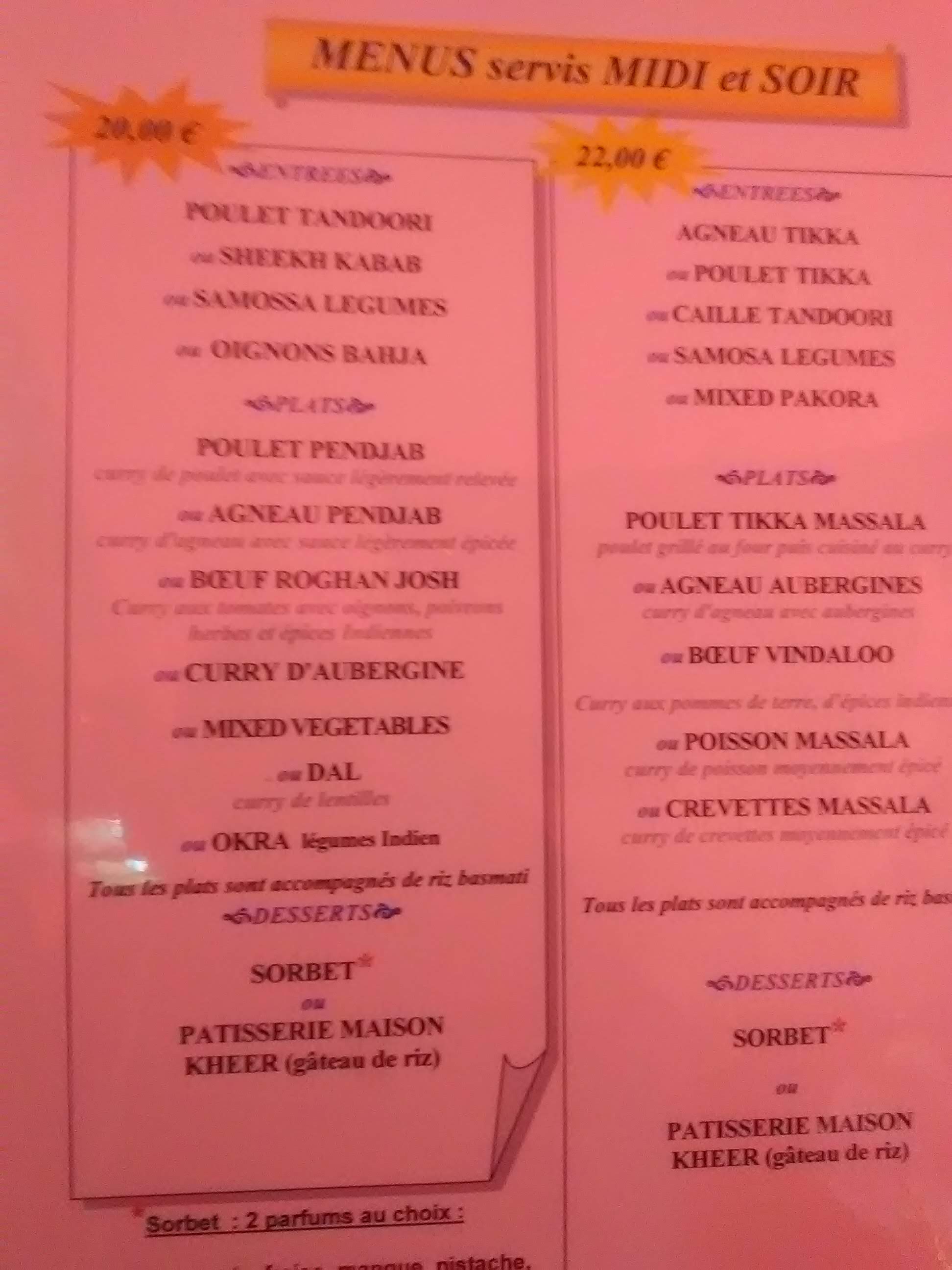 Cadre sympathique personnels très souriant et à l'écoute pas trop d'attente très bien dommage que les plats choisi comme crevettes massala sont noyés dans un concentré de tomate au curry c'était bon mais la sauce tomate c'est écoeurant à force riz une tuerie le patron en fin de repas vous offre soit des bâtons d'encens soit un thé mente exquis .les prix correcte et pour toutes les bourses surtout le midi