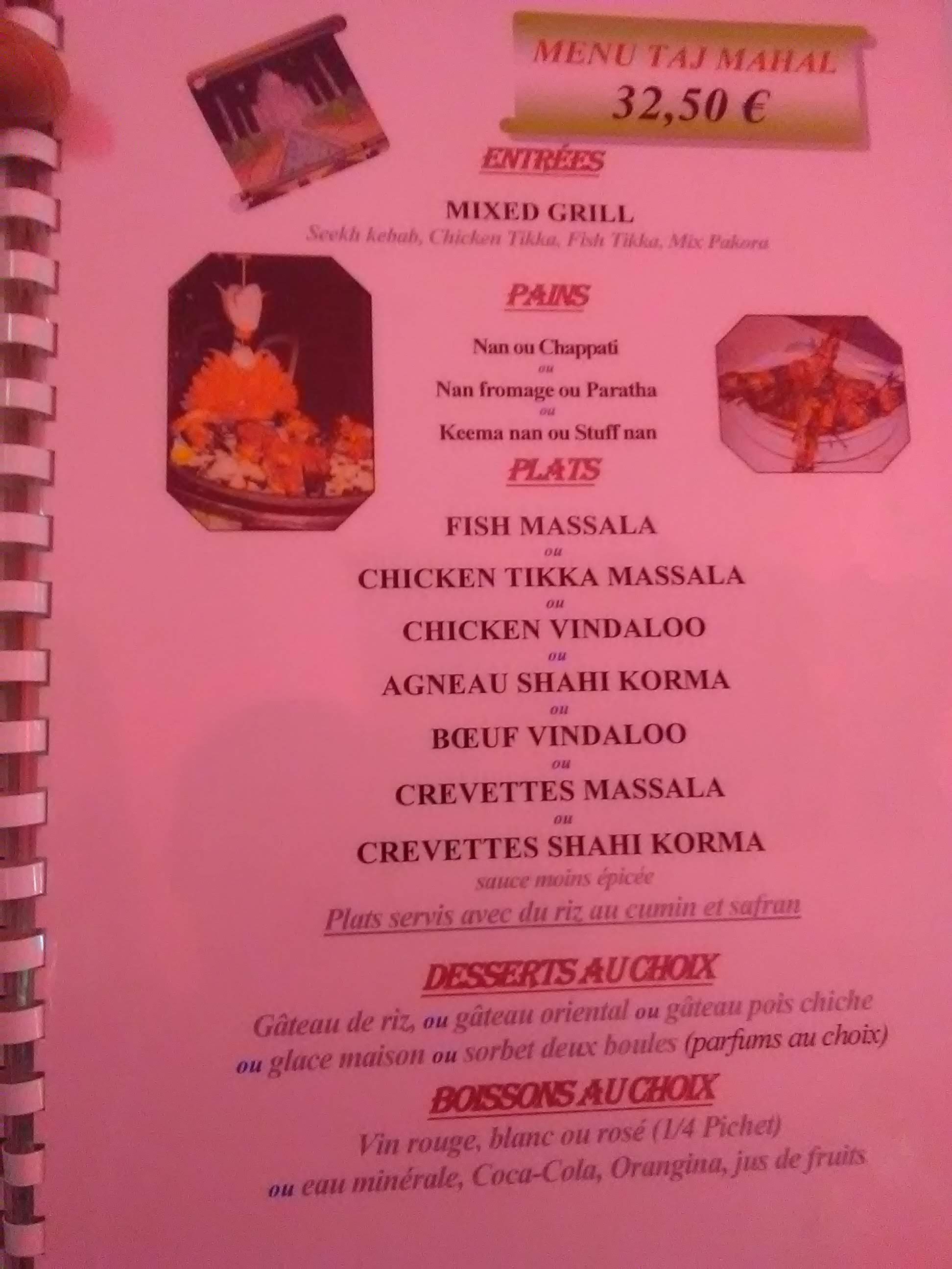 Le Taj Mahal est un restaurant indien. Vous avez une carte variée de plats typiques et originaux. Les plats sont servis en petites portions et vous avez la possibilité de multiplier les découvertes. Vous pouvez choisir des mets épicés et fort en gout . Vous avez une petite carte de vins mais on ne vient pas ici pour les boissons. Le service est correct La salle est spacieuse et climatisée. Des parkings sont à proximité.