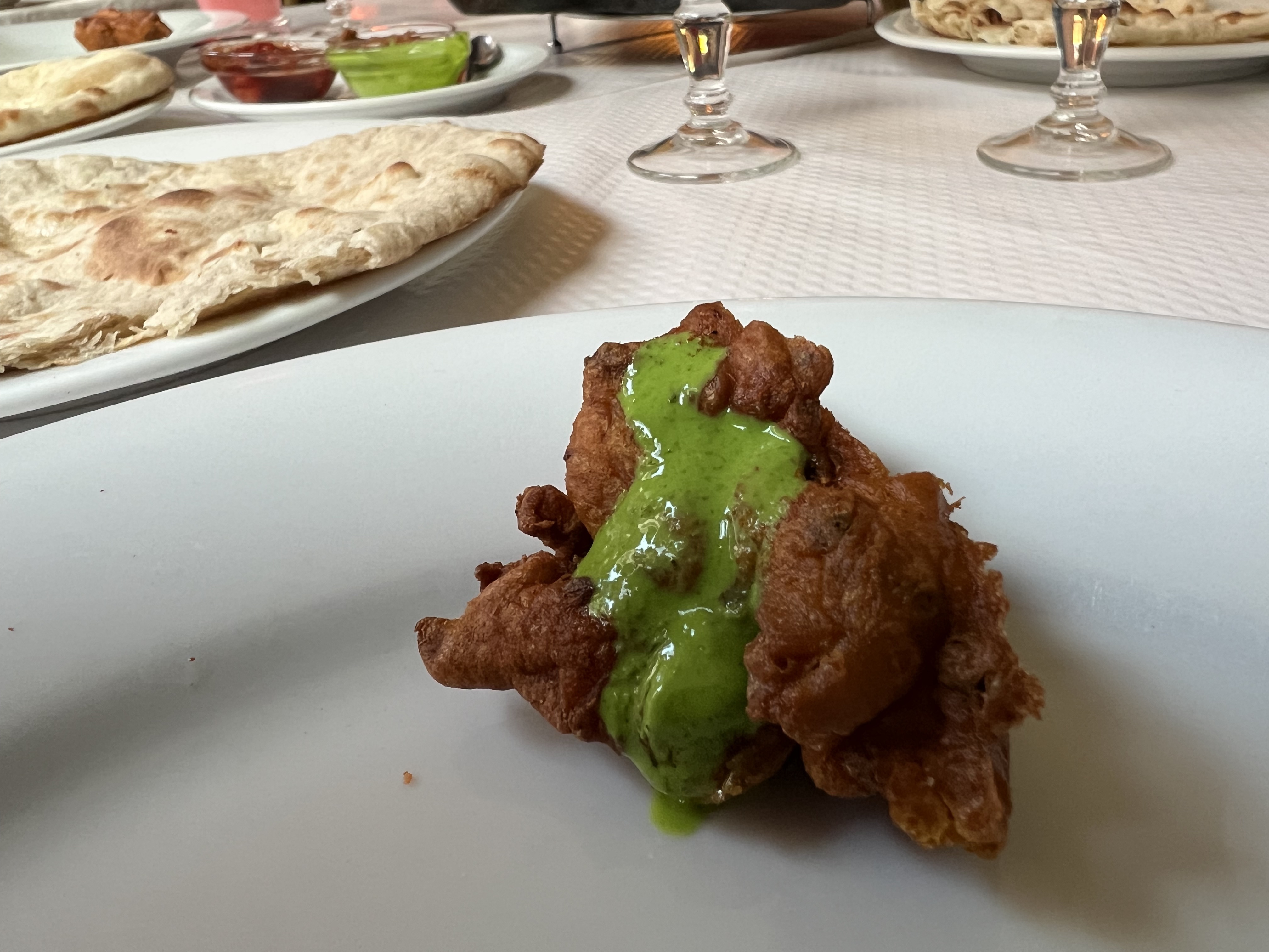 Nous avons goûté beaucoup de chocolat plats différents : crevettes, agneau, samoussas, dal. Tous étaient vraiment délicieux. Le personnel est très agréable et très prévenant. Un très bon moment.
