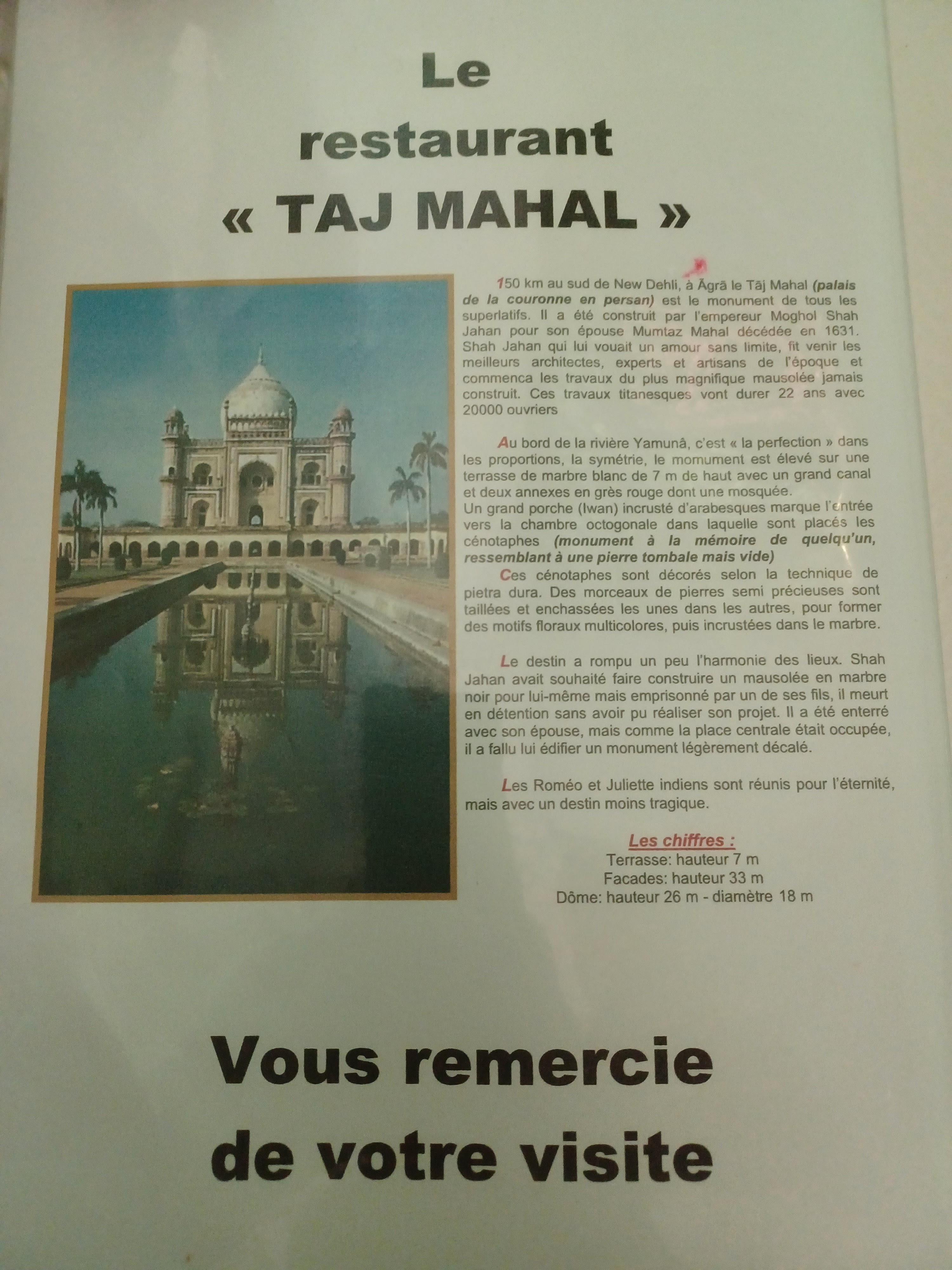 Manque de bons moments au taj mahal Je suis siham client de Restaurant Taj Mahal Tjrs je venir manger Et emporte à restaurant Taj Mahal serveur est très gentille rigolo discute bien respect bien et mignon dommage ça fait 1 ans lui travailler plus dans restaurant je demande 3 ou 4 fois à chef il a ou votre serveur chef ma dit lui partie vacance Lui à paris lui vien après sans serveur restaurant Taj Mahal mort