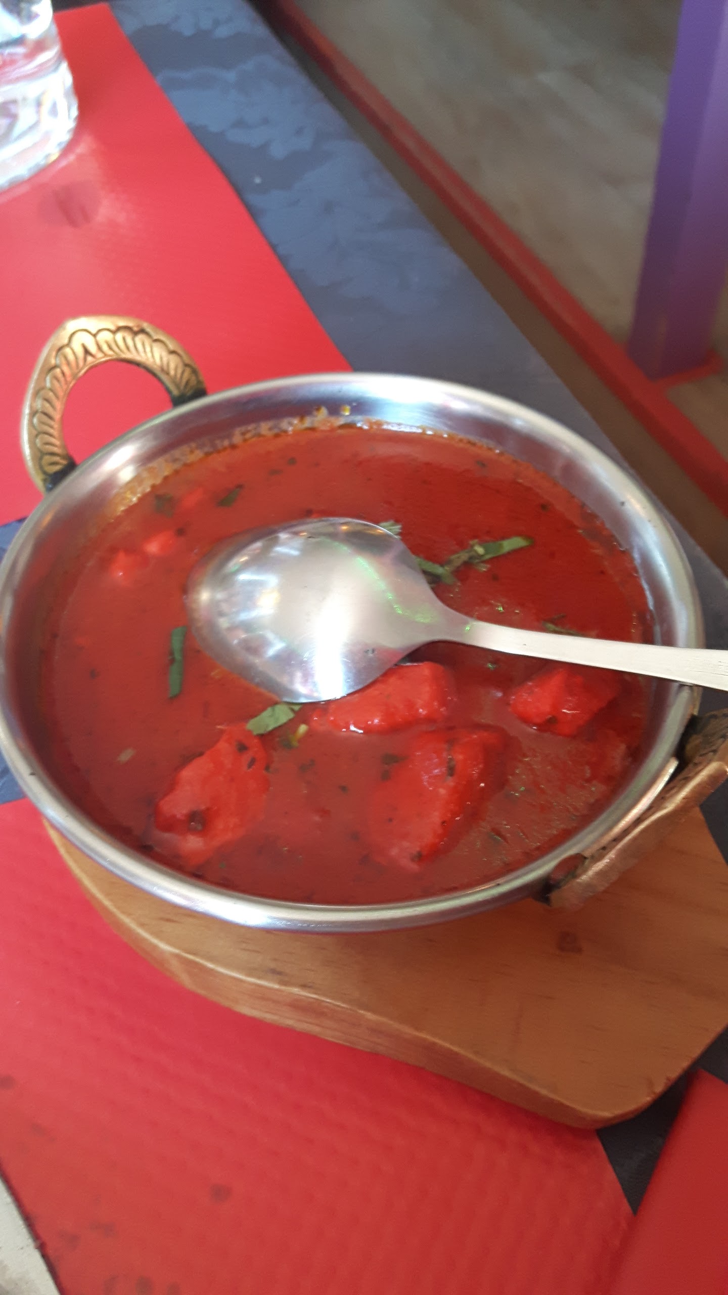Plat poulet tikka massala a emporté Très petite portion, j'avais toujours faim à la fin de mon repas !! La sauce été tellement salée que je ne sentais même pas le goût des épices ! Déçue de ce dîner !