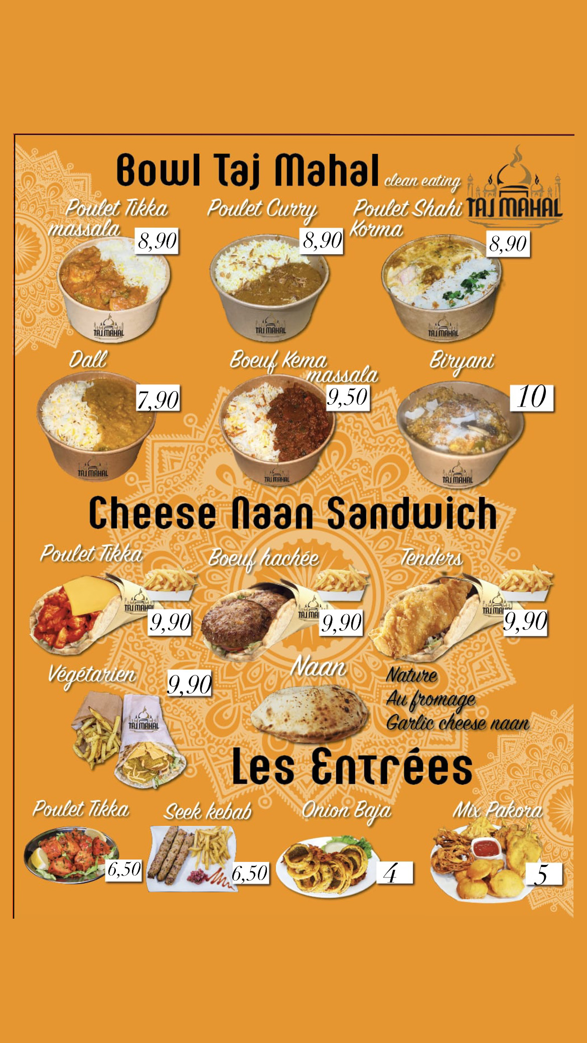 Endroit incroyable. Les sandwichs sont comme le Frankie en Inde mais avec du naan. Surtout le fromage nan est très délicieux. Le meilleur naan que vous puissiez déguster ici est le naan Taj Mahal, spécialité de ce restaurant. Vous pouvez également manger du poulet au curry, du poulet masala, des crevettes korma et d'autres biryanis. Dans l’ensemble, je leur donne 5 étoiles car leur goût alimentaire ressemble plus à la vraie Inde qu’aux restaurants indiens français typiques. En disant cordialement, veuillez visiter au moins une fois. Vous adorerez la nourriture et deviendrez également fan de ce restaurant.