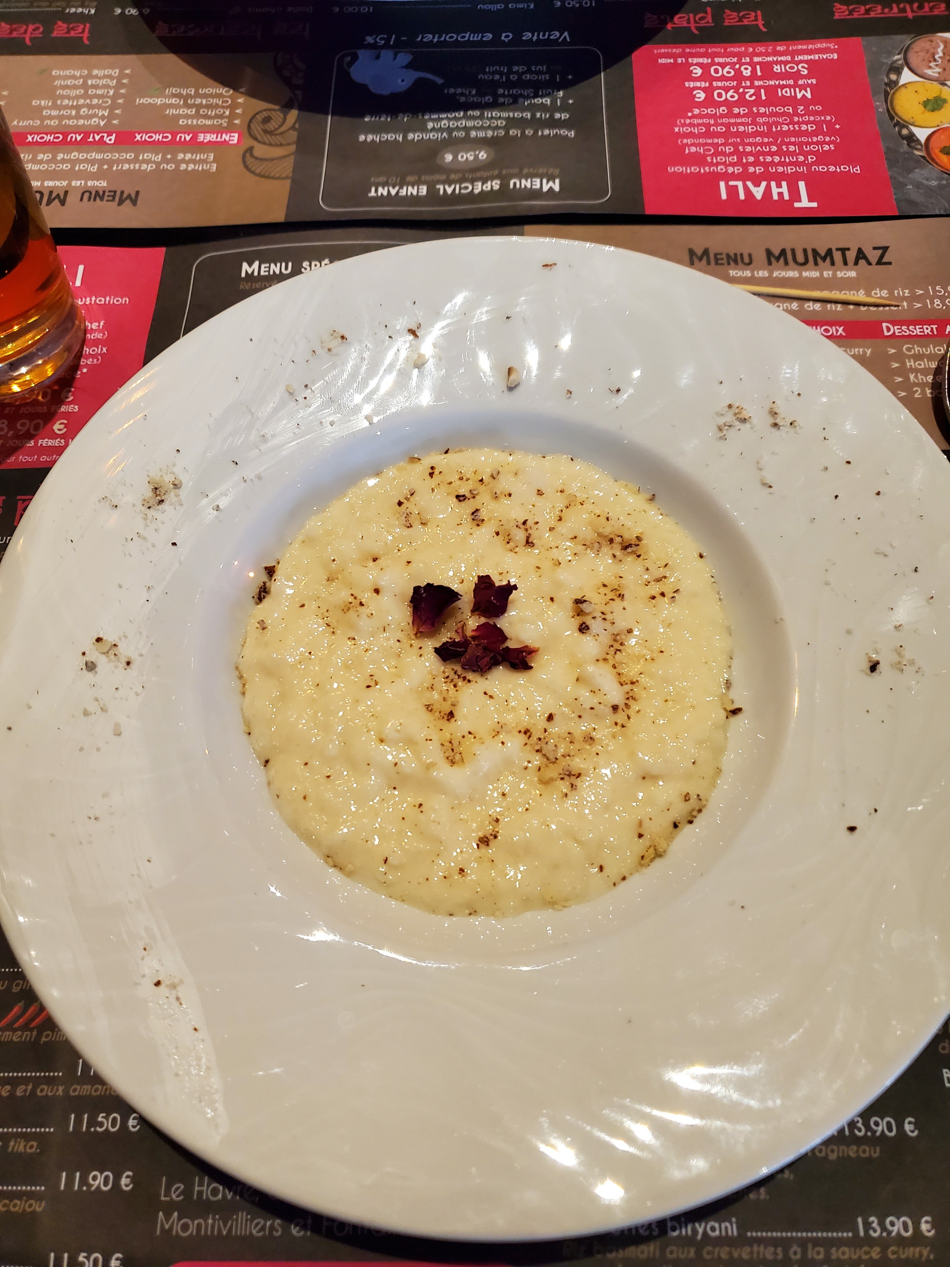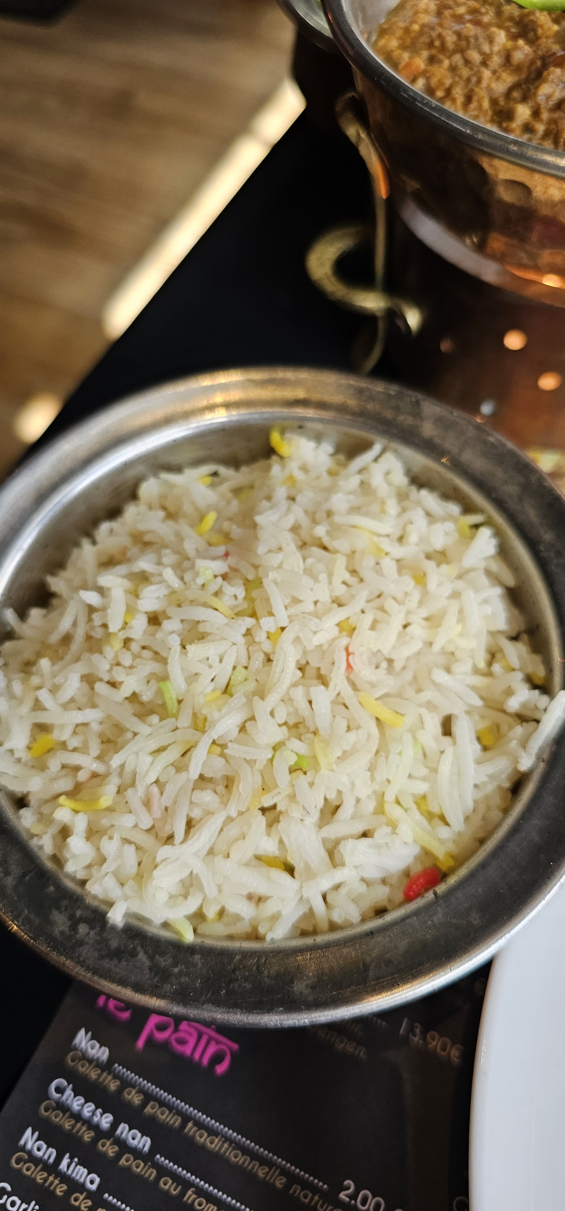 Avec une note de 4,5 sur 5 sur Google, je m'attendais à un resto au top. Quelle déception. Le seul point positif est le service : les serveuses sont d'une gentillesse appréciable. Pour le reste, les photos parlent d'elles-mêmes. Nous avons pris 2 menus Thali et en supplément 2 nans, une bouteille de vin indien et deux bières indiennes comme apéritifs. Le vin est excellent, une perle rare. Mais il ne suffit pas à rattraper la très mauvaise qualité du menu... Les nans baignent dans l'huile : voyez sur la 3e photo. L'huile de friture doit être changée d'urgence quand on voit la couleur des fritures. Sur les photos 1 et 2, voyez ce qu'on nous a servi. Je n'ai pas pour habitude de gâcher et de laisser dans mon assiette, mais là c'était vraiment immangeable ! L'espèce de truc rond que vous voyez à gauche de la première photo était tellement dur que je n'ai pas pu croquer ! Archi cuit 😥 Sur la deuxième photo, impossible de reconnaître ce que l'on mange tellement c'était gras, trop cuit et dur. Le dessert était bon. Mais 81 euros pour deux personnes pour simplement 1/2 bouteille de vin et deux desserts, c'est bien trop cher payé. À éviter absolument sauf si vous aimez l'huile, et les aliments archi cuits dans une mauvaise huile.