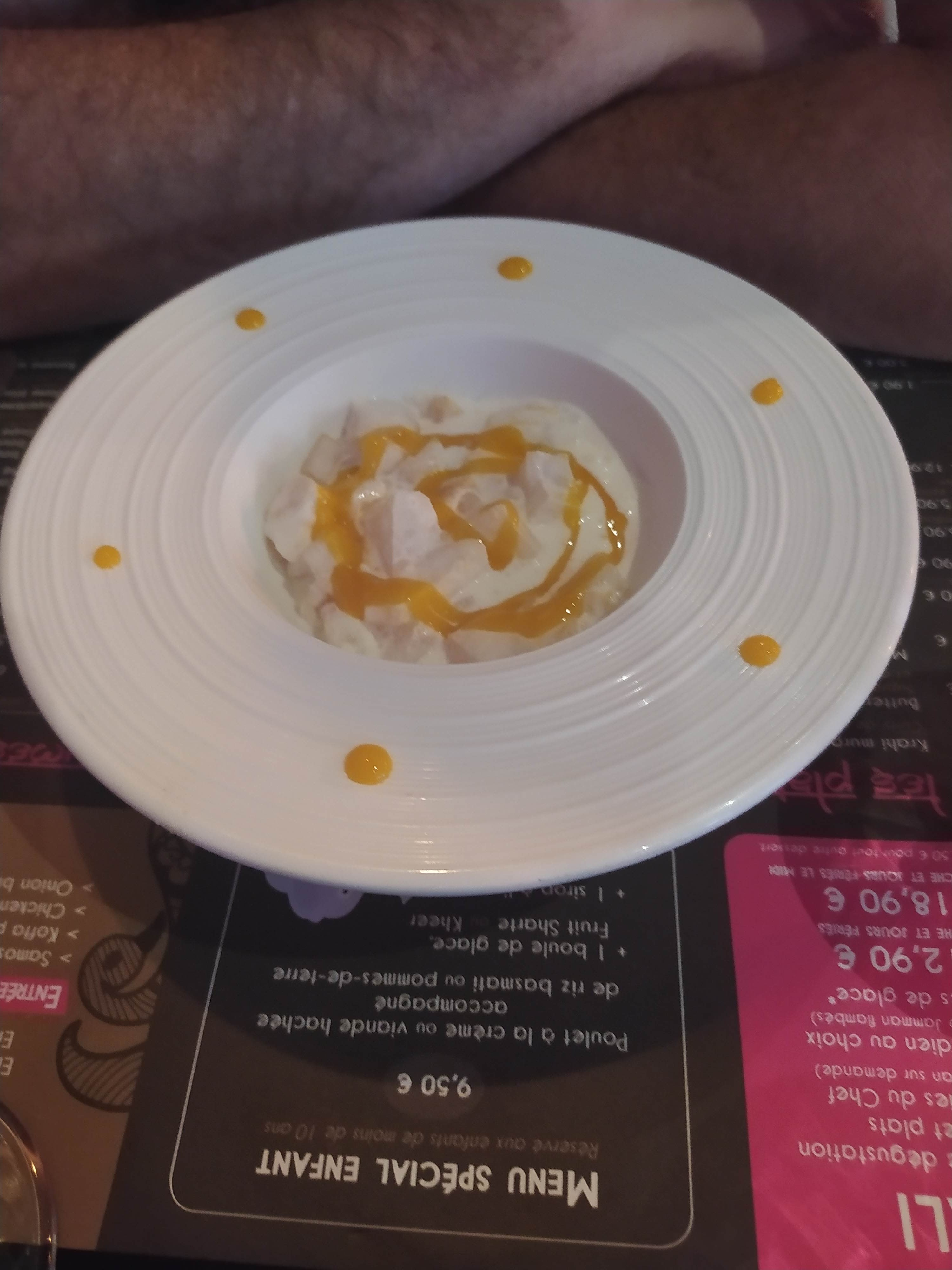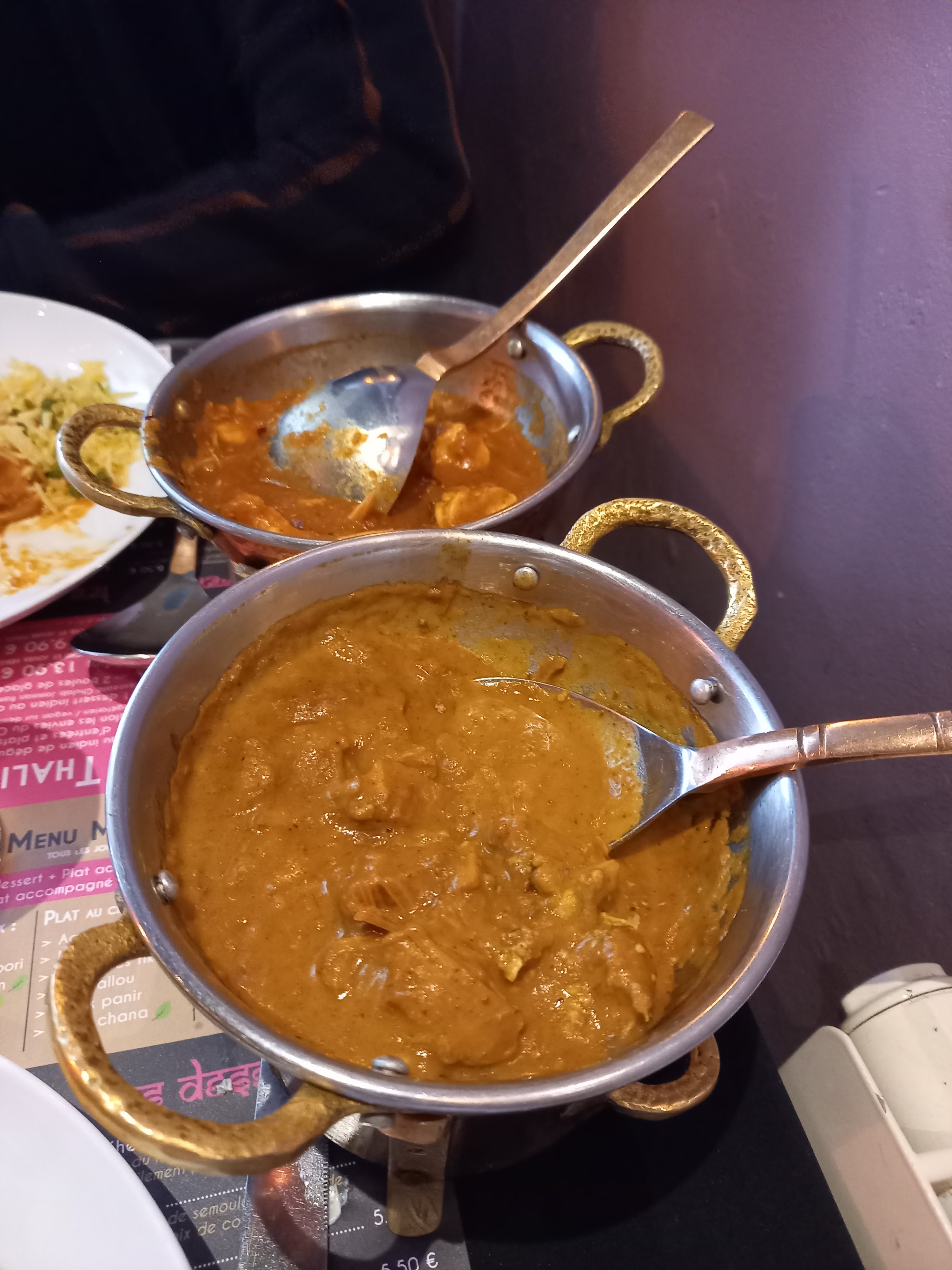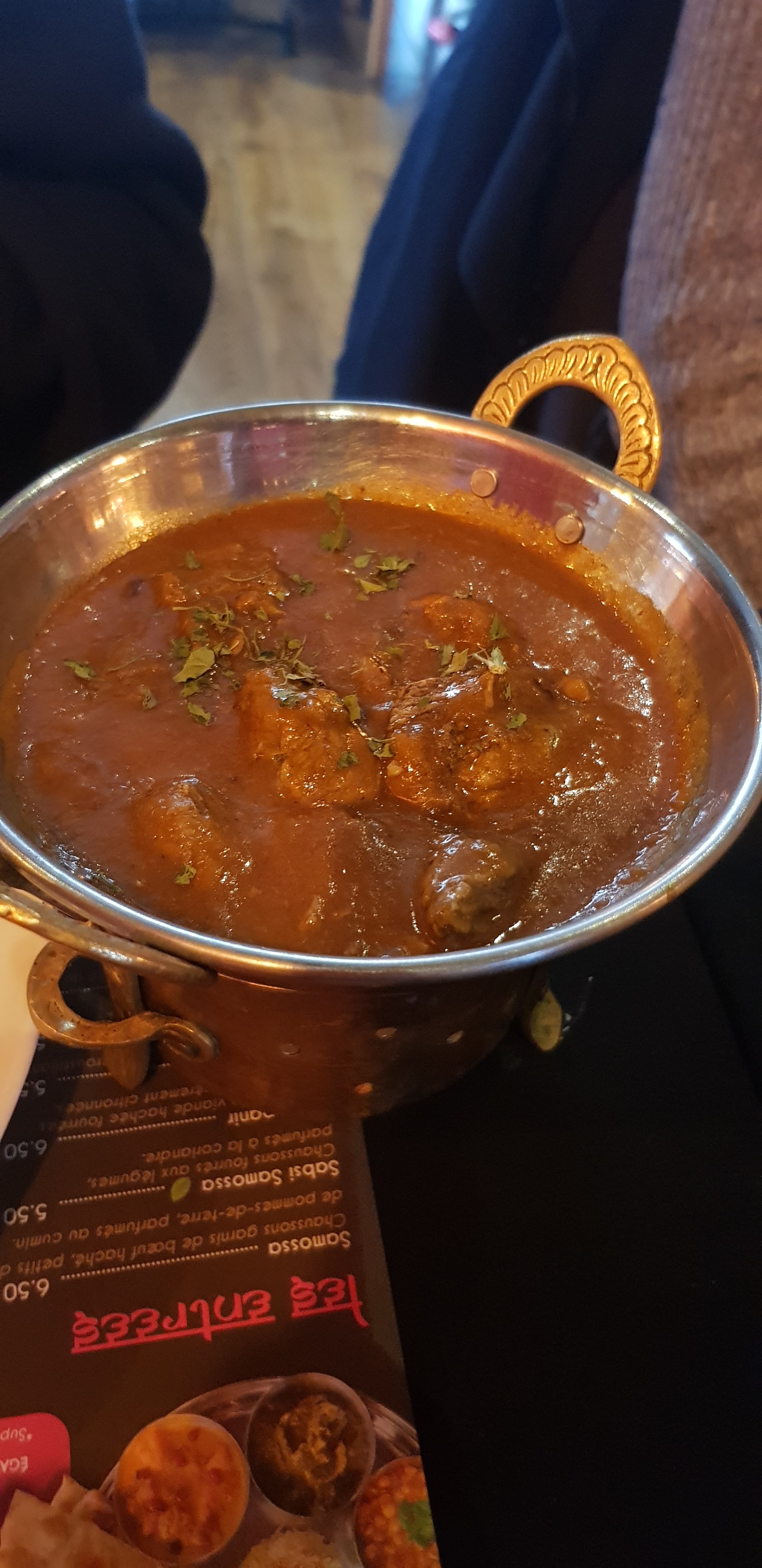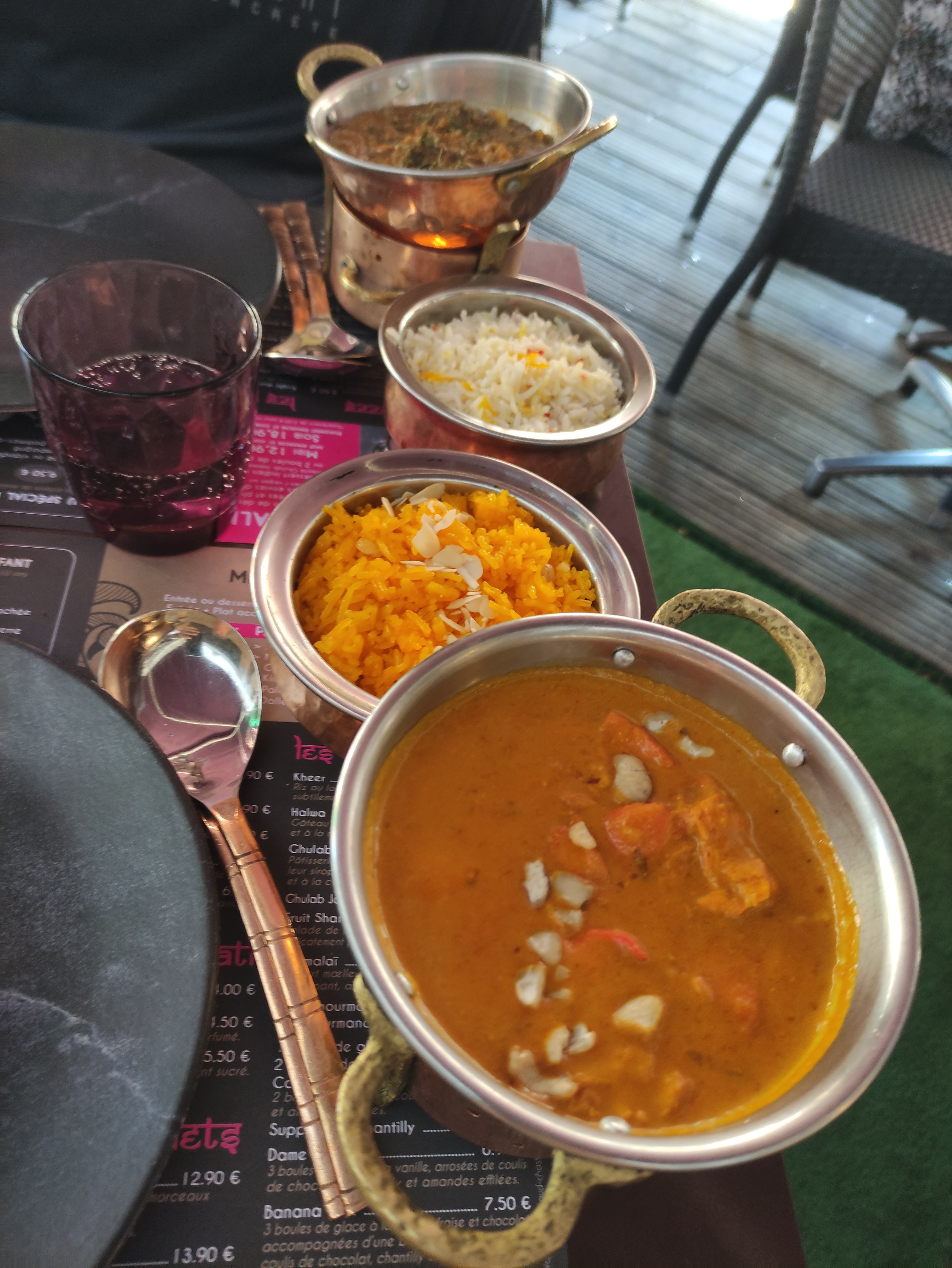 Accueil souriant et très aimable par la serveuse très gentille. Cadre agréable. Samoussa et plat poulet korma (photo 1) savoureux mais petite déception pour le plat complet servi en bloc, relevé (pimenté) alors que ce n'était pas précisé sur le menu et que j'avais bien demandé avant de le choisir. Sauce d'accompagnement à base de concombres tout mous et ensemble trop pimenté (photo 2).