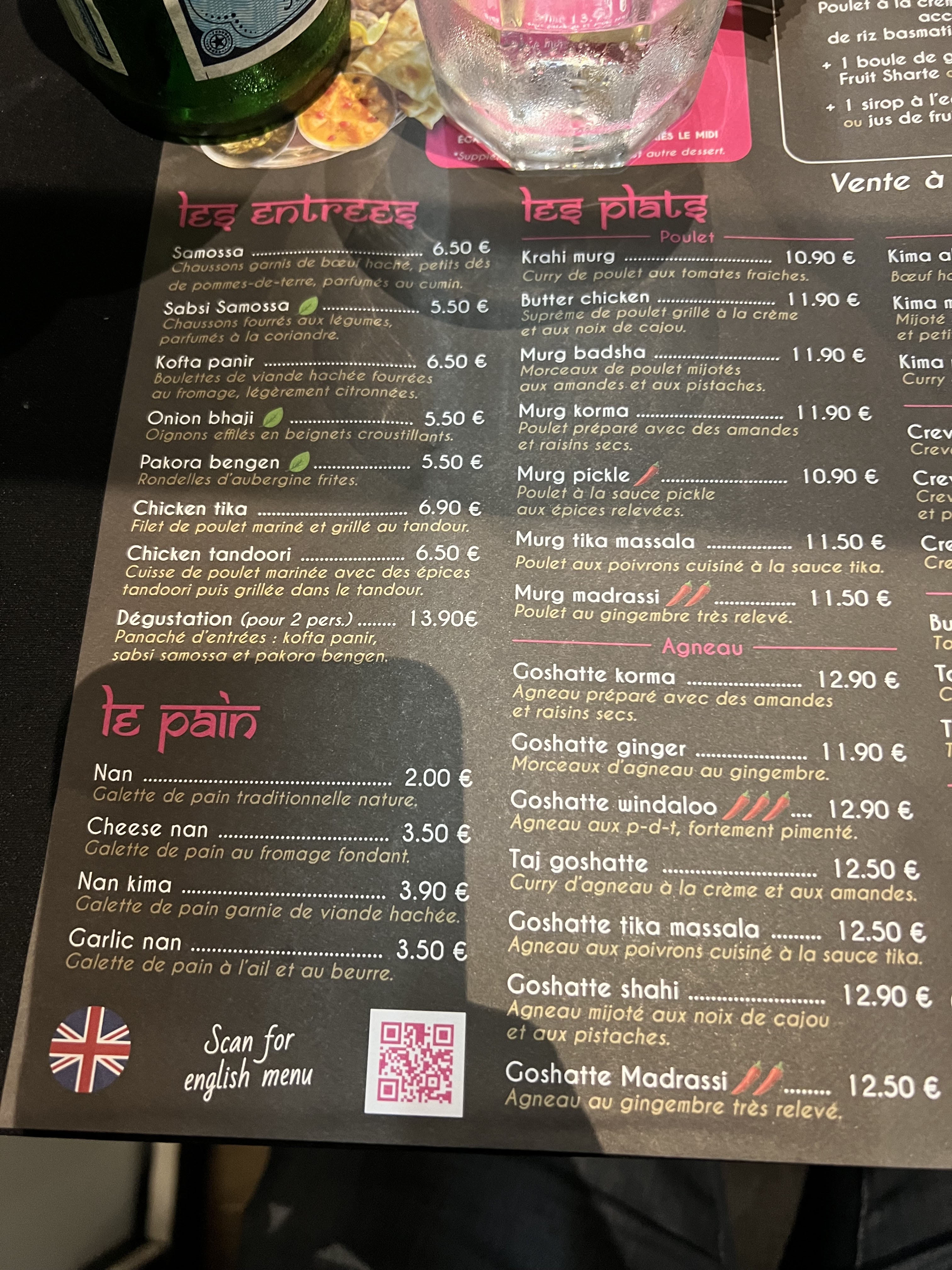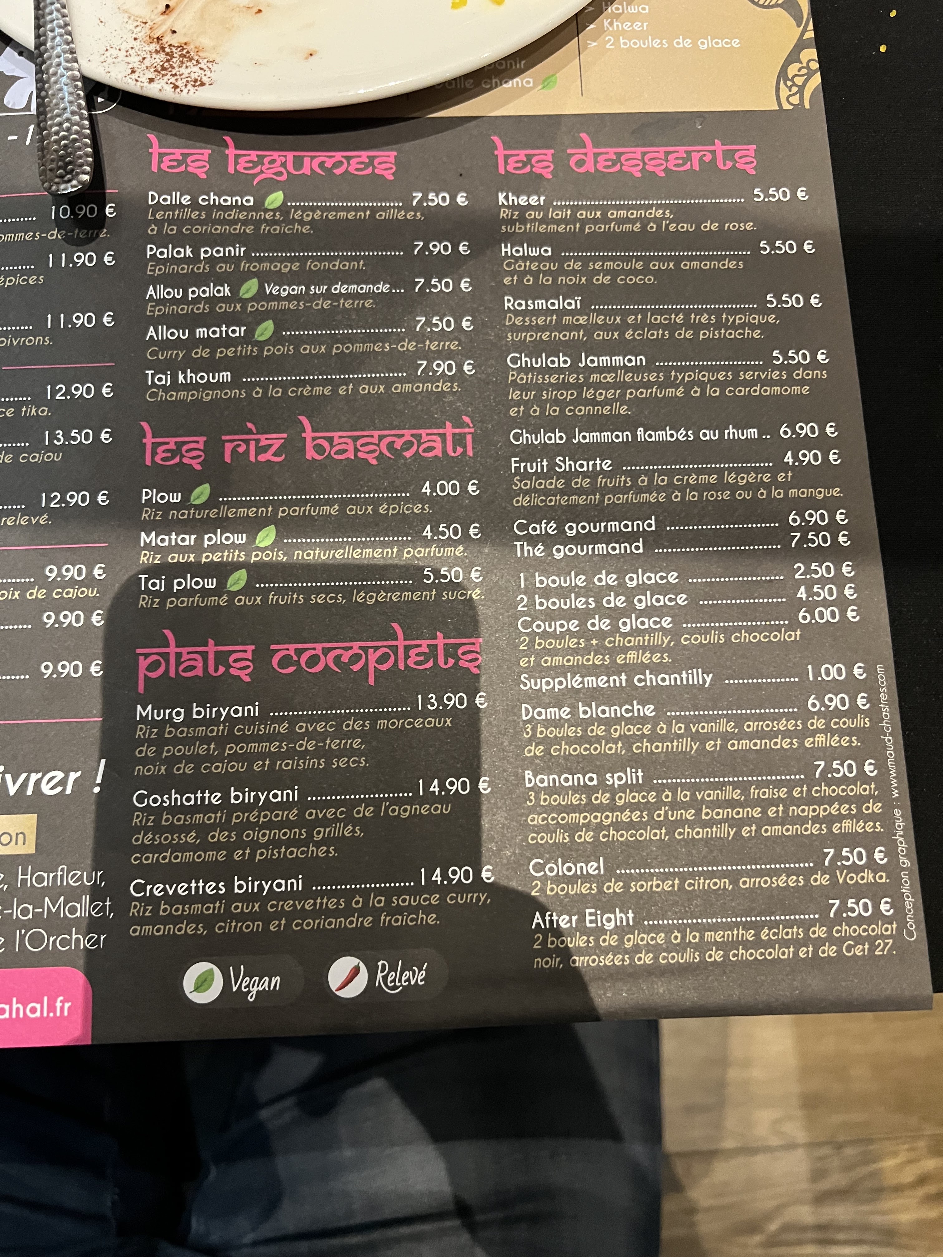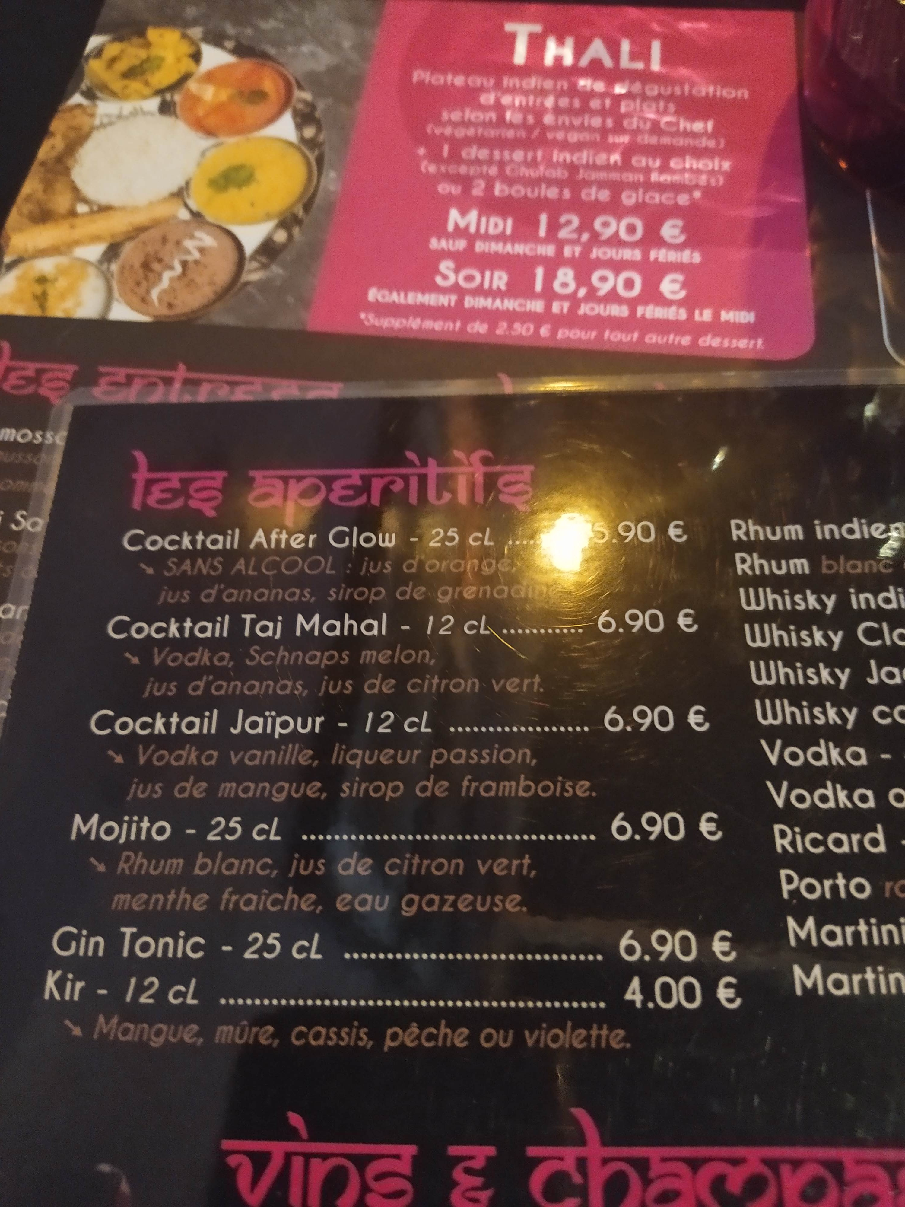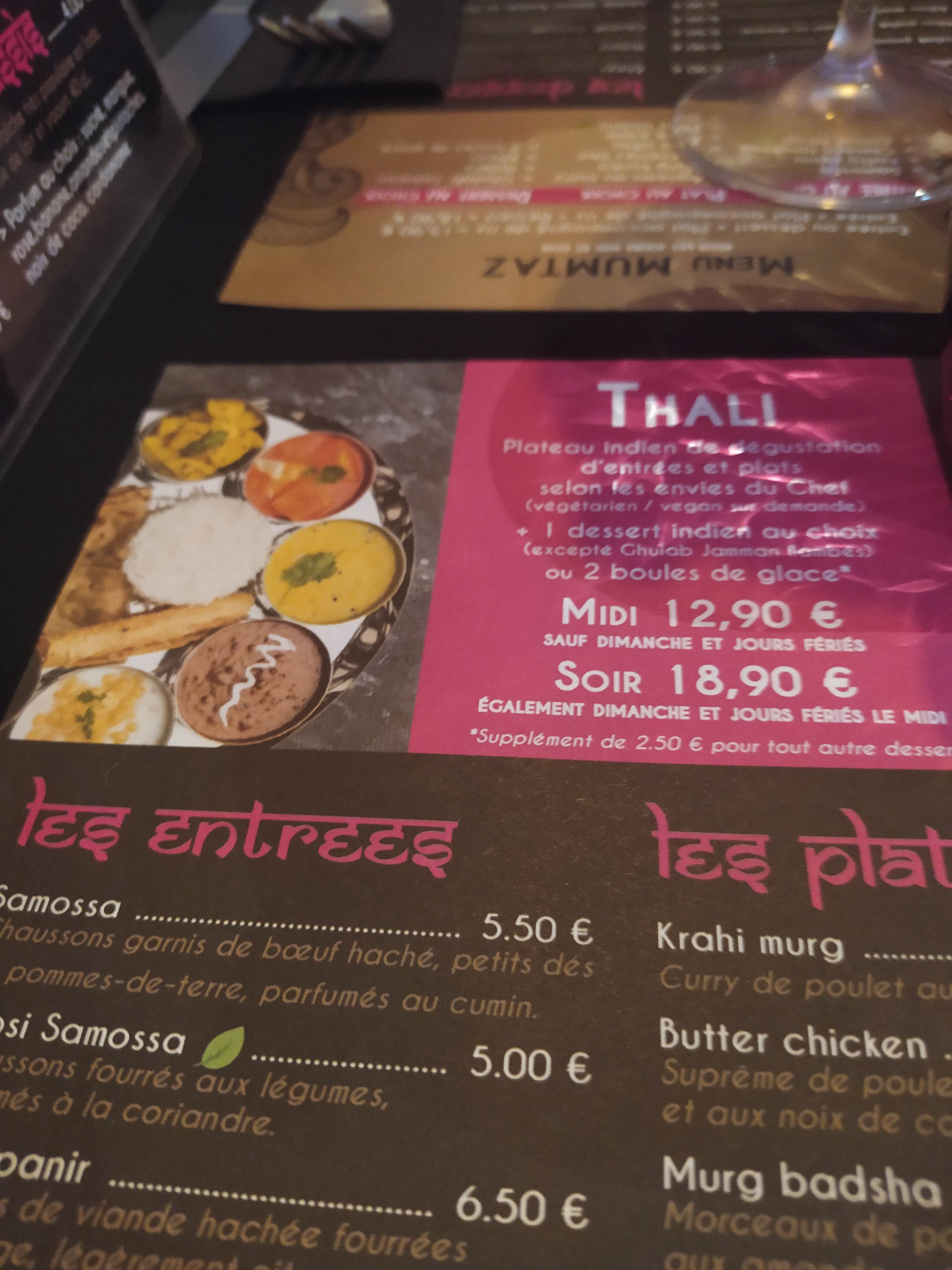 Le repas était bon, et le service bien également. Attention cependant : le menu Mumtaz entrée+plat avec les 2 options végé (Palak Panir et Dalle Chana) est PLUS CHER que si vous les choisissez à la carte (même si vous rajoutez du riz) de 2€50 !! Aussi, au moment de régler on s'est rendus compte que 2 des 3 menus mumtaz entrée+plat étaient au prix du entrée+plat+dessert avec marqué aucun dessert.. Après débat, on a payé 10€ moins cher que ce qui était marqué sur l'addition ! Vérifiez vos additions !