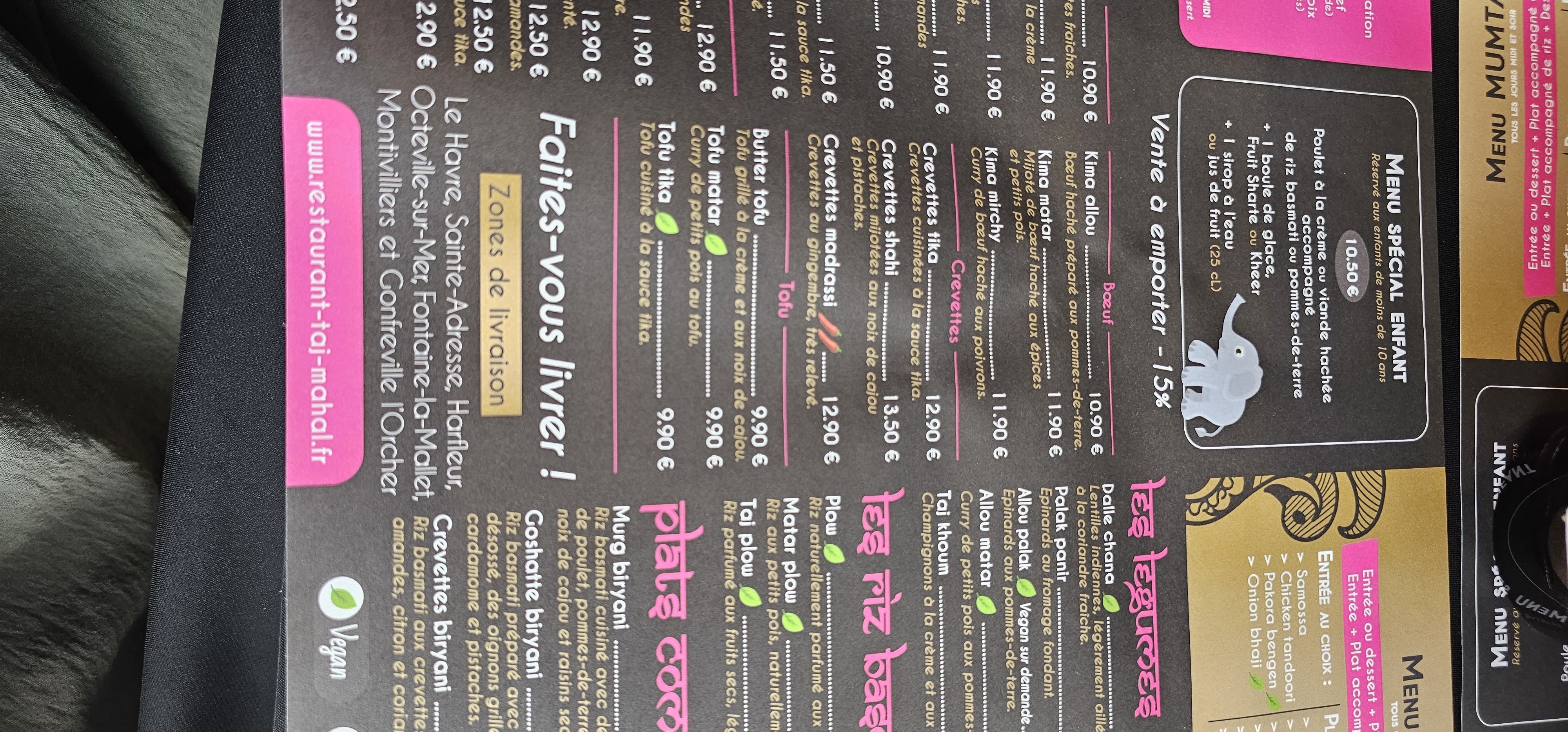Le Taj Mahal est le restaurant préféré de ma femme et moi. Dès que nous avons l'occasion nous y allons ou prenons a emporter... Personnel agréable, souriant et repas délicieux et copieux. Depuis quelques mois je prends en livraison et c'est toujours aussi délicieux. On peut pas mettre plus que 5 étoiles ? Ne changer rien!! Merci pour vos petites attentions 😊
