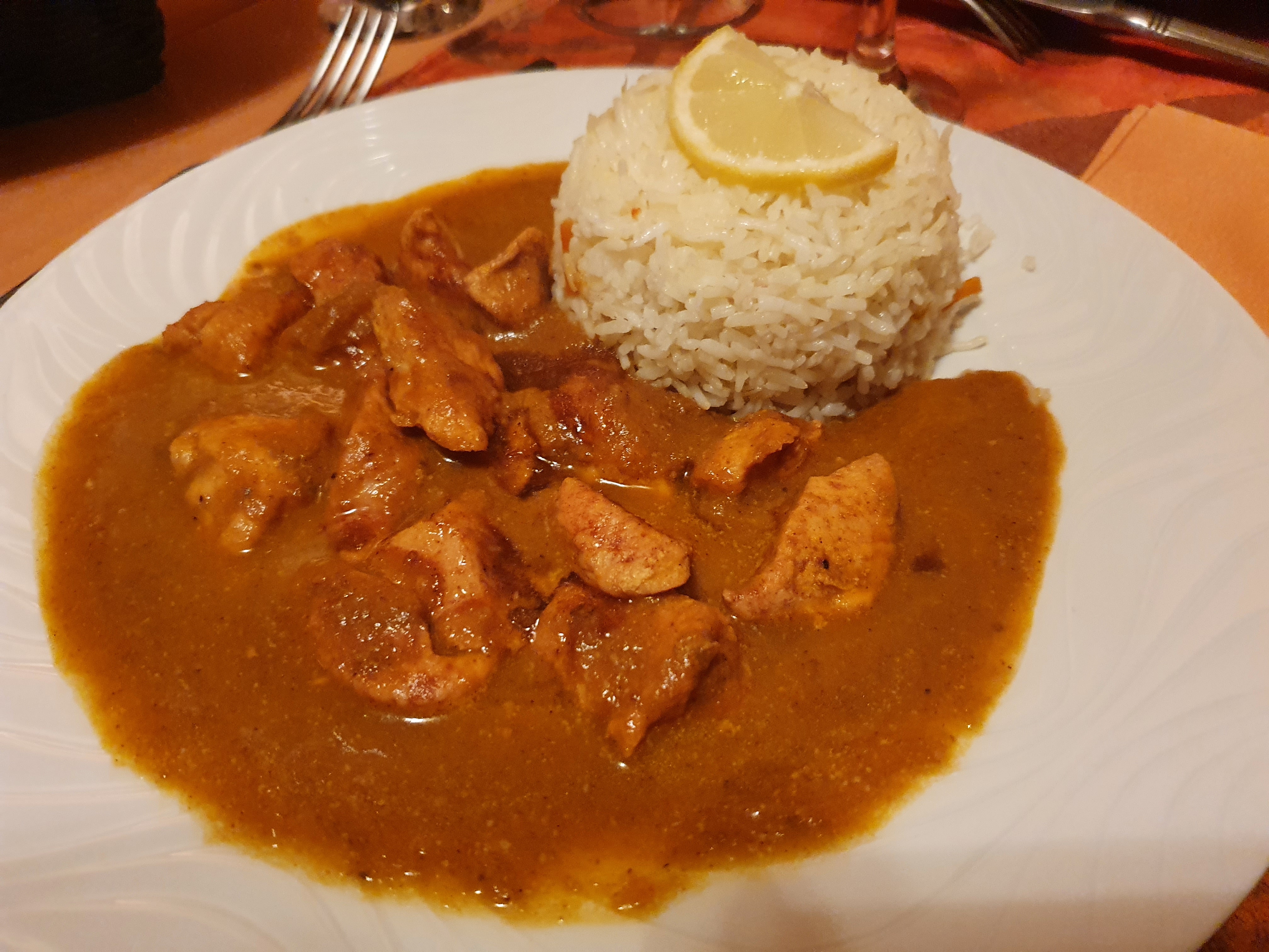 Déçu pas bon du tout. La sauce hyper liquide et le poulet très sec. On a l impression que c est de la veille et réchauffer. Dommage !! Par contre les naans étaient bon et chaud.