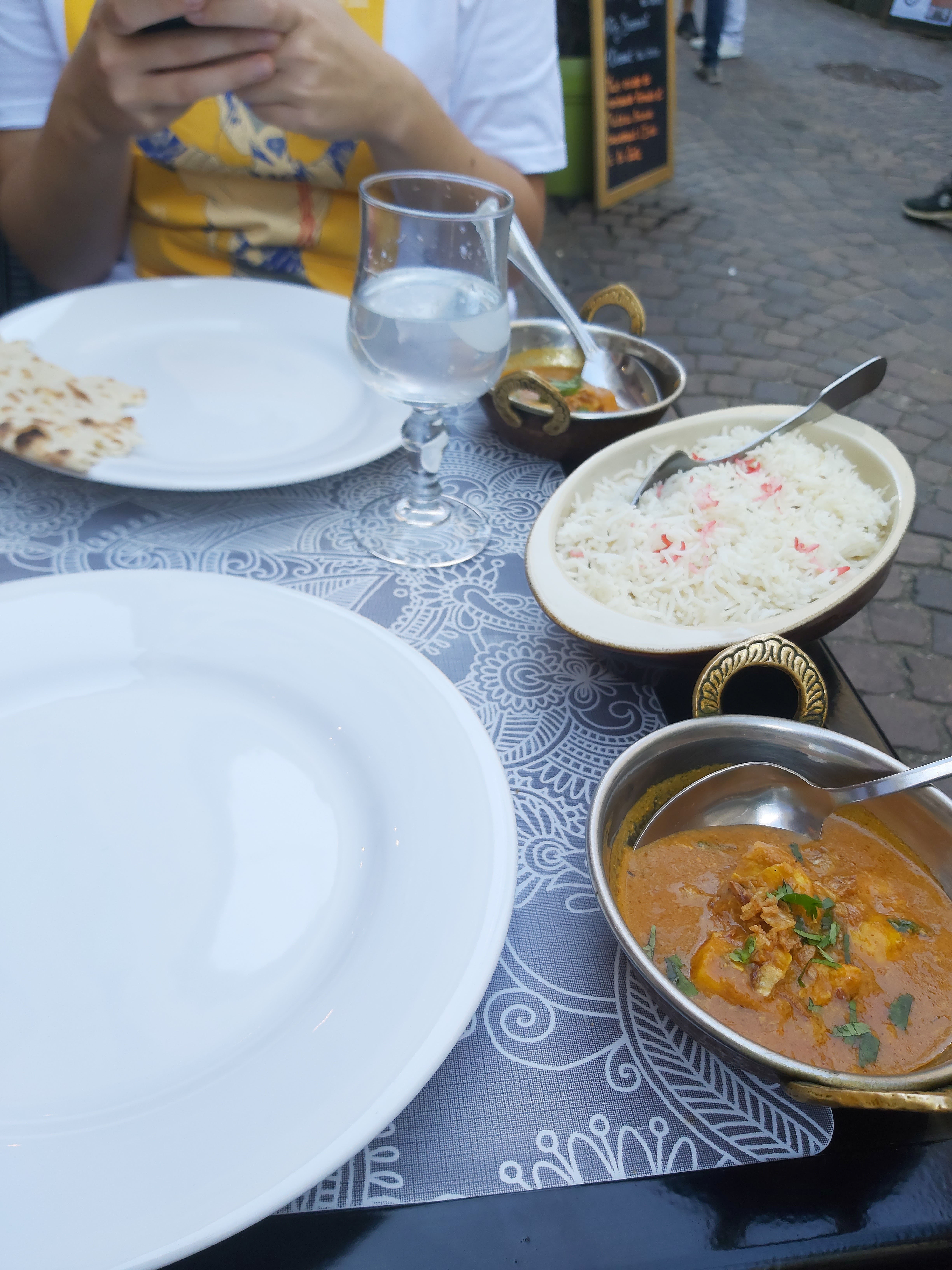 Bon restaurant indien avec terrasse dans une rue piétonne animée. Bonne cuisine.