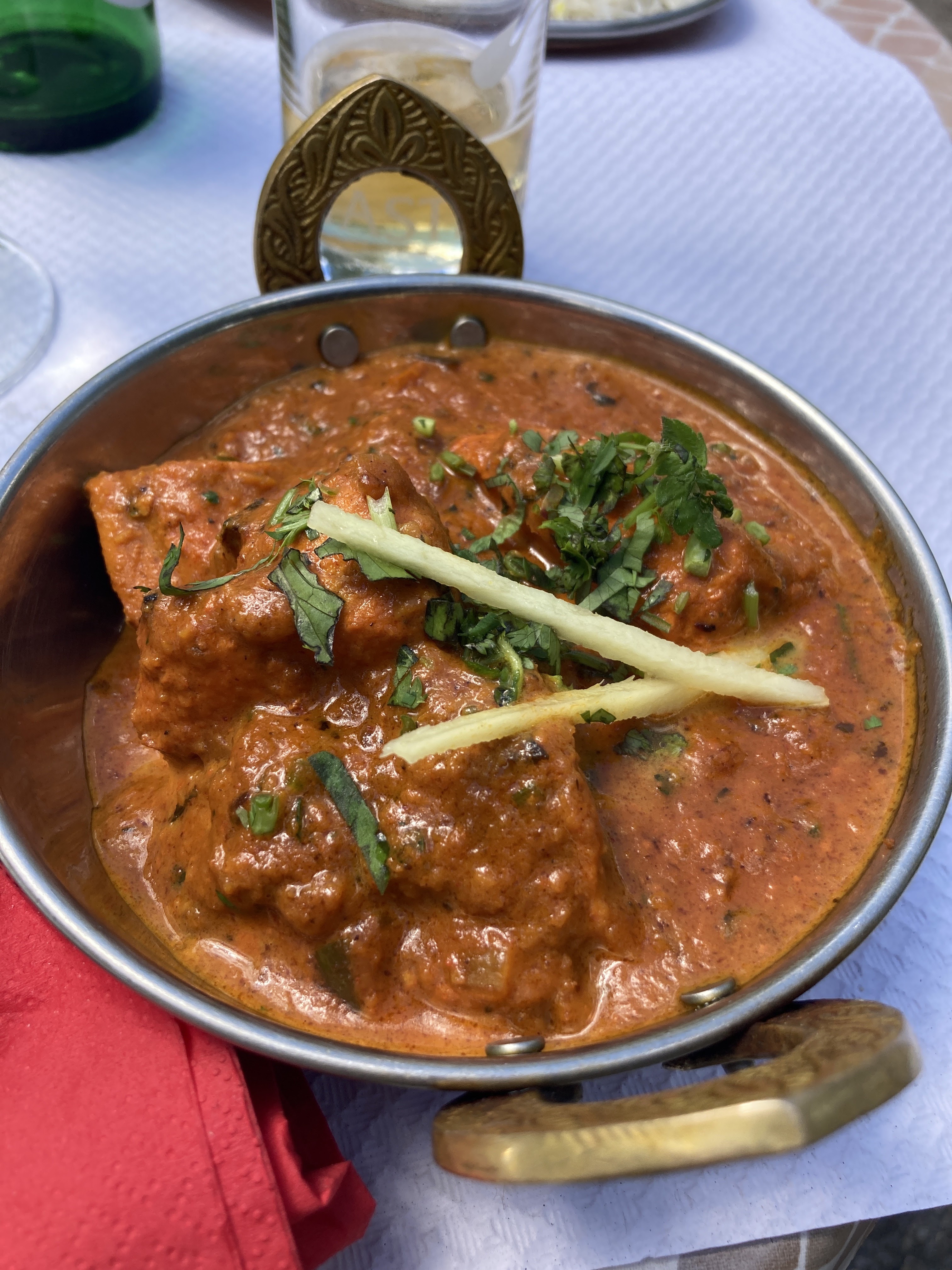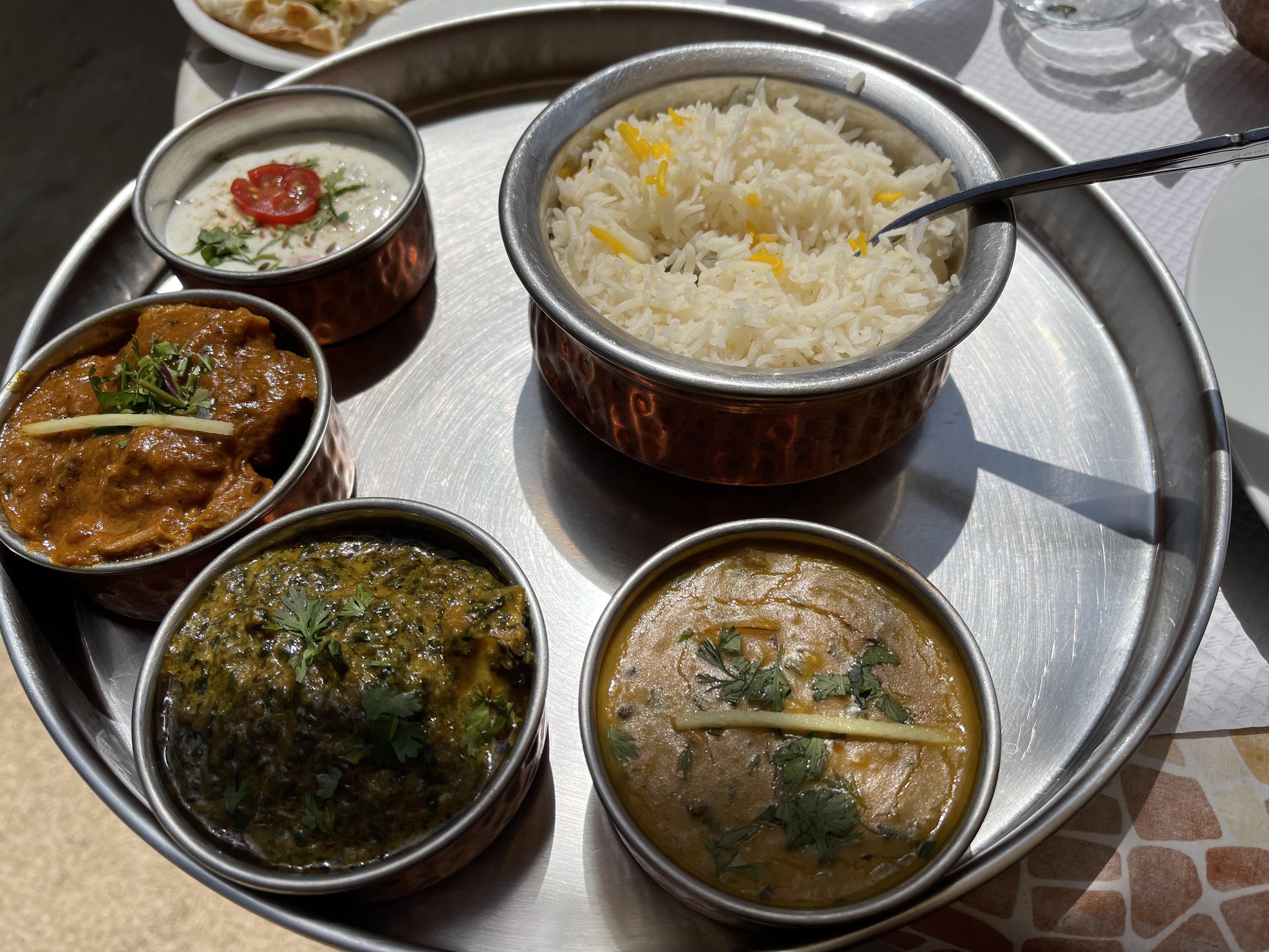 Très bon déjeuner ici sur la terrasse sous le soleil, avec une sympathique connaissance. Nous avons pris le menu du déjeuner et avons ajouté un naan à la bière et au fromage. La salade d'entrée n'était pas vraiment savoureuse - optez pour le samosa. Beaucoup mieux. Mais je recommande quand même vivement ce restaurant car le reste était excellent !