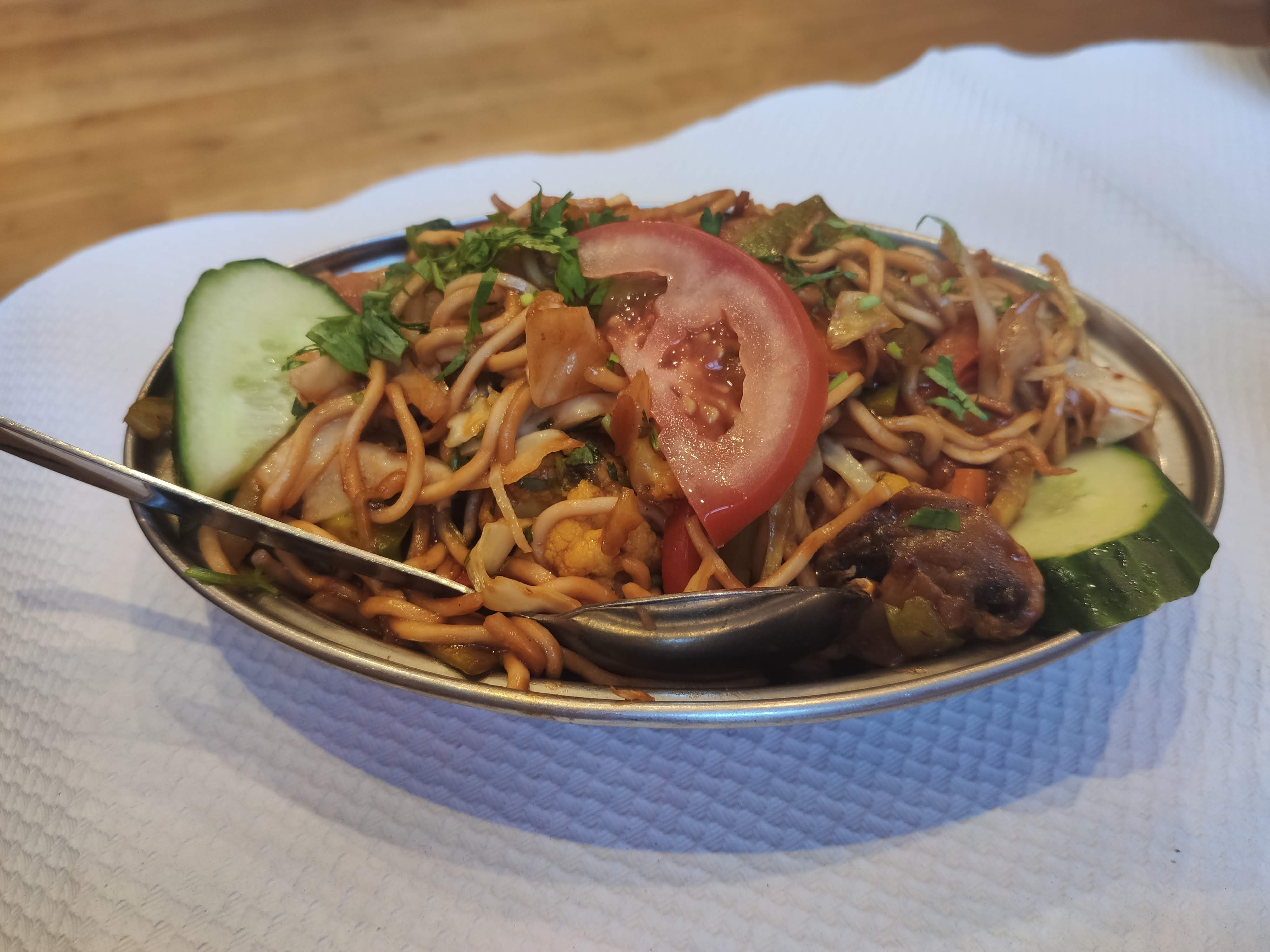 N'ayant que très rarement mangé indien, je ne suis peut-être pas la plus objective, mais j'ai trouvé le repas délicieux. Dès l'apéritif nous a été proposé un trio de sauces avec une grande chips épicée à partager (je ne connais pas le nom). Excellent ! J'ai opté en entrée pour une Multagni Soupe à 6€ (soupe de lentilles). En plat, j'ai choisi des nouilles sautées aux légumes frais aux épices : Shivapuri Yogi Chaw Chaw à 12€. Un repas copieux et délicieux, bourré de saveurs. Un super accueil, une terrasse sympa pour l'été et un service irréprochable. Allez-y les yeux fermés. Petit bonus : le restaurant propose aussi un service à emporter.