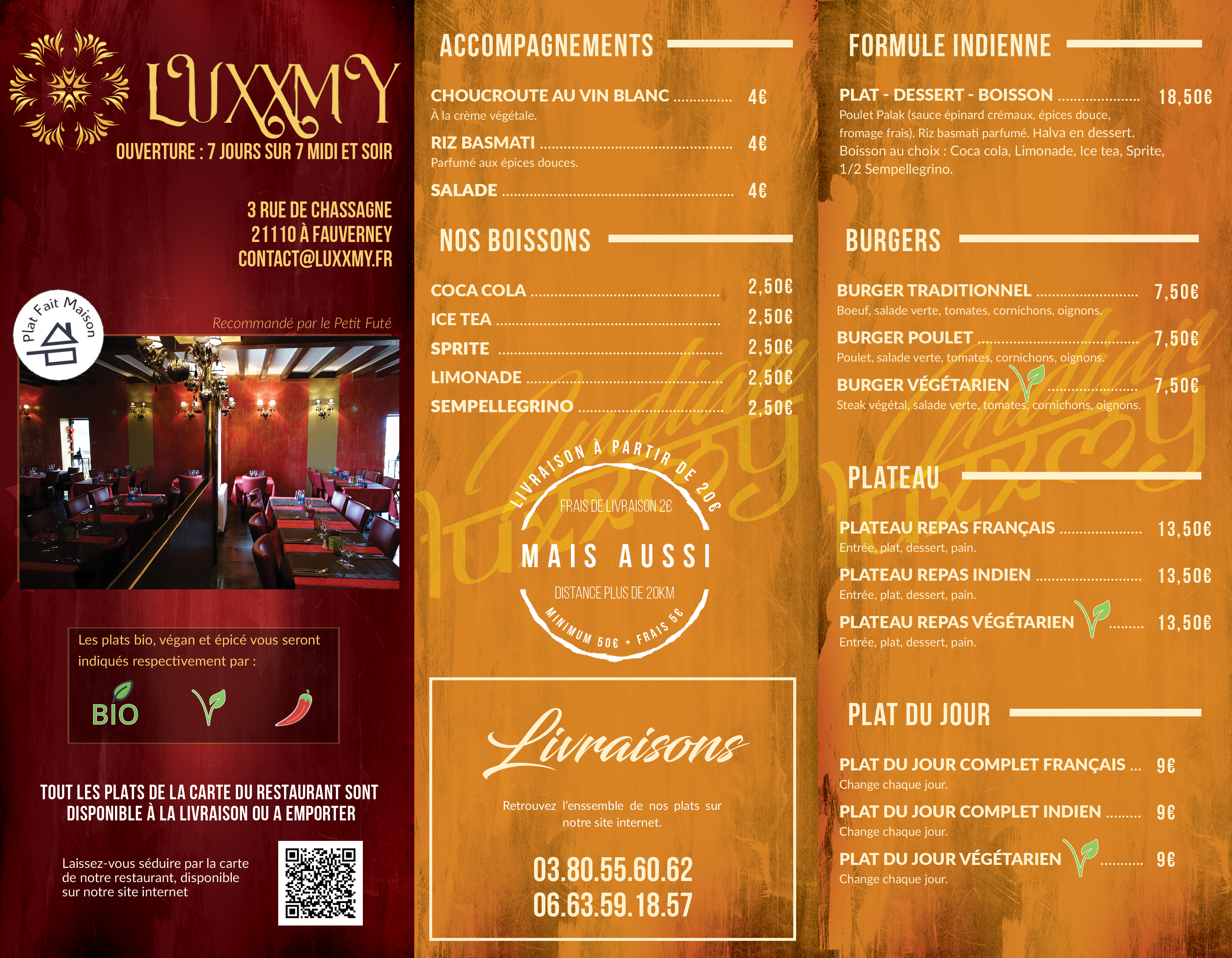 nous avons commandé à emporter samedi 28 mai, pour un repas entre amis. Une honte, naan fromage froide et sans fromage. La gérante a oublié des éléments sur notre commande et n’a pas voulus nous livrer, alors que nous somme à 1km du restaurant. Franchement très déçu, nous avons l’habitude de commander sur Dijon. Très mauvaise expérience au fauvernay surtout pour les prix pratiqués Passer votre chemin