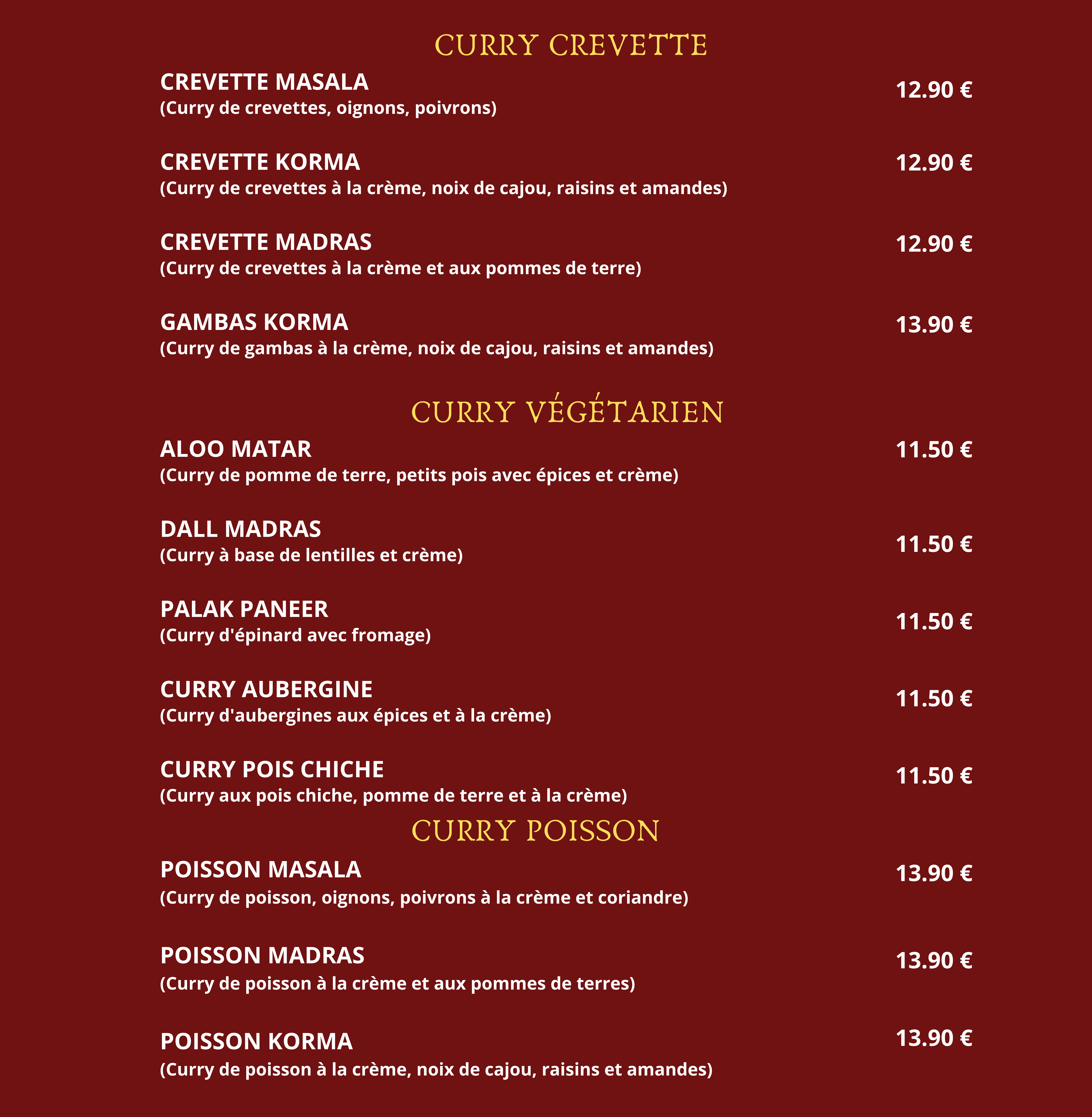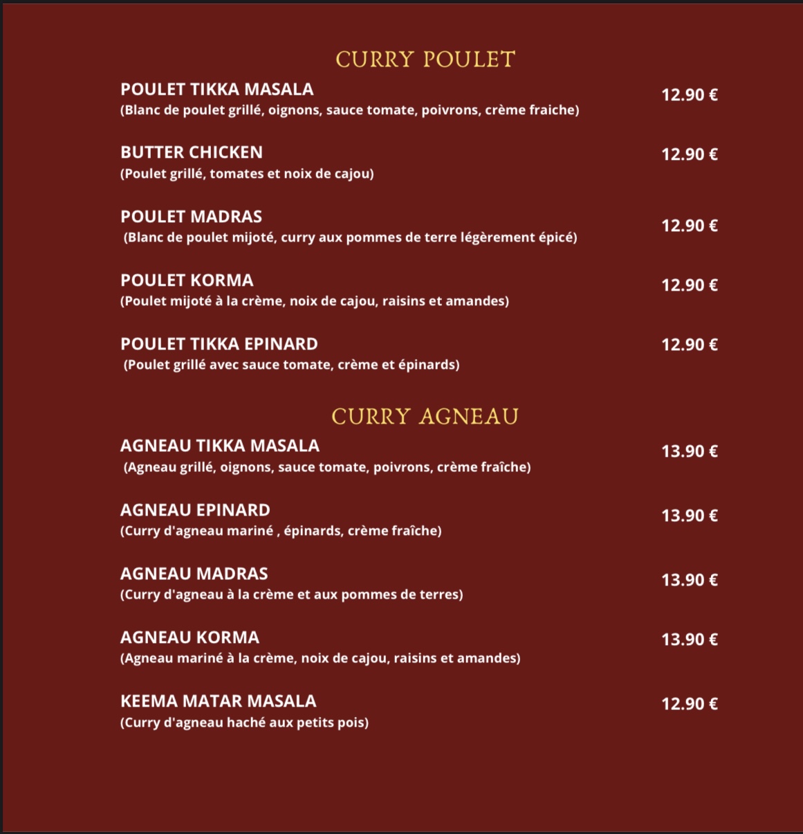 Le Poulet tika massala et madras sont vraiment excellent, je recommande !