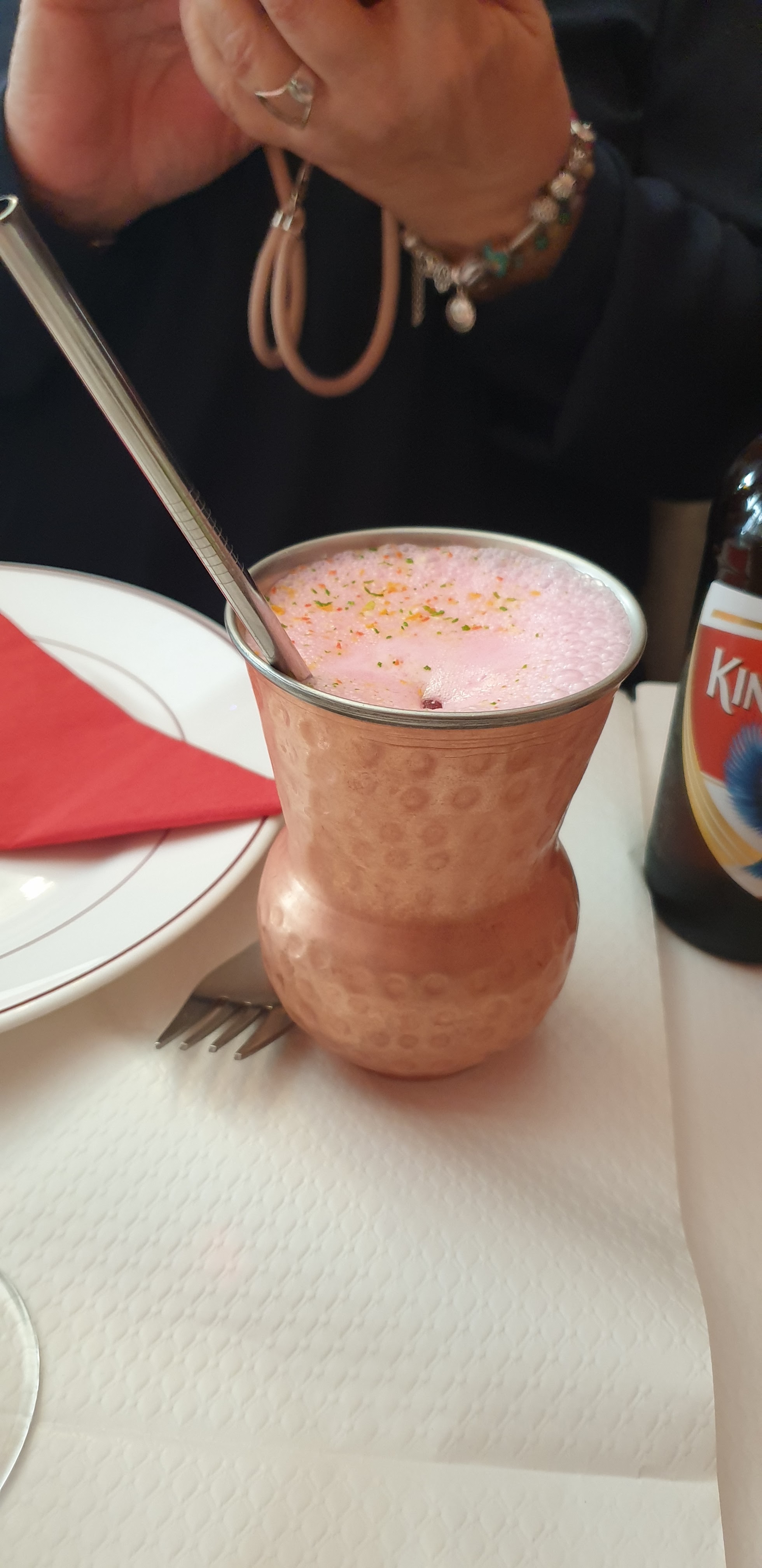 Je déteste le dire, mais je ne peux pas être d'accord avec les nombreuses très bonnes critiques ici... Positif : Le pappadam (gratuit) avec les trois très bonnes sauces. Et le choix inhabituellement large de lassis, dont « Rose » et « Banane ». Négatif : Il y avait vraiment une TRÈS grande quantité d'ail sur le Garlic-Nan - trop de bonne chose pour moi. La « salade verte à la sauce indienne » était plutôt sans sauce (sauf les quartiers de citron qui l'accompagnaient). Le saumon mariné venait de sortir, dommage. Le poulet vindaloo a été assaisonné avec précaution… pas d'explosion de saveur. Le service était sympathique mais pas très attentionné. Les déplacements sont commandés (et coûtent) en supplément. Une carafe d'eau est gratuite.