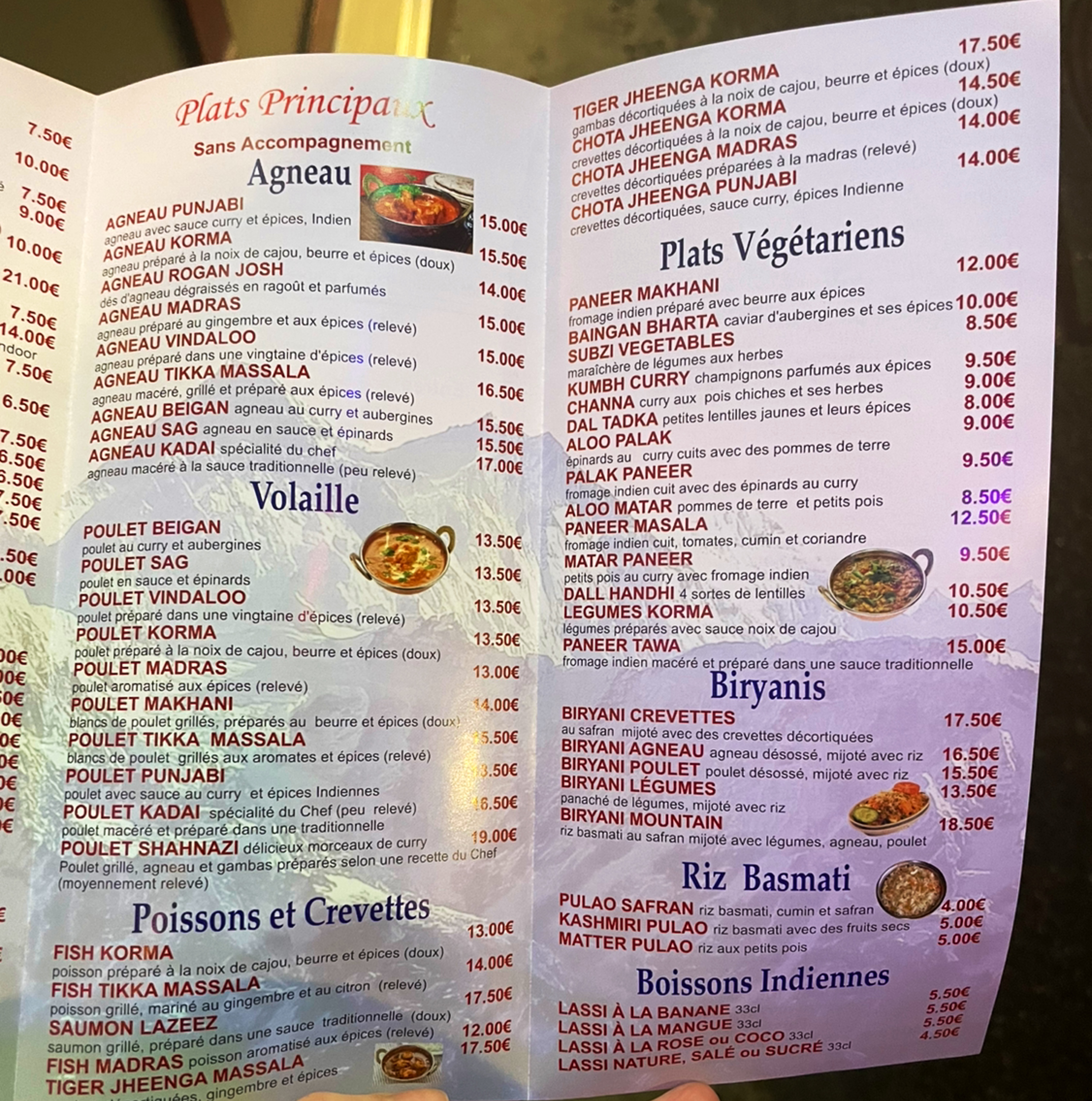 J'ai eu le repas Delhi à prix fixe pour 17,50 € avec poulet Tandoori, curry d'agneau, naan au fromage et fruits frais en dessert. Le poulet Tandoori était excellent. J'habitais à Delhi et il est difficile de trouver du bon poulet Tandoori à l'étranger, mais celui-ci s'en est approché.