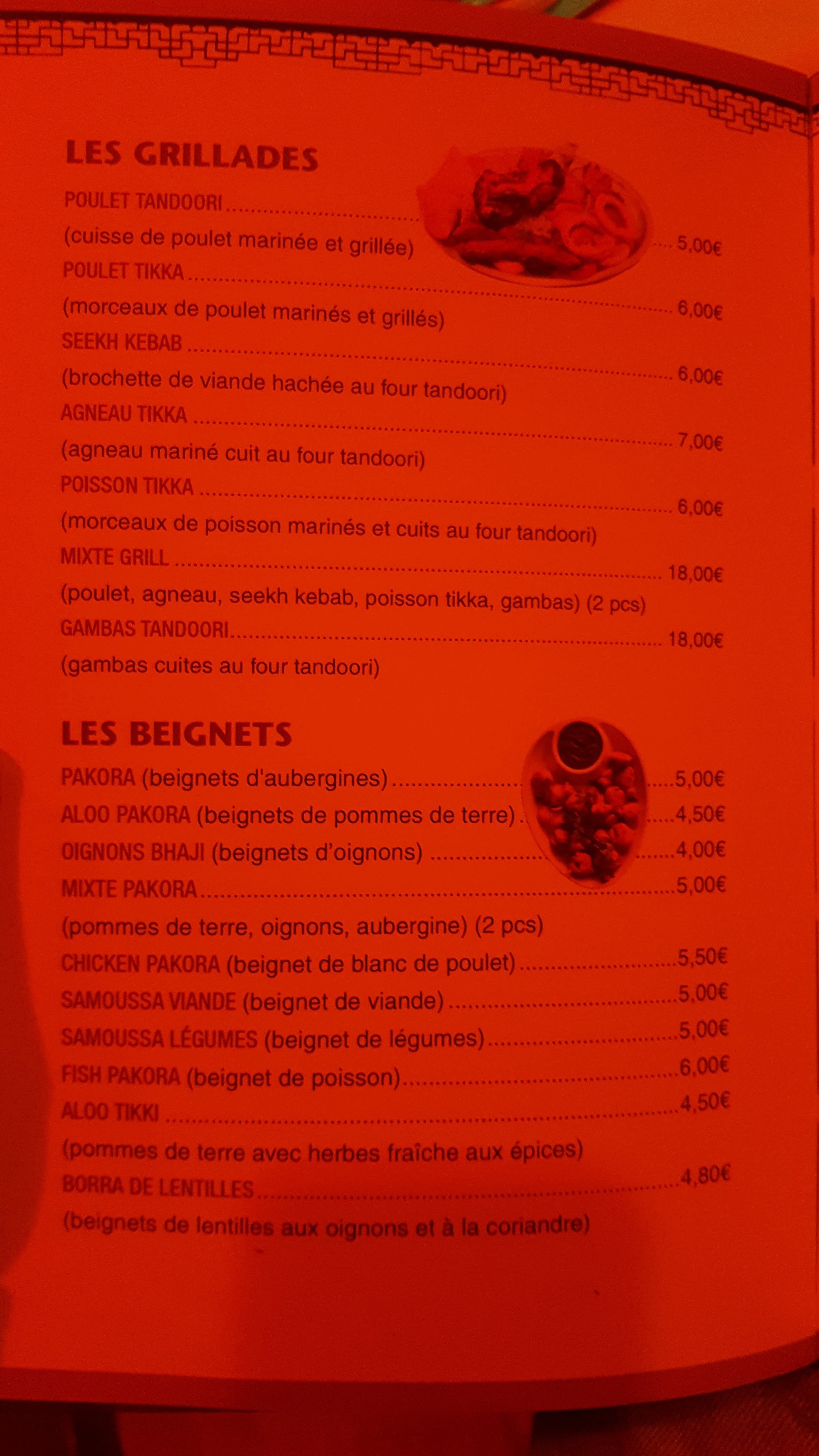 immangeable. On vient de commander pour 50 € à 2. D'abord, leur menu couple sur leur brochure promet un dessert (pour le prix et les quantités, ce n'est pas du luxe) et quand on a voulu choisir, ils ont refusé en assurant que le dessert ne faisait pas partie du menu couple (pensez donc à le retirer de la carte, ça évitera les déceptions). Les beignets sont affreusement secs et insipides. Les naans au fromage sont sans fromage. Beignets comme naans sont à moitié brûlés. Le poulet tikka aurait pu être bien s'il n'avait baigné dans l'huile à ce point. Deuxième pire expérience culinaire de toute ma vie...