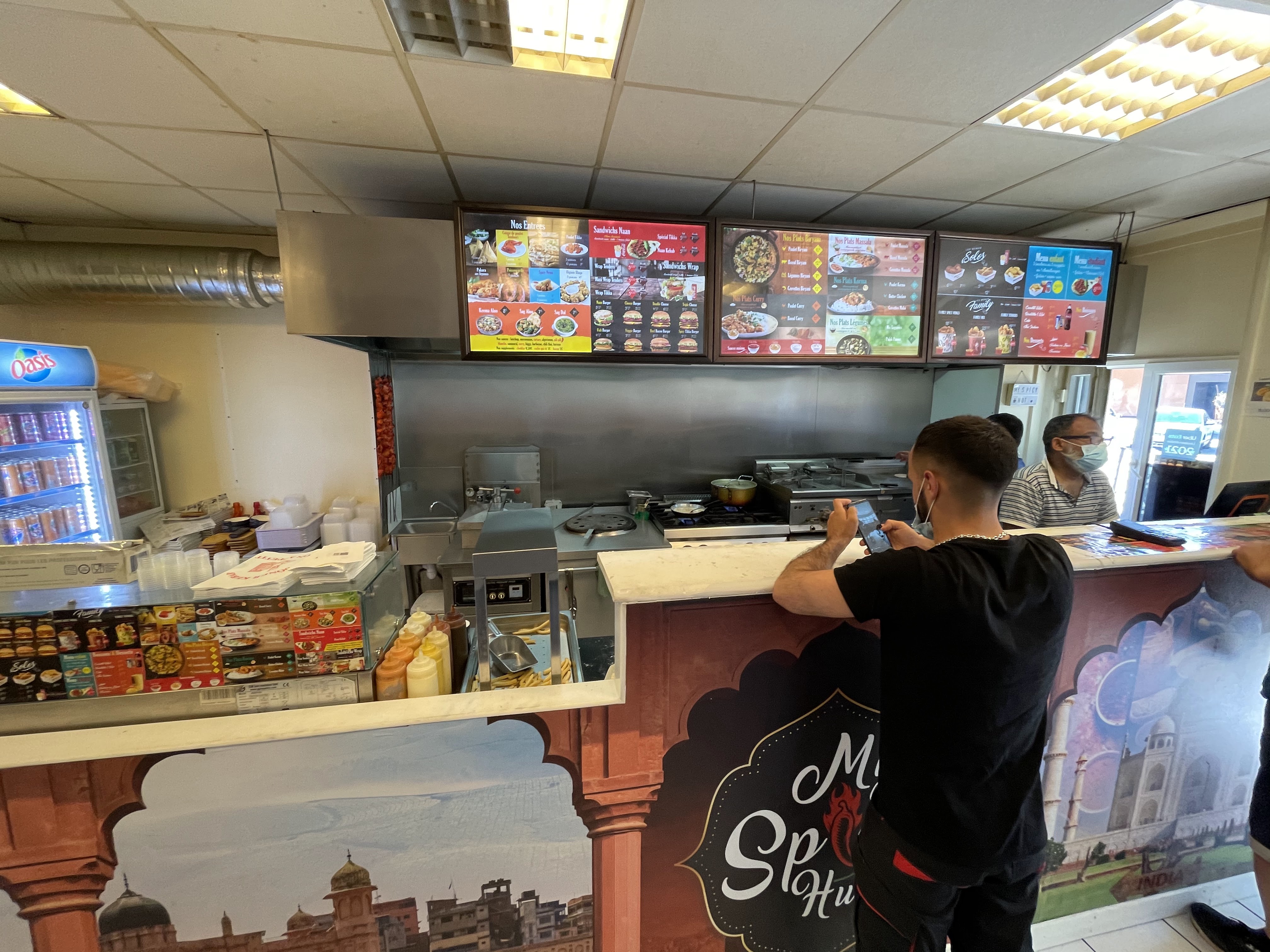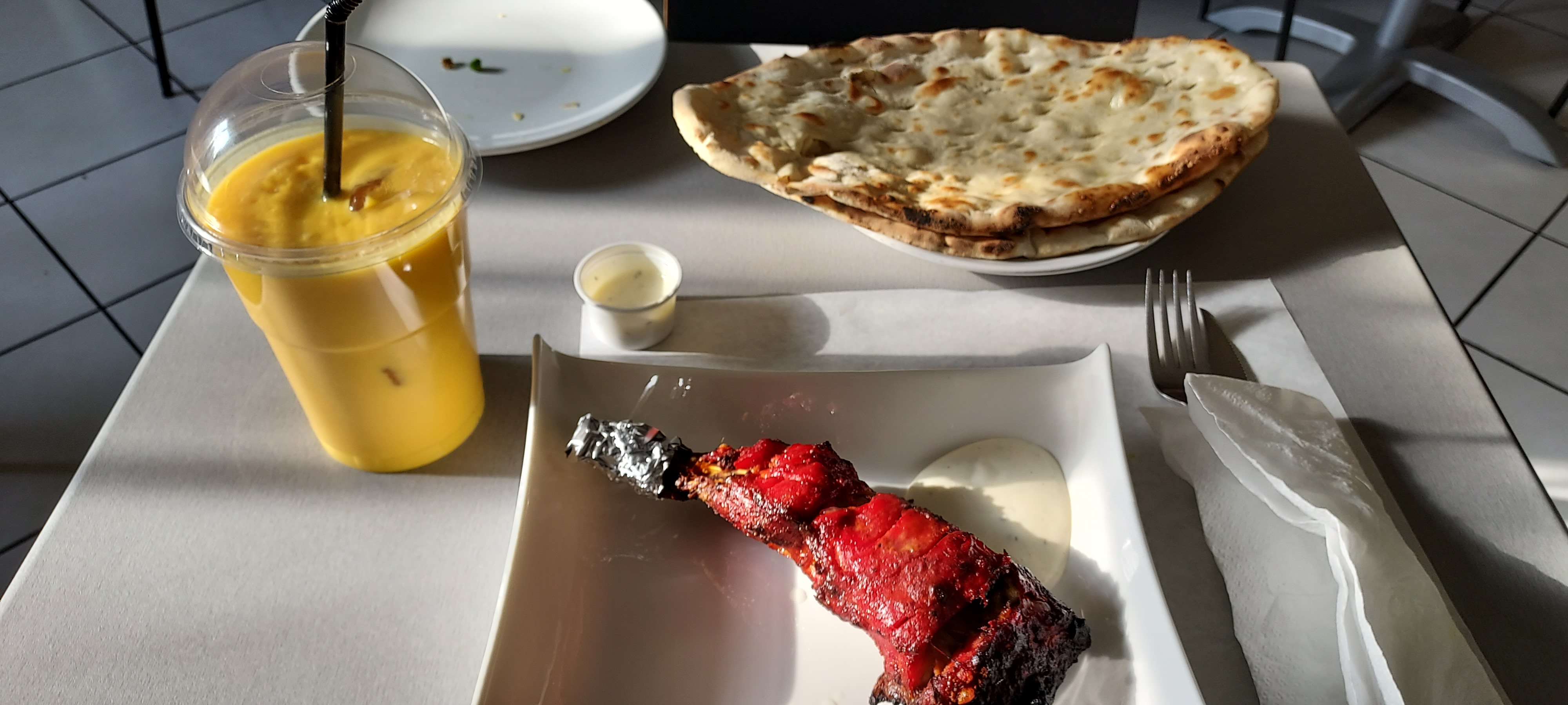 Enfin un restaurant Indien fast-food. Nous avons commandé plusieurs assiettes pour déguster; le masala au poulet, l'oignon bhaja, le sag dahl, poulet tikka, les naans nature et au fromage, et le lassi à la mangue...EXCELLENT pour un fast-food. Halid ( propriétaire ?) nous a fait les plats comme à la maison. Le poulet tikka si tendre et les naans fait maison...je bave encore...