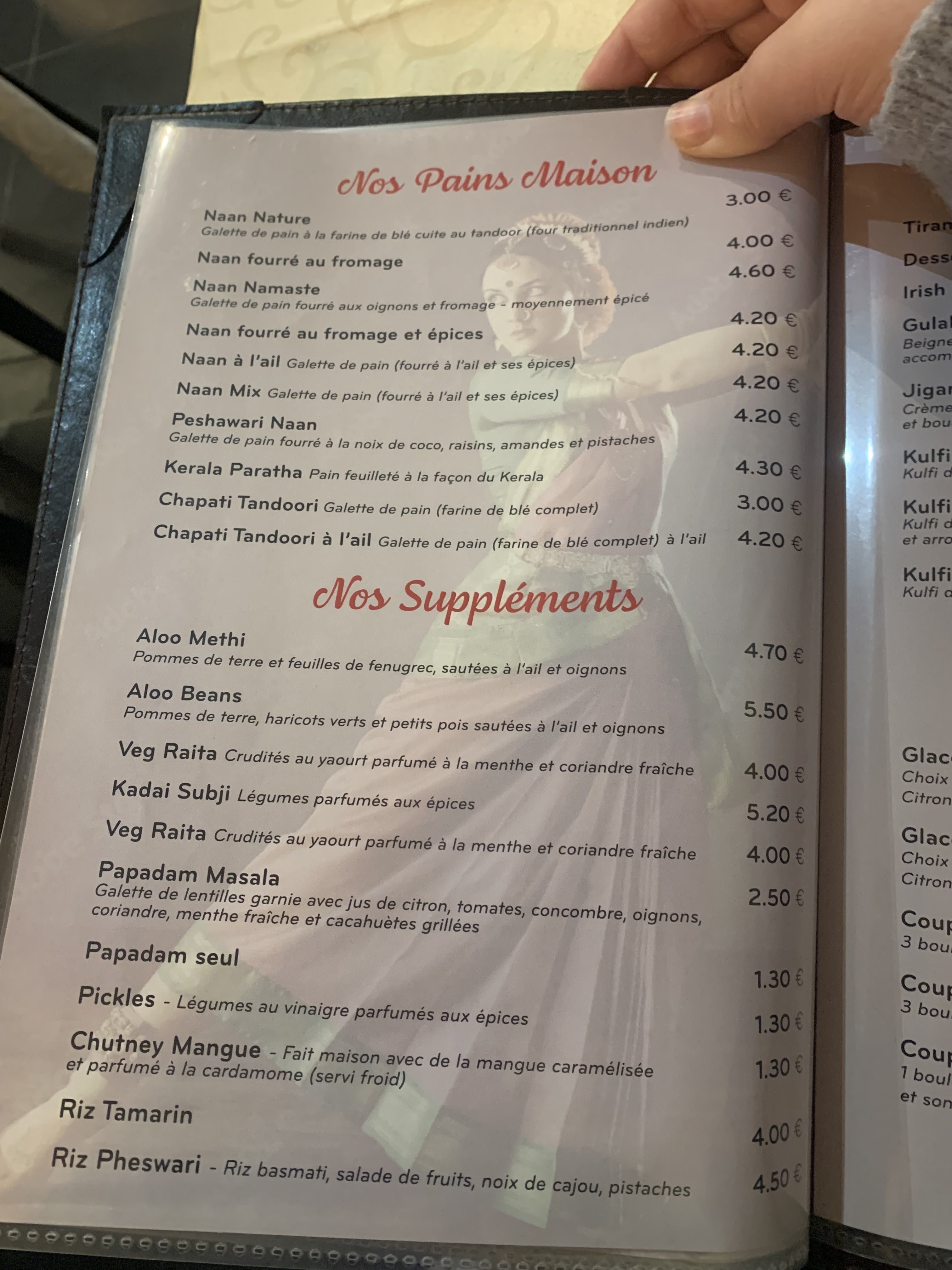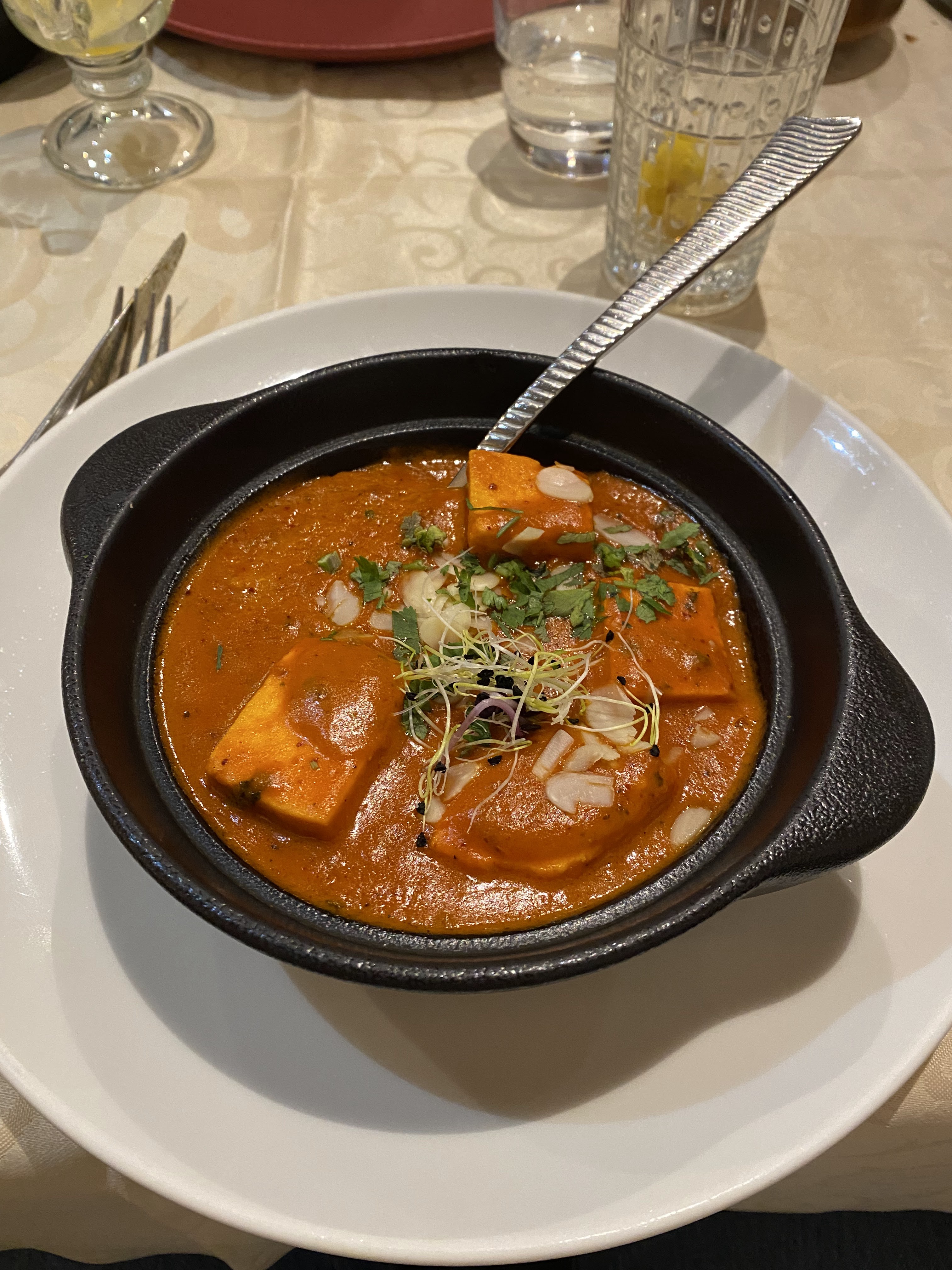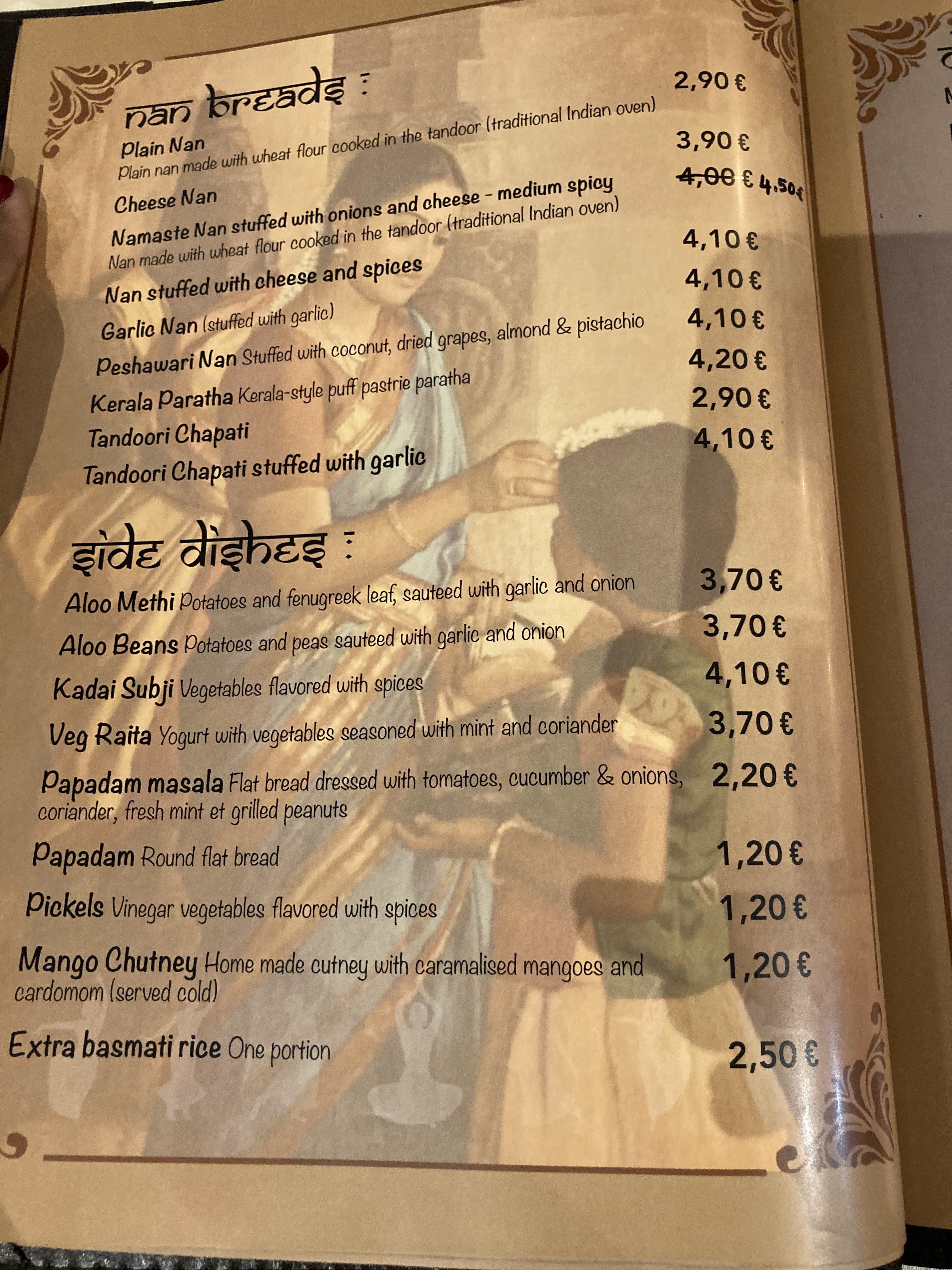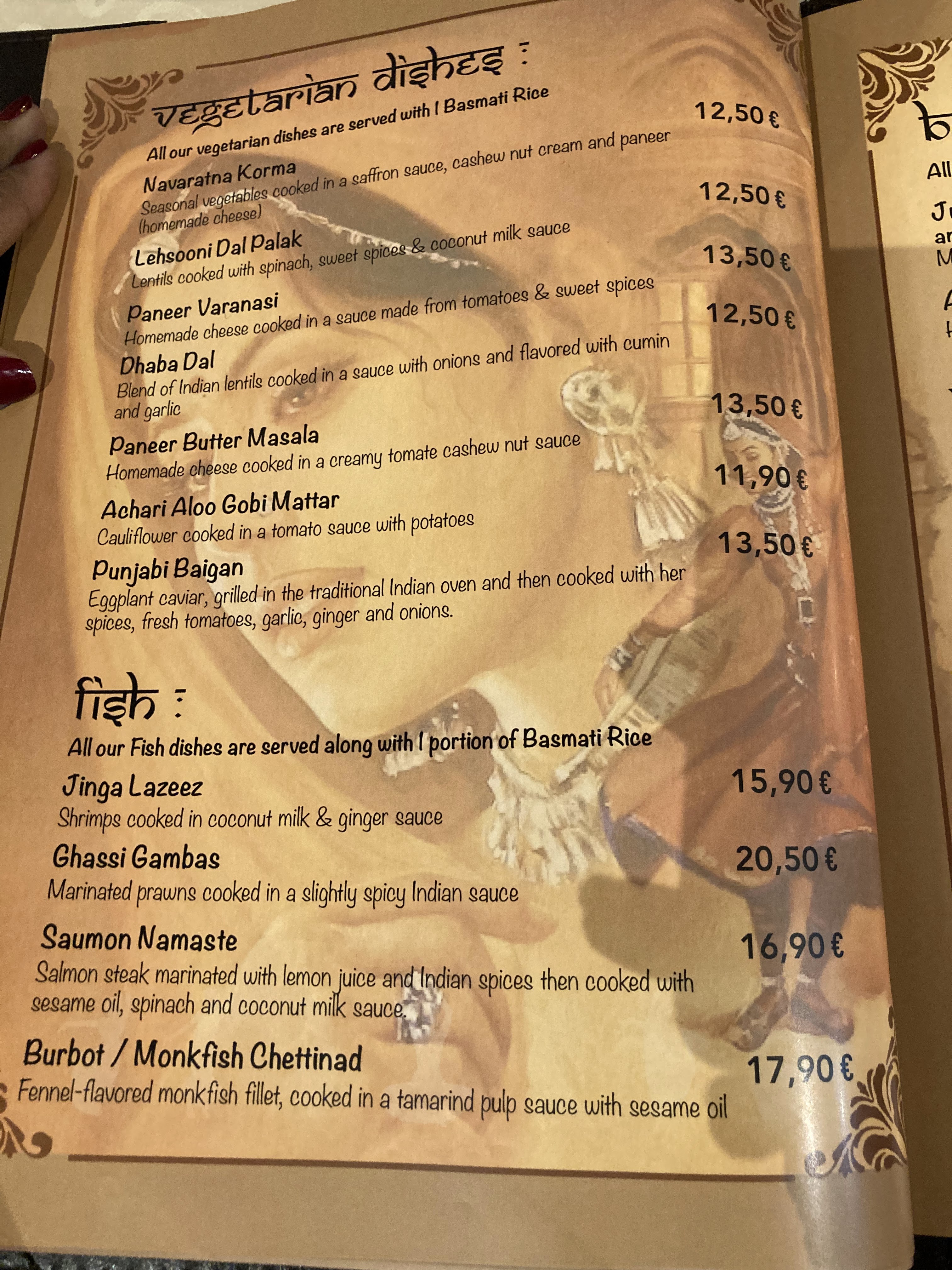 Très typique ! L’entrée était bonne (samoussa légumes), mais un peu trop gras (il y avait de l’huile - ça montre que c’était frais mais quand meme). Les sauces sont très bonnes ! J’ai pris un plat végétarien (navaratna kotma) et les légumes n’étaient pas très frais… j’avais l’impression que c’était du surgelé.. Je n’ai pas trop aimé, il manquait du goût. Par contre j’étais accompagné et la personne a goûté une grillade royale et elle a bien aimé. Rien à dire sur le service, qui était rapide et très soigneux ! Les naams sont trop bons ! J’ai goûté un lassi à la mangue qui était incroyable ! Ma suggestion serait un plat végé qui soit juste un peu de chaque plat principal (caviar d’aubergines, lentilles, paneer, légumes) et sauces avec du riz (et si jamais, des naams !!!)