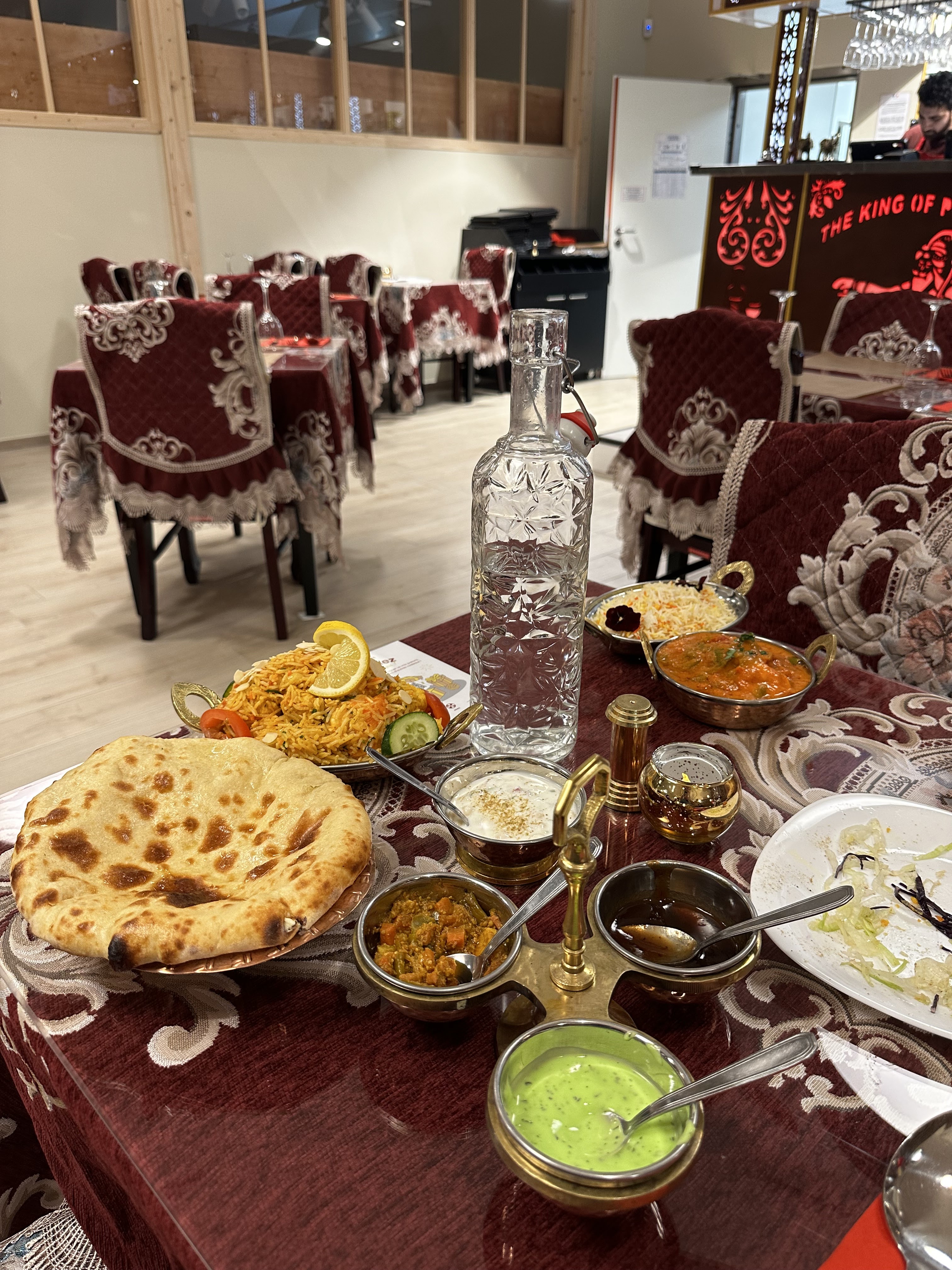 Aujourd'hui j'ai eu le plaisir de dîner dans un restaurant indien exceptionnel, et je ne peux que le recommander chaleureusement. Dès que l'on franchit le seuil de l'établissement, on est immédiatement transporté par une décoration somptueuse qui crée une ambiance authentique et envoûtante. Les lumières tamisées, les couleurs vives et les motifs traditionnels ajoutent à l'expérience immersive. L'espace est vaste, offrant un confort indéniable, même pendant les heures de pointe. On ne se sent jamais à l'étroit, ce qui est un véritable atout pour passer un moment agréable. Le service est irréprochable : l'équipe est aux petits soins, toujours souriante et prête à répondre à toutes nos demandes. Leur accueil chaleureux ajoute une touche personnelle qui fait toute la différence. La cuisine est un véritable voyage culinaire à travers l'Inde. Le menu propose un large éventail de plats, allant des classiques bien connus aux spécialités plus rares, et même le nombre de variétés de naan m'a surpris ! Chaque plat est préparé avec soin et présente une explosion de saveurs qui ravira les amateurs de cuisine indienne. Les végétariens seront tout aussi conquis, le menu leurs propose aussi un large éventail. Enfin, les prix sont tout à fait corrects, surtout au vu de la qualité des mets et du service proposé. En somme, ce restaurant indien offre une expérience gastronomique inoubliable et mérite amplement le détour.