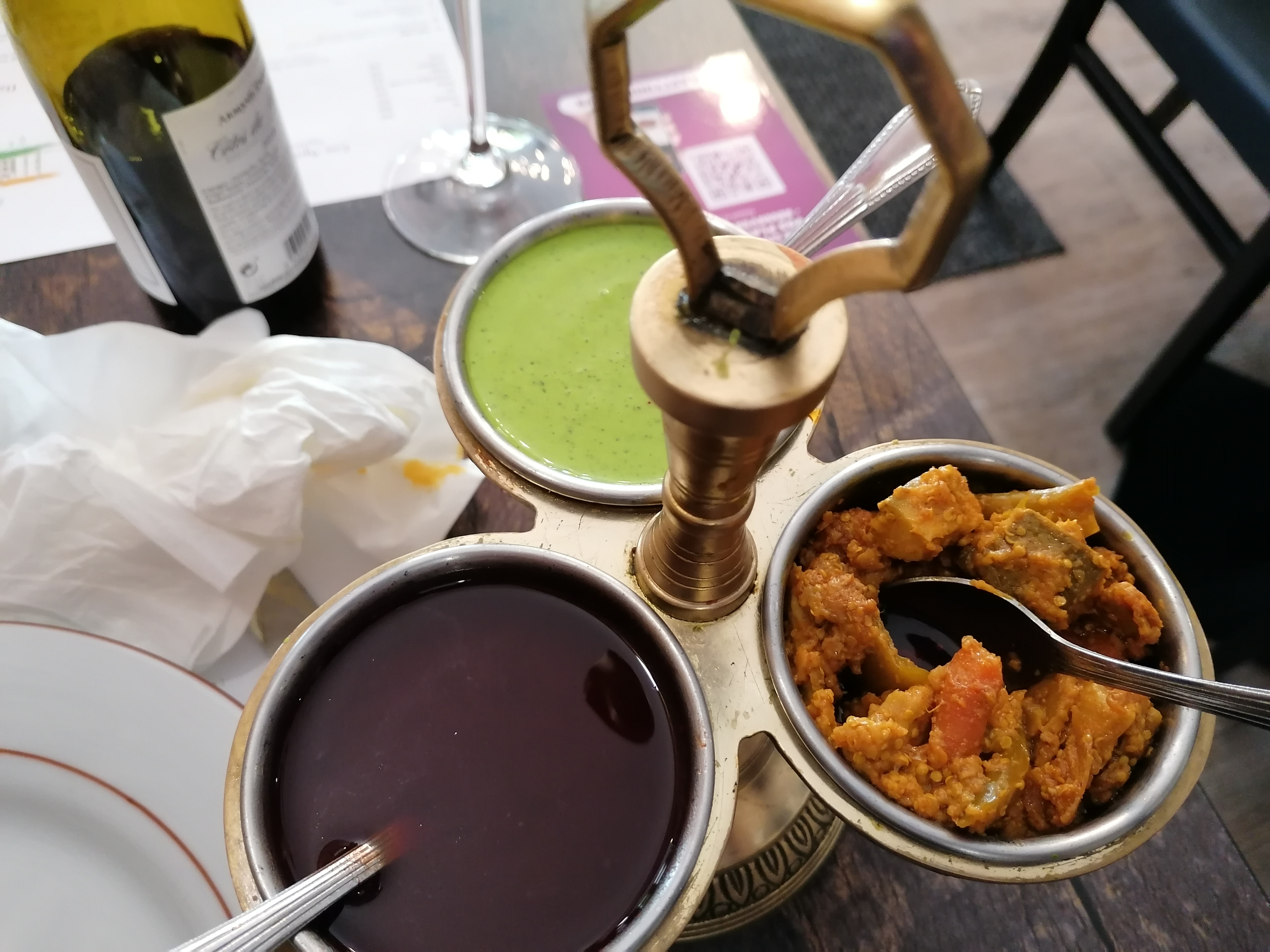 Cuisine indienne de base bonne cet établissement possède des chaises hautes c)'est parfait pour venir en famille toilettes mixtes et petits mais pas mal dans l'ensemble ( si vous n'aimez pas le curry n'y mettez pas les pieds il y en a dans TOUS les plats)