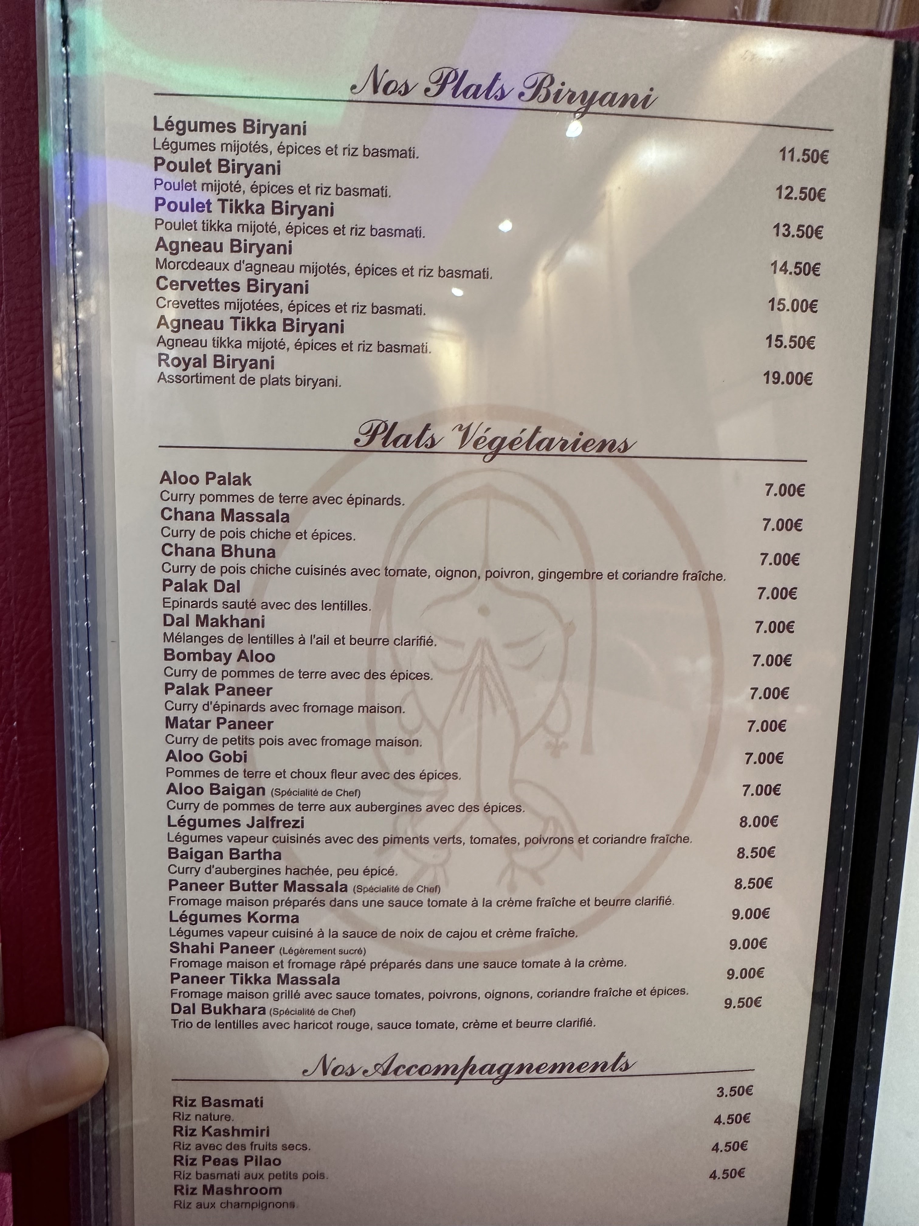 C’était la première fois et franchement je recommande ce restaurant indien vivement !!! Tout était parfait : les plats sont délicieux , le personnel discret et serviable et les prix très raisonnables .