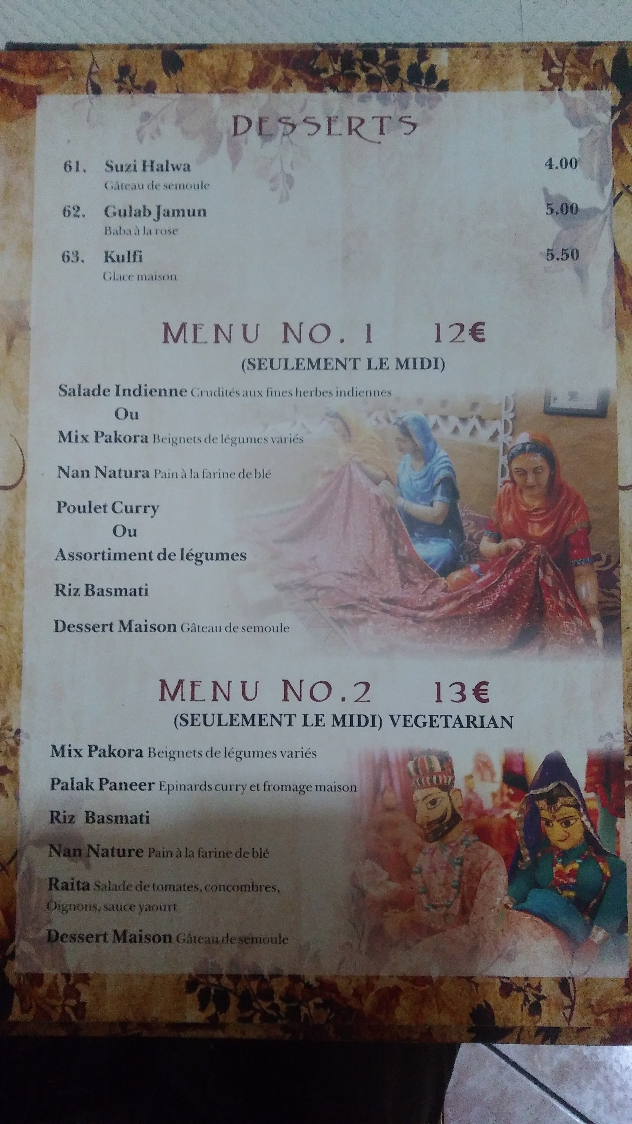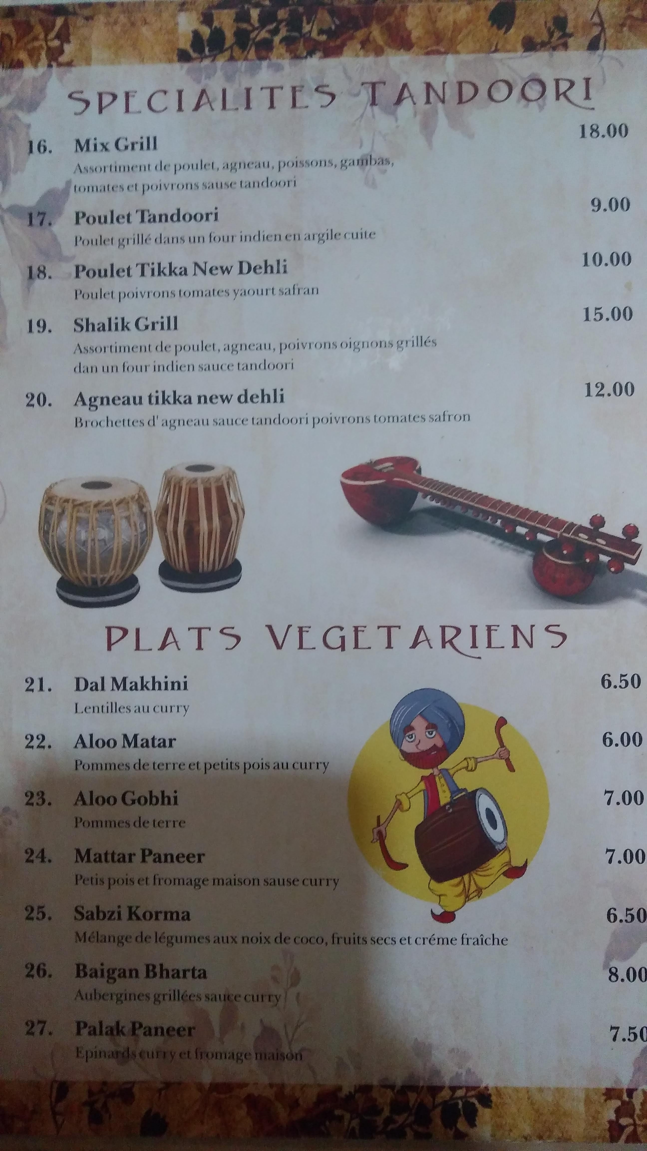 Plats dont les saveurs ne sont malheureusement pas une découverte. État du menu : risible ! Hygiène en cuisine : alarmante. Étonnée de constater qu'il est mieux noté que certains autres restaurants indiens bien meilleurs en tous points... Ps : en revanche l'accueil de la patronne a été très agréable.