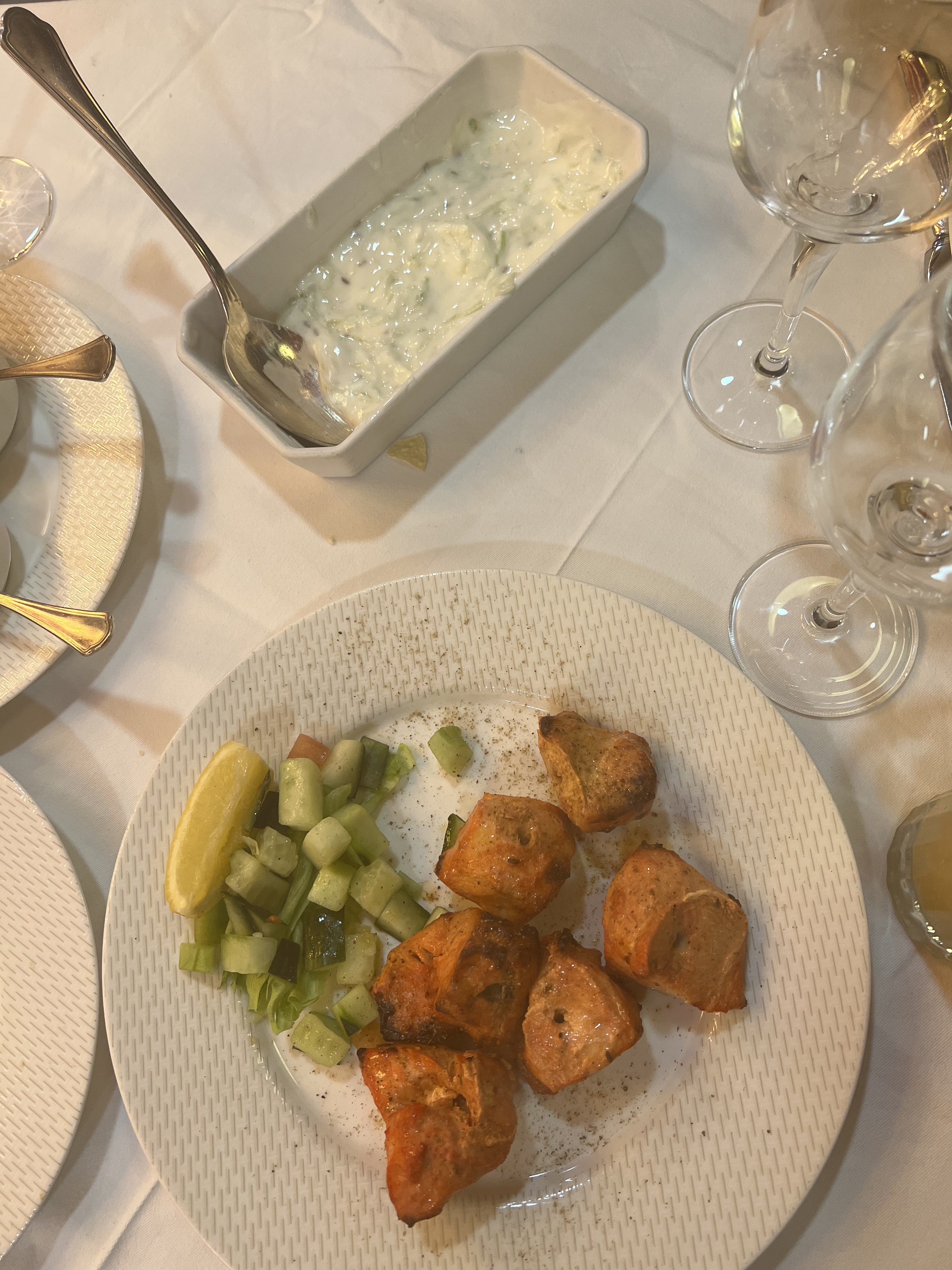 Poulet tikka très bon, garlic cheese nan on se sent pas beaucoup l’ail et celui au miel bah on ne sent que le fromage donc déçu, les plats étaient bon, les cocktails étaient pas dutout top pina colada trop amer . Par contre le service très moyen j’aimerais qu’on me laisse finir mon plat avant de vouloir débarrasser , carrément ça m’a enlevé les couverts alors que je n’avais pas fini , revenir toute les 5 min pour débarrasser est très lourd .