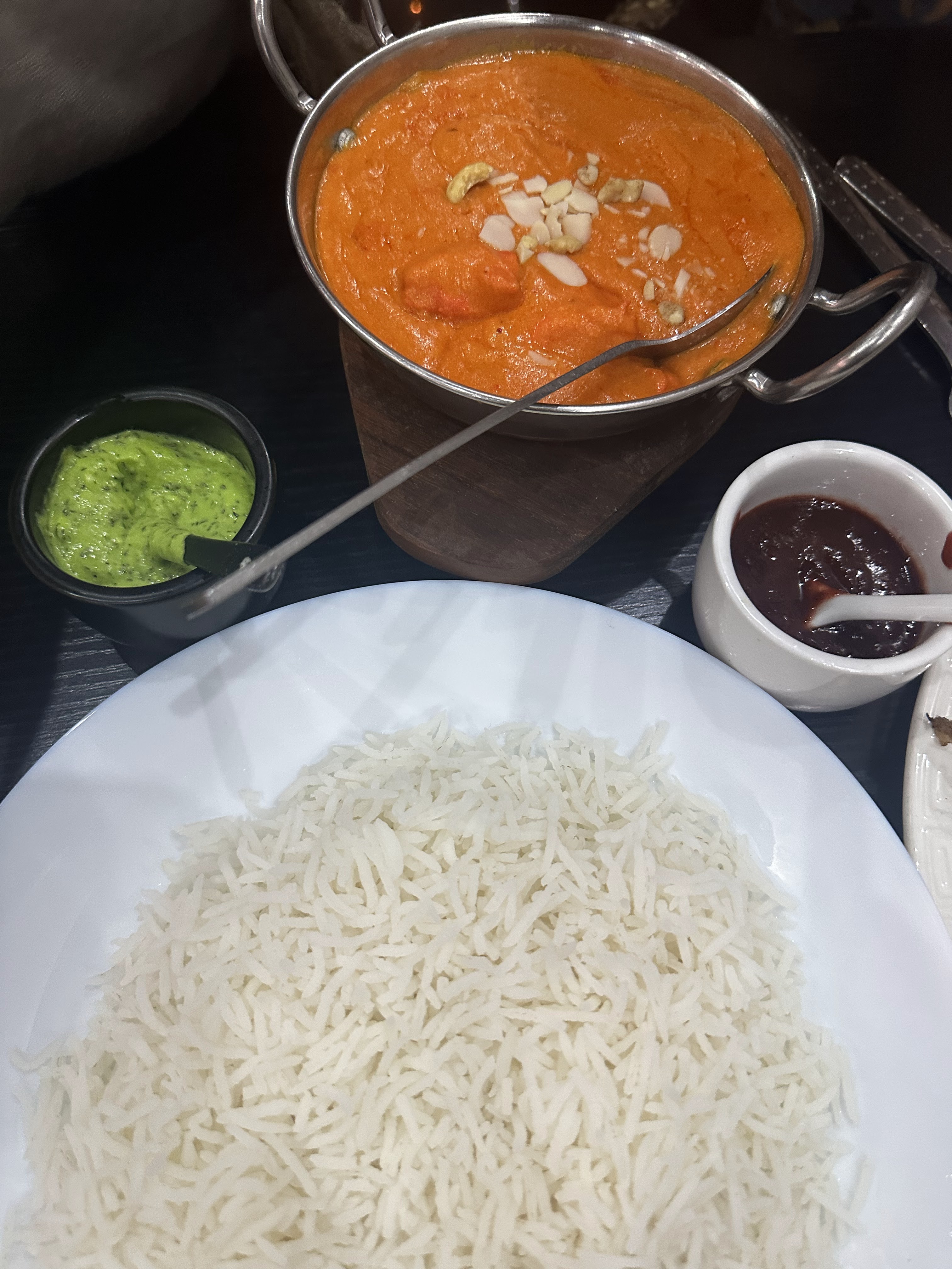 Tres beau restaurant , intérieur très jolie . La salle est très belle . Concernant la nourriture il y’as beaucoup de choix . J’aime beaucoup leurs Butter chicken et leurs Pizza indienne . ( les samosa sont tellement délicieux ) Sa change vraiment des autres restaurants indien parce que il y’as du choix . Le personnel est très sympathique Et ça c’est génial Jamais déçu .