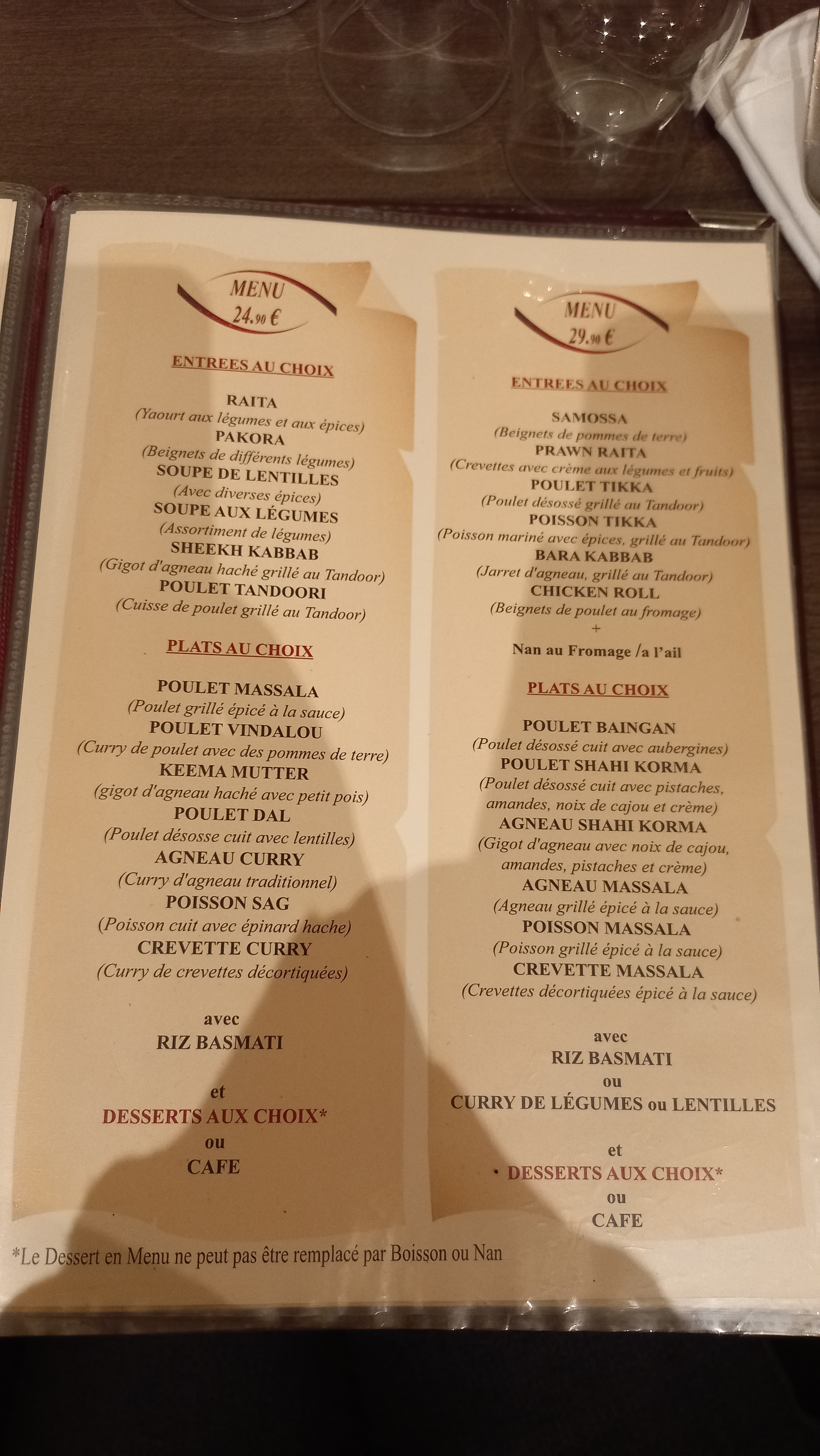 Repas excellent (mention speciale au shaki korma). portions genereuses. le service est tres agreable, le serveur est a l'ecoute, tres pro, change regulierement la carafe et nous a propose du riz en rab etc. nous n'avons pas testé les desserts, mais pour tout le reste c'est un grand oui ! soiree tres sympa !