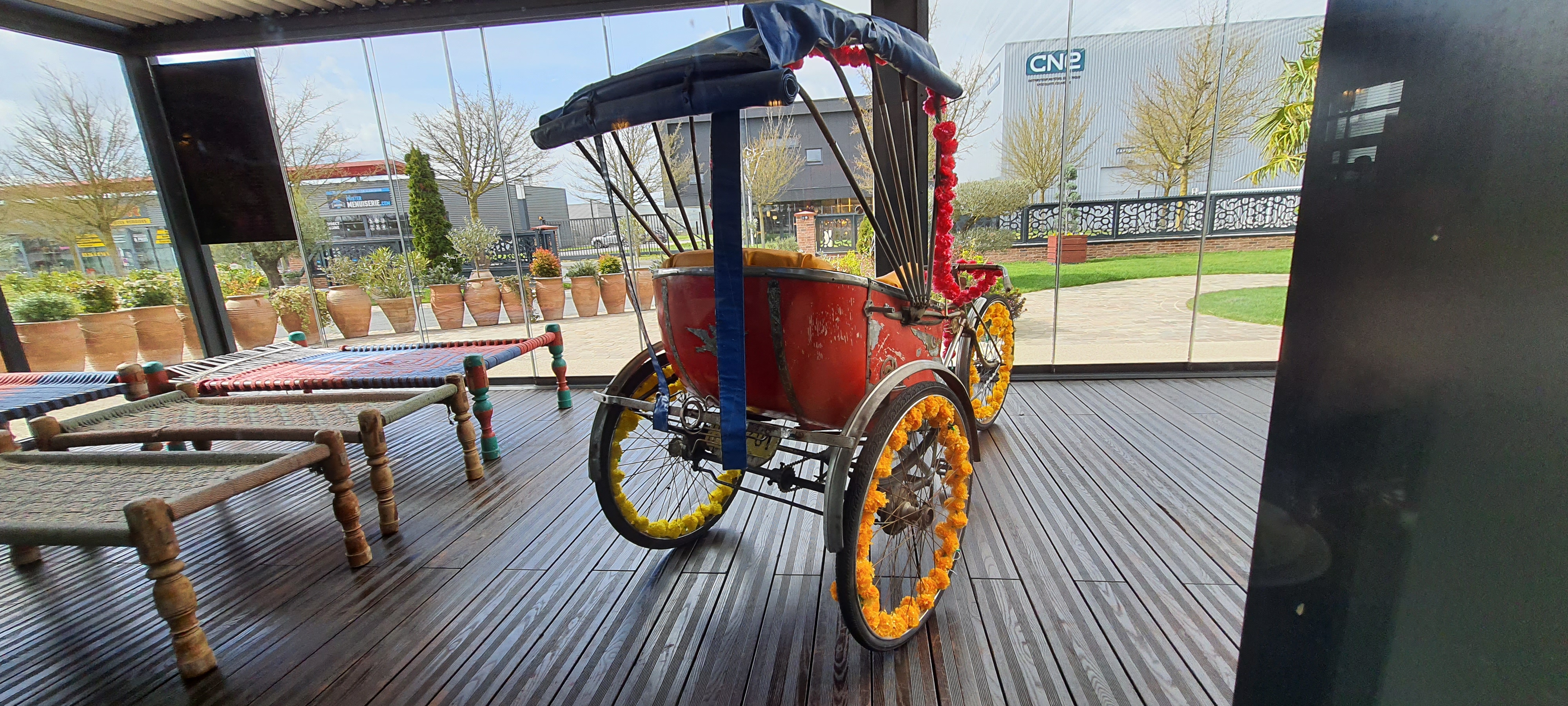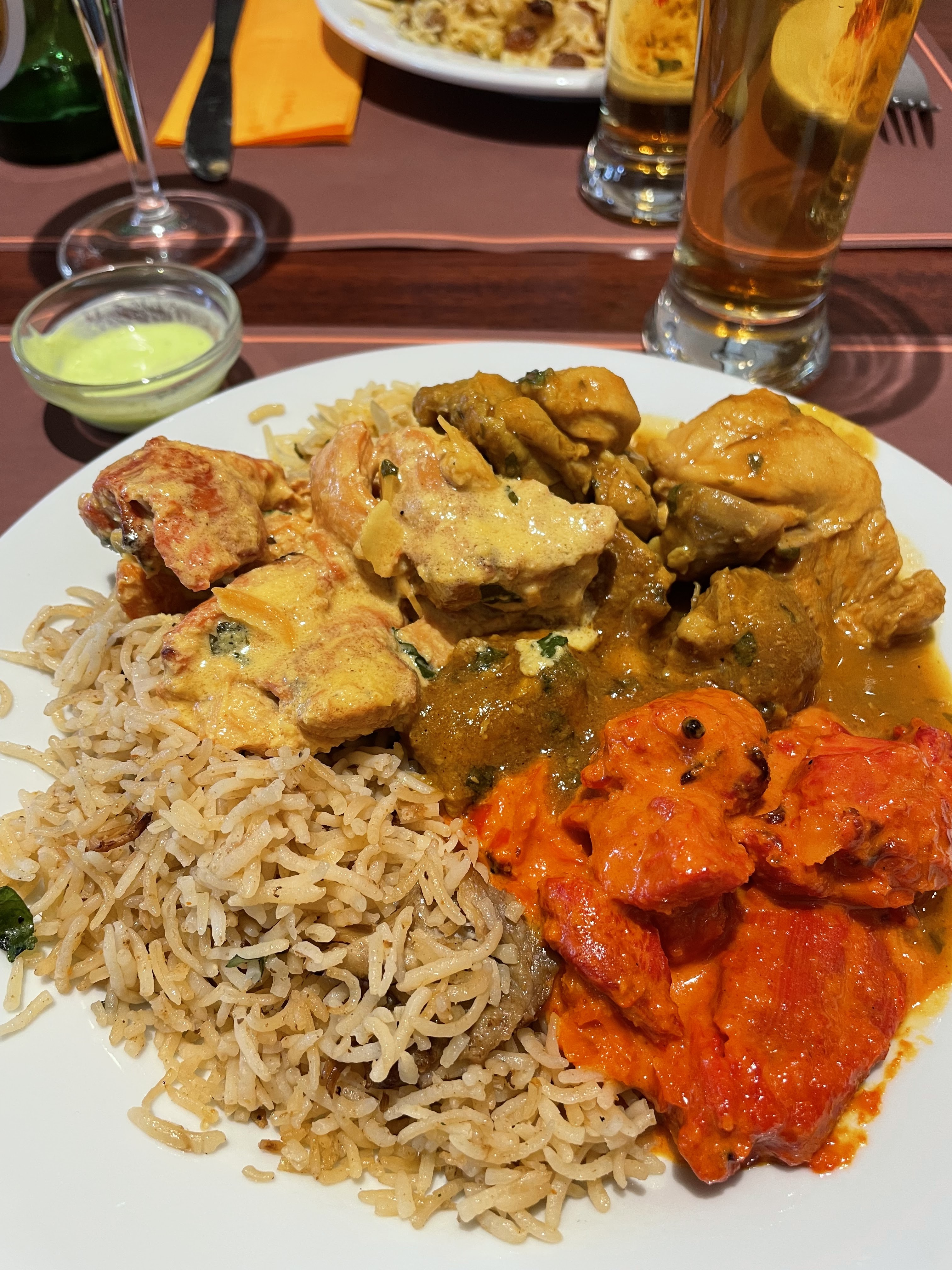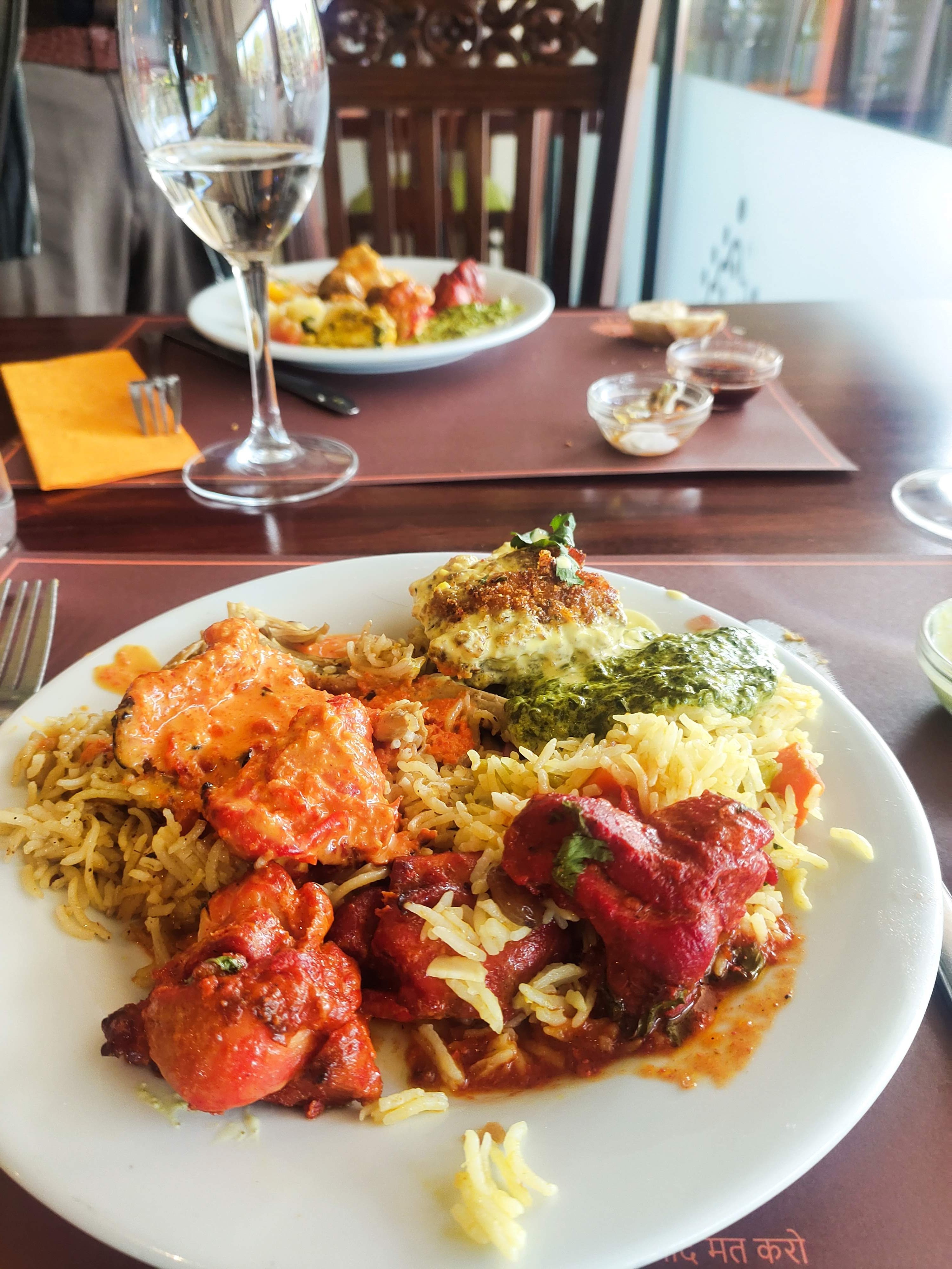 Magnifique restaurant aussi bien a l'intérieur qu'à l'extérieur ! Si vous voulez voyager dans le culinaire indien allez y sans hésitation MAIS ATTENTION réservez car restaurant très demandé. Les employés sont très souriants et professionnels, vous pouvez être surveillé SANS MAUVAISE INTENTION par le patron au cas où si vous laissez la cuillere de service dans le plat qui refroidira le plat, vous avez bien raison monsieur ! 😀 un poulet froid ce n'est pas agréable ! Vous avez du choix de l'entrée au dessert, en viande ( poulet et agneau) et plusieurs accompagnement disponibles ( épinard, plusieurs sorte de riz, etc...). Prix raisonnable