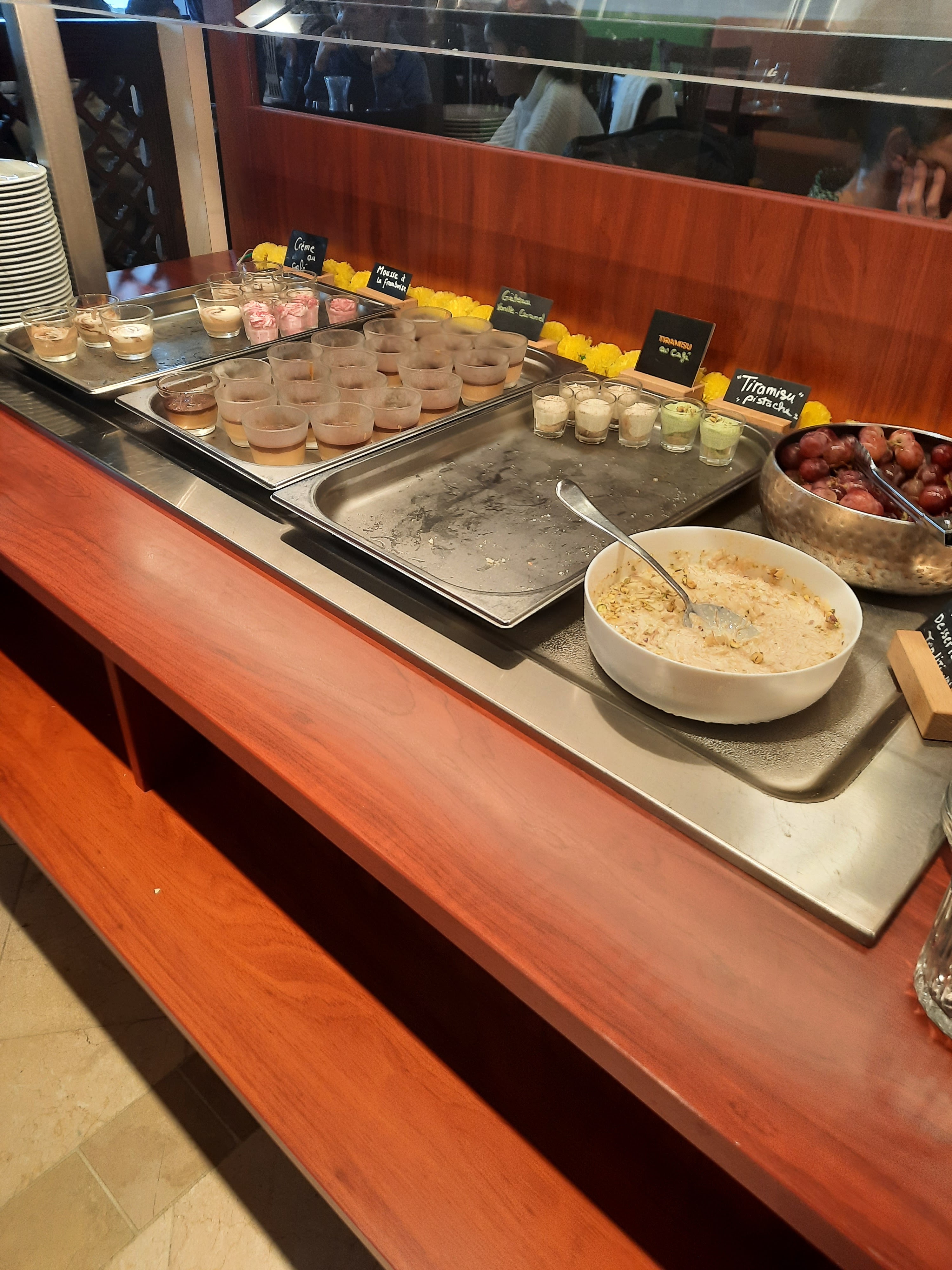 Buffet au top du top, jamais déçue. Les entrées sont variées, on pourrait faire tout le repas rien qu’avec les entrées ! Les plats chauds, rien à dire (juste dommage qu’il n’y ait plus le bœuf korma comme il y avait y’a 1 an je crois bien). Hormis cela merci de nous servir des mets de qualité, le rapport qualité/prix est parfait, on y revient toujours avec plaisir. (Et coup de coeur pour le tiramisu et salade de fruits).