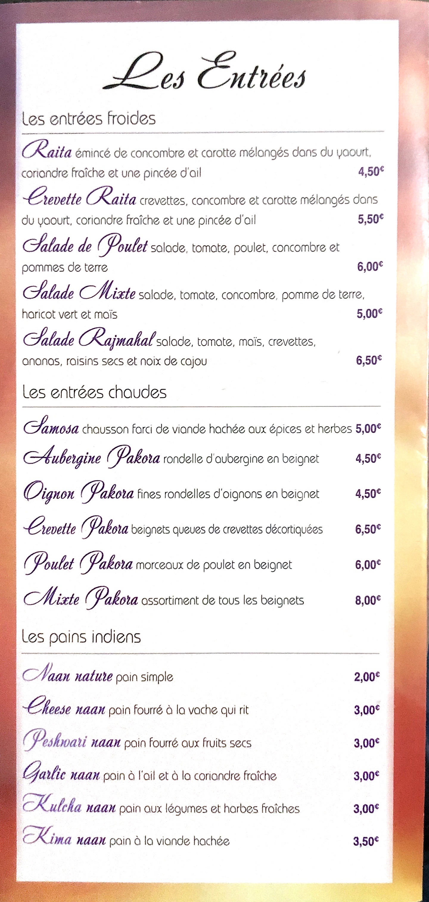 Prix en grosse augmentation pour une qualité et une quantité qui elles s’amenuisent. Aucune saveur. Presque 7€ pour 2 samoussas au bœuf… Addition beaucoup plus chère que celle calculée au départ et quand on demande « la carte sur internet n’est pas à jour »… bref de l’arnaque.
