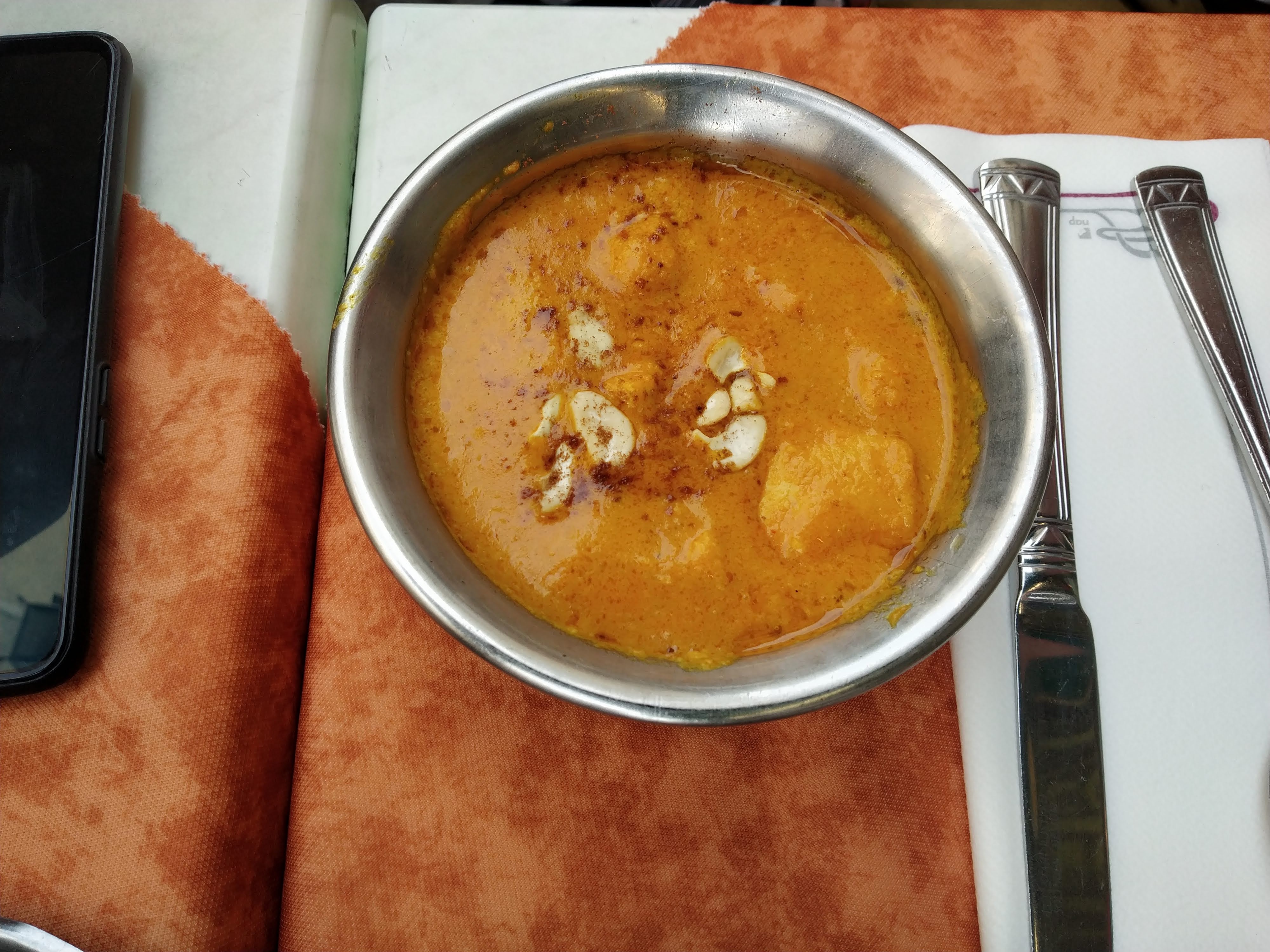 C'est pas mal, le serveur n'a pas voulu me donner les traditionnelles 3 sauces, sucrée, épicée et à la menthe sous prétexte que je n'ai pas pris d'apéro.... Dommage j'adore tremper mon cheese nan dans ces sauces, du coup c'était un peu sec. D'habitude j'ai toujours ces sauces dans les autres restaurants indiens, avec ou sans apéro...