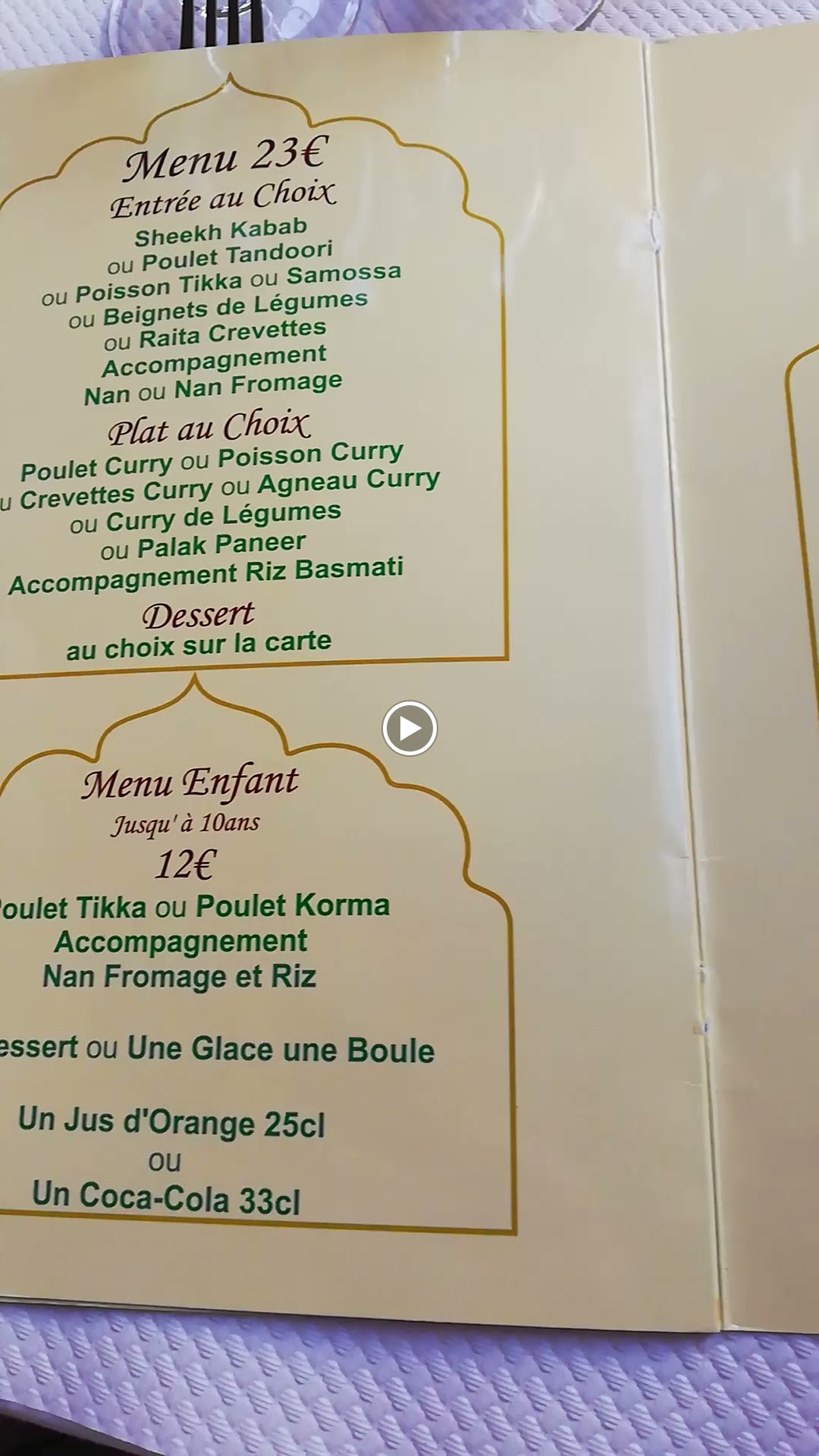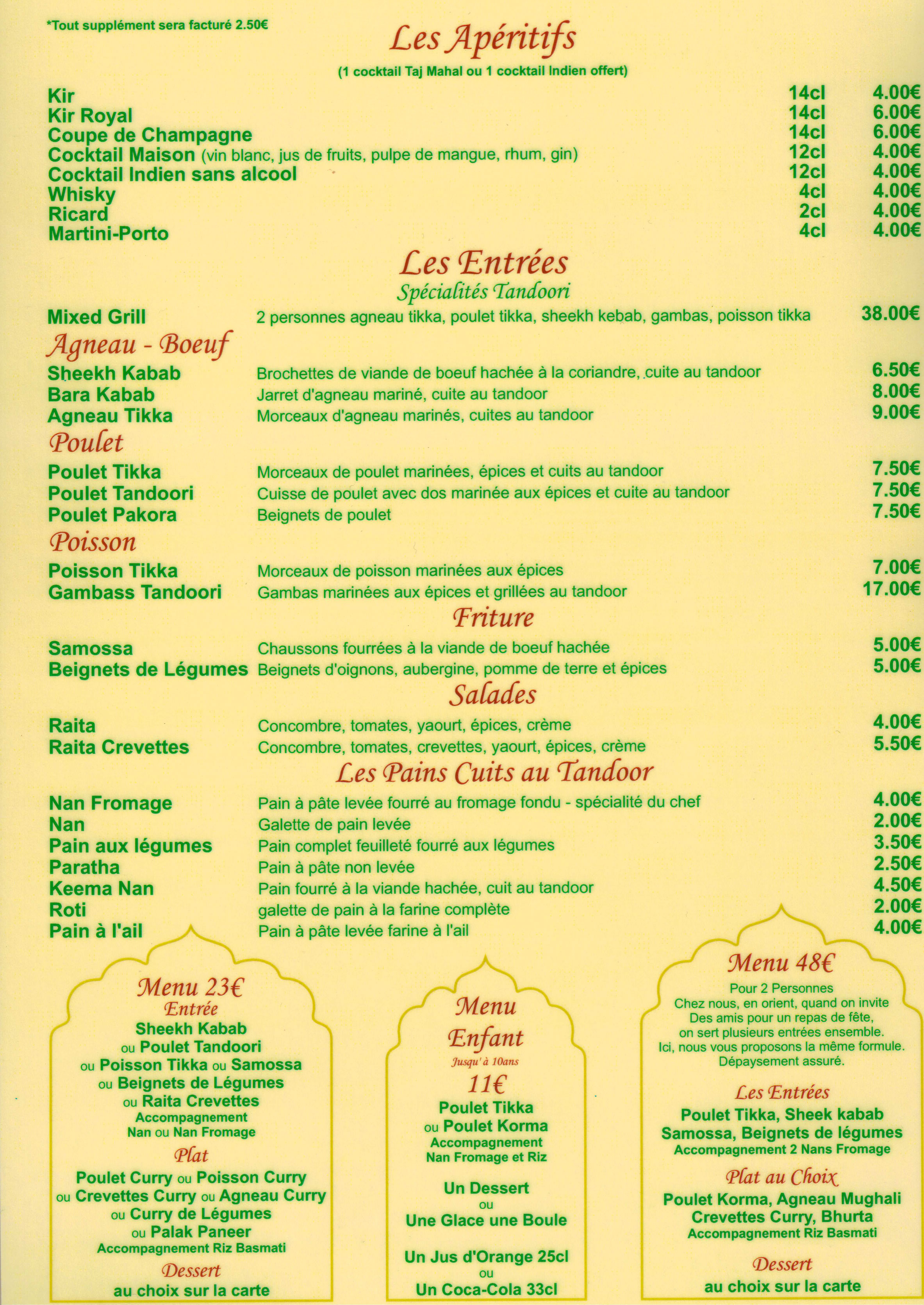 Un menu du soir à 24e avec entrée plat dessert+naan au fromage bien sûr, tout est délicieusement cuisiné, très copieux, délicat, le service est parfait, le cadre et la musique indienne exquis...