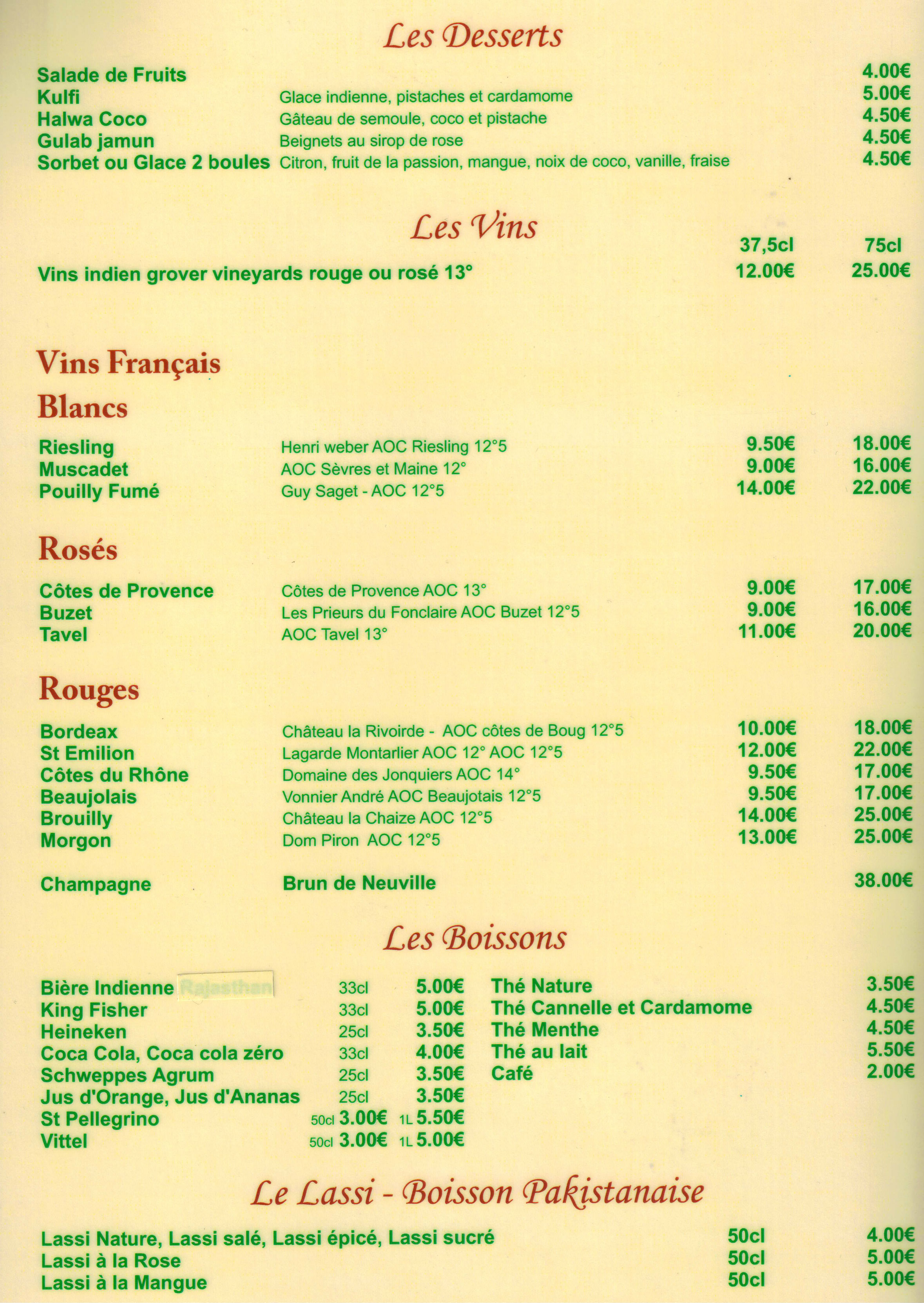 Très bon, quantité amplement suffisante, personnel discret mais très sympathique et disponible. Le seul petit bémol, mais vraiment pour chipoter, serait que j ai eu l impression que les épices dans les plats principaux étaient moins présentes que dans les plats indiens traditionnels. Peut être une manière d européaniser ces plats très relevés