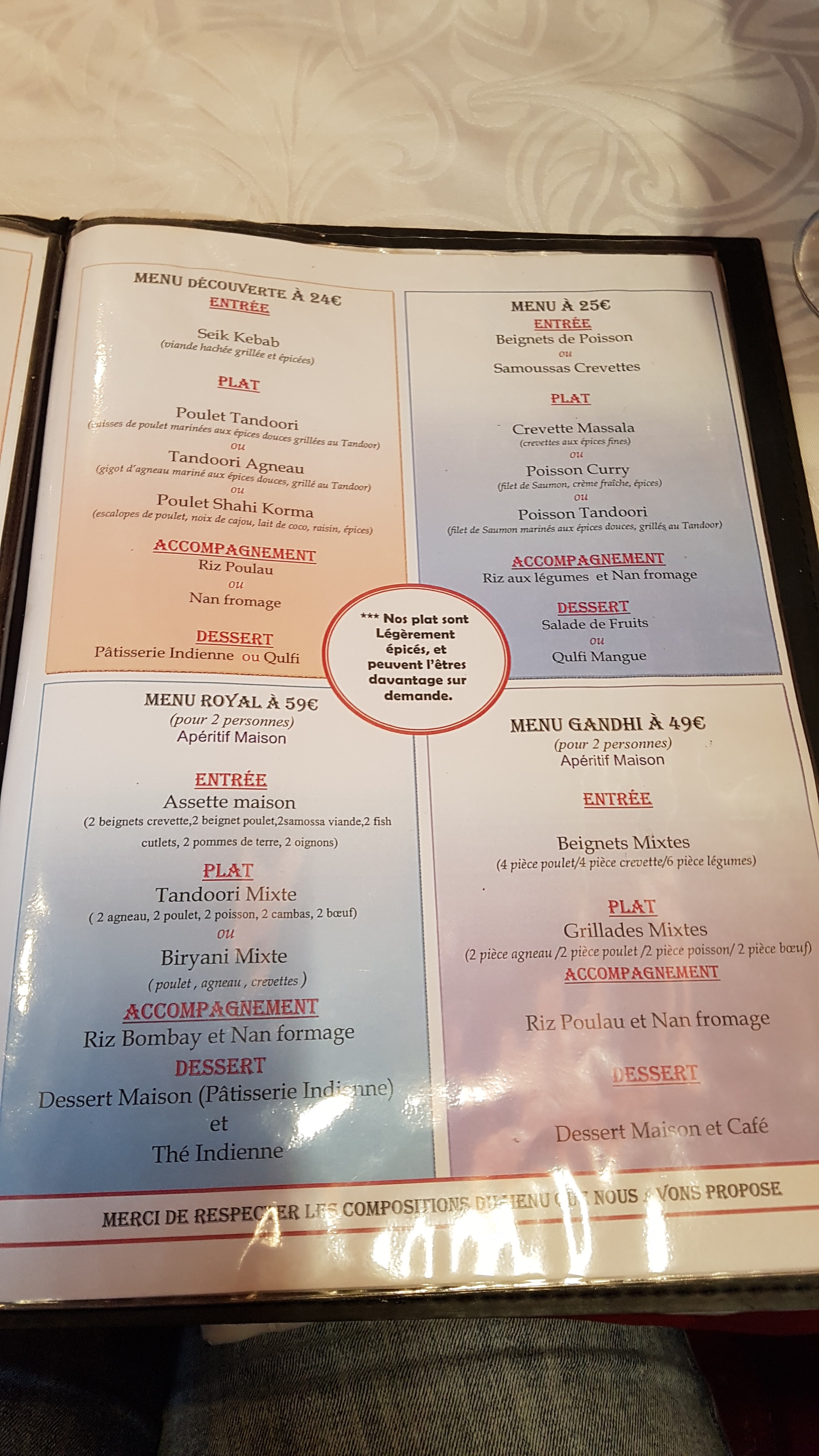 ACTUALISATION AU 27/06/2021. Très bon restaurant de spécialités indiennes avec une belle carte et plusieurs menus. Les plats sont faits maison, ils sont bons et copieux. Le service est à la hauteur. Personnel agréable et souriant. Paiement par carte bancaire accepté. Très bon rapport qualité/ prix. Je recommande cette adresse. Peu de place pour stationner à l'extérieur. La carte a été récemment changée. Ils proposent du thé indien.