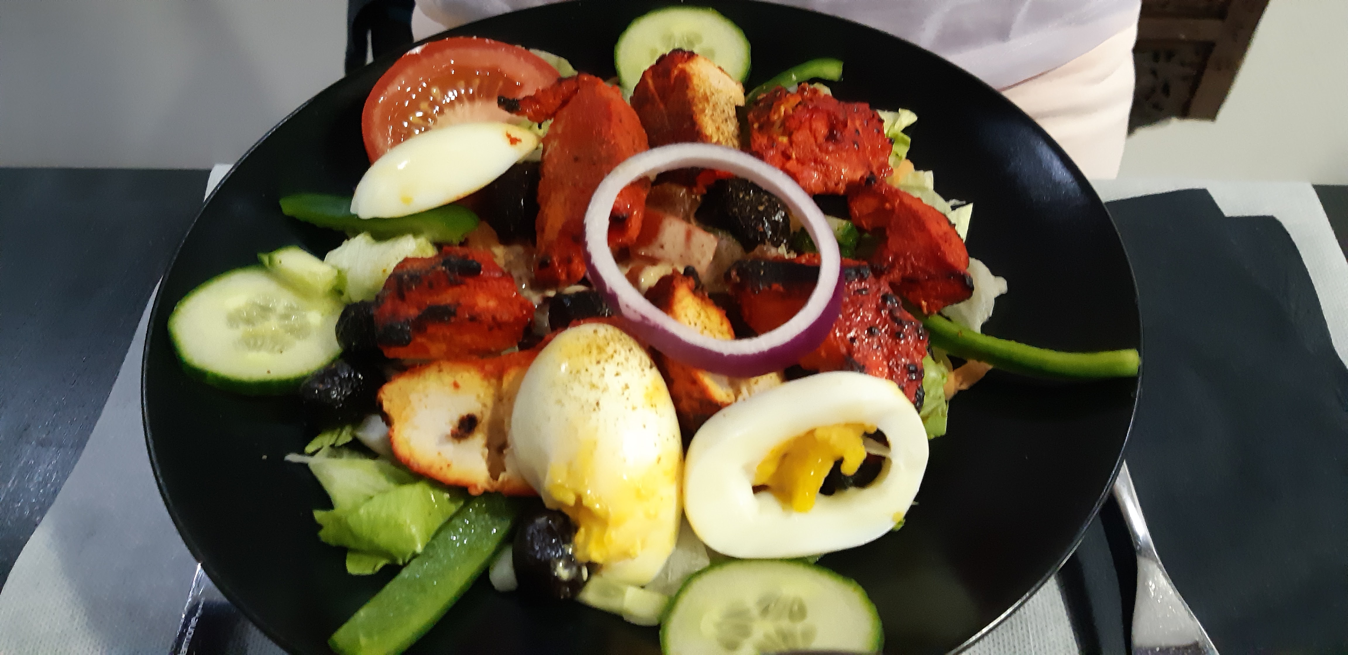 salle vide, salade d'entrée faite de crudités industrielles sans saveur, poulet pseudo tandori sec et sans goût, serveuse qui met sa musique sur son smartphone. a éviter absolument !