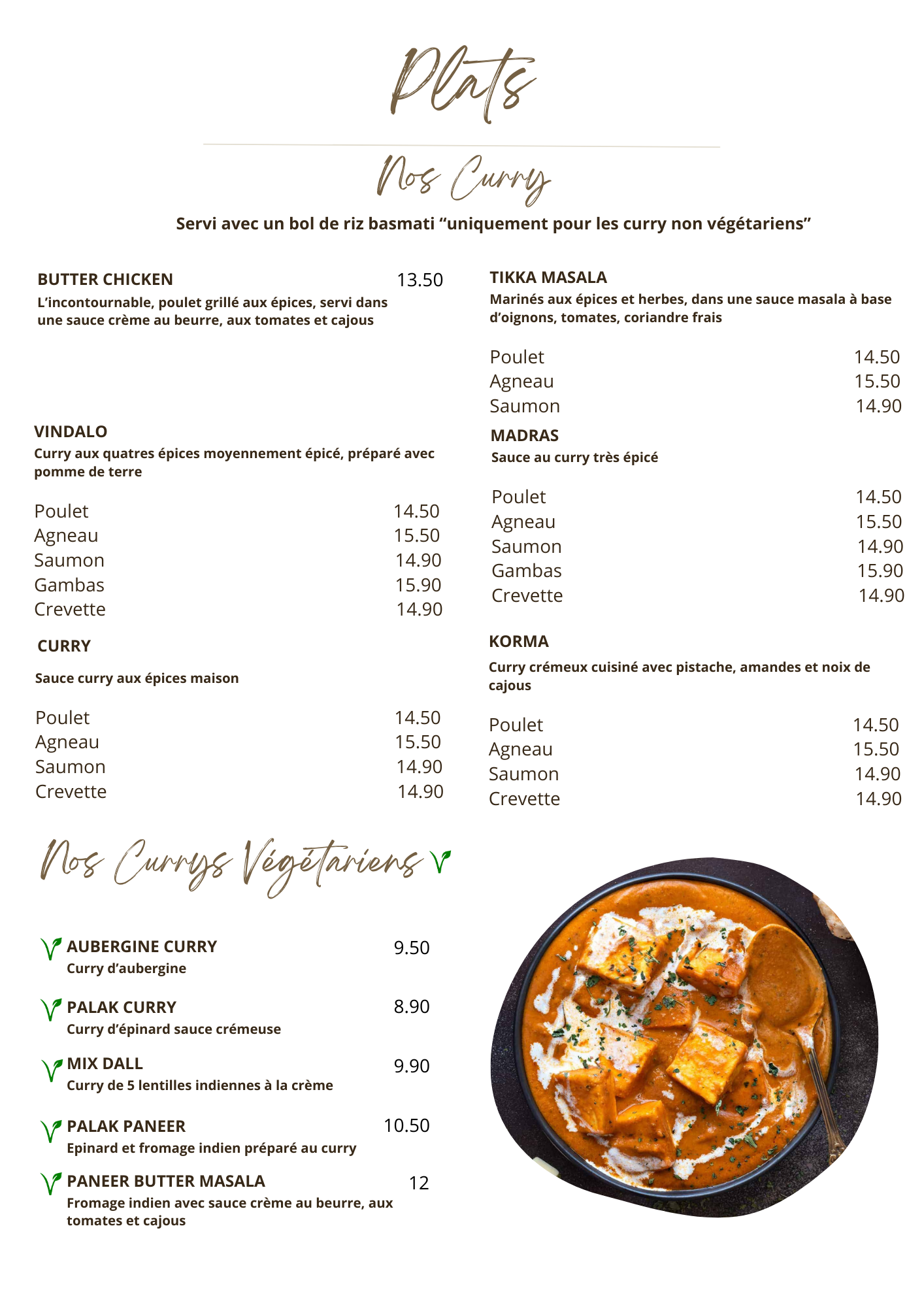 Nous avons pris à emporter. Un vrai régal. Poulet Korma et Agneau Jalfrezi : petite et grands se sont régalés. Naan au fromage très bonnes aussi