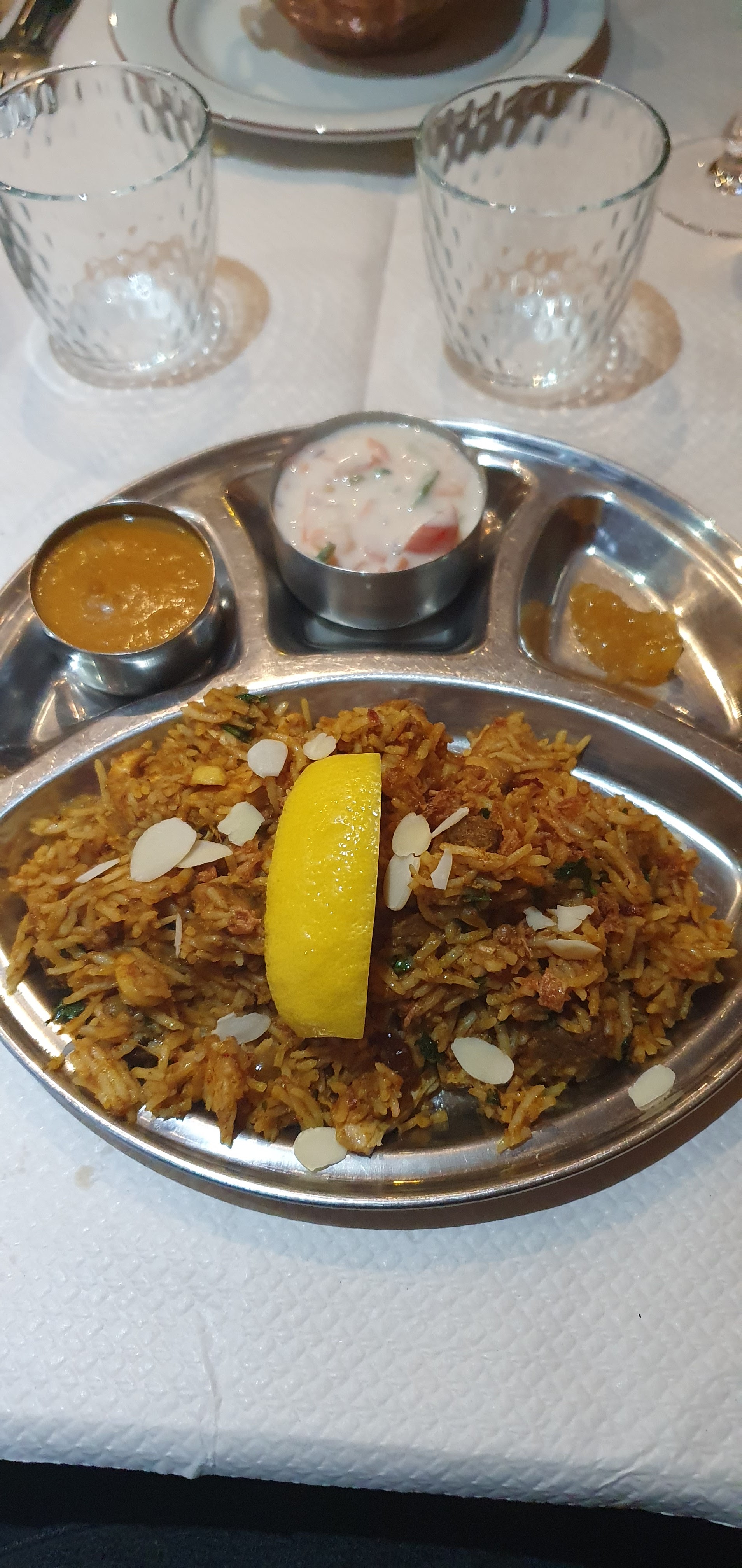 Serveur adorable, aux petits soins. Cependant si comme moi vous allez dans un restaurant indien parce que vous ne consommez pas de lait et avez une alimentation essentiellement végétale, prévenez bien le serveur, ils ont 3 plats qui peuvent convenir aux vegetaliens mais précisez-le car par défaut ils font revenir leur légumes byriani au beurre par exemple. Ma commande à été adaptée et ça c'est bien passé. Cuisine très bonne ! J'espérais juste moins de produits laitiers pour un restaurant indien, ça m'a étonné.