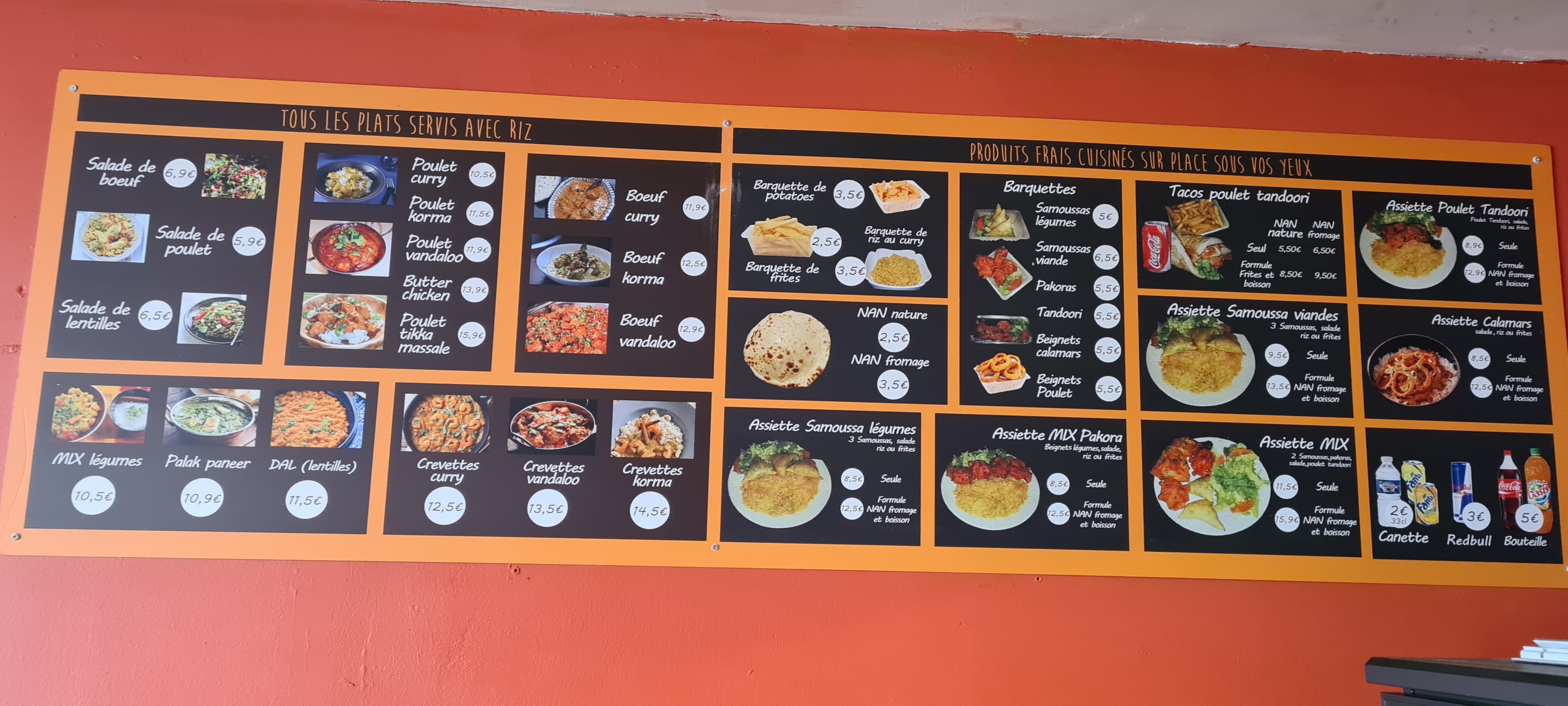 Je ne sais pas pourquoi on l'appelle un restaurant indien. La nourriture ne ressemblait en rien à la cuisine indienne. Le menu est affiché au mur et il est basique, je ne peux pas vraiment dire s'il s'agit de restauration rapide ou de quelle cuisine. Il n'y a pas de déco, c'est juste froid et peu de tables. Ce n'était pas attrayant, je suis parti. Vraiment déçu d'avoir parcouru 30 km jusqu'à cet endroit.