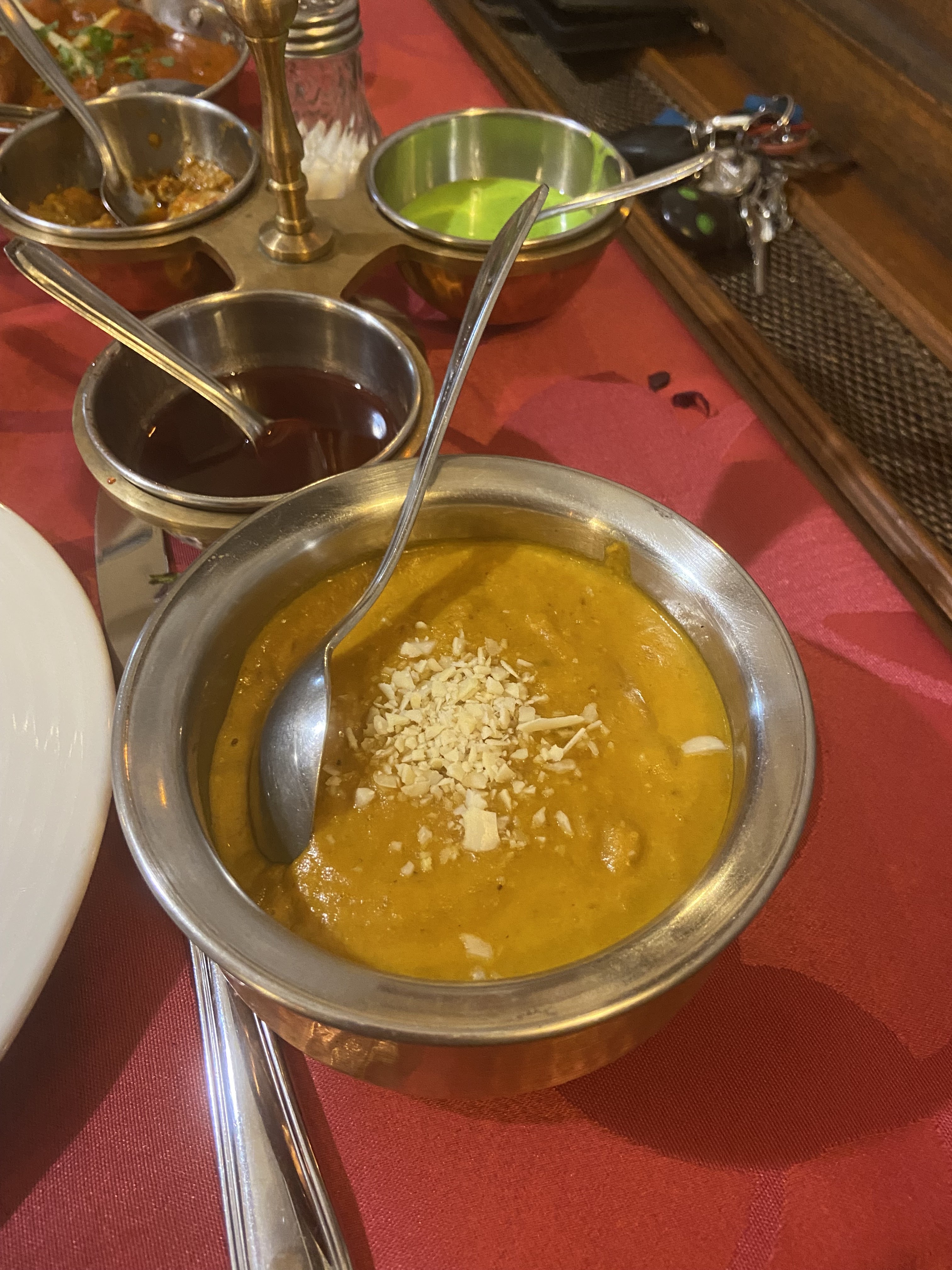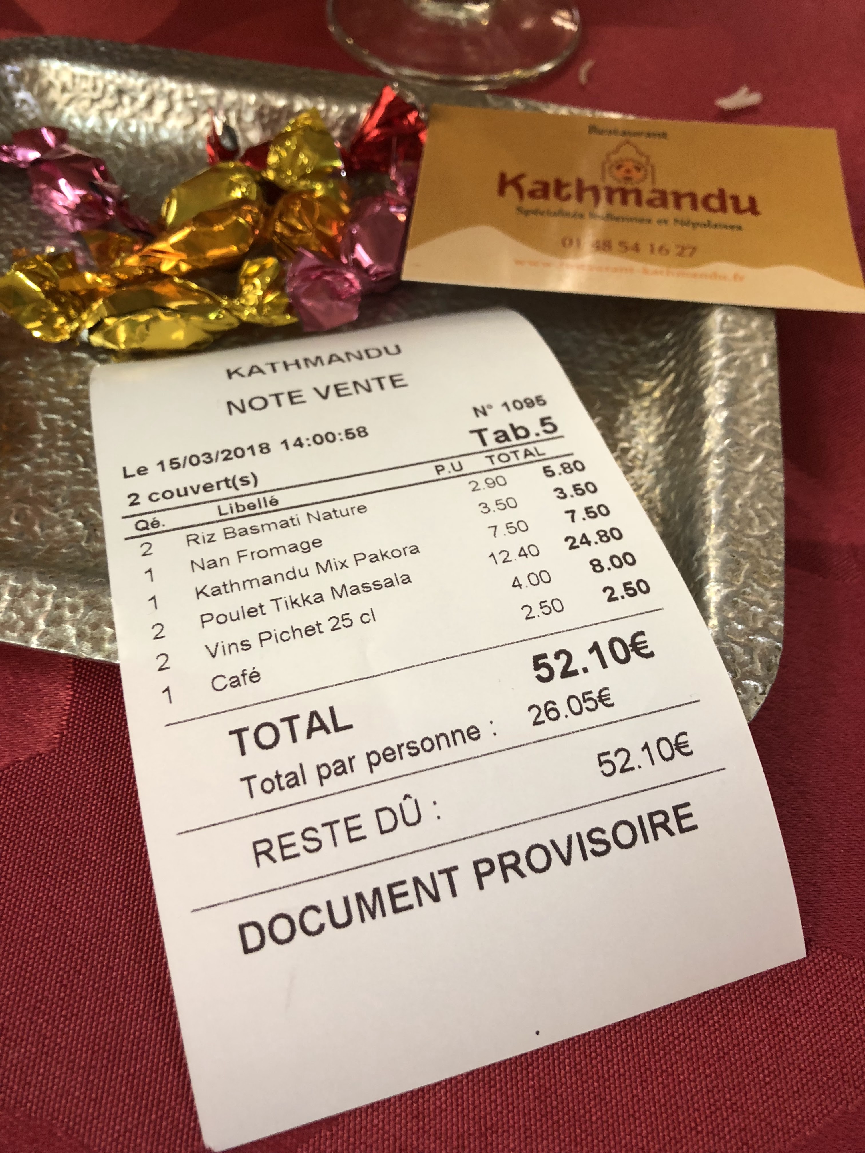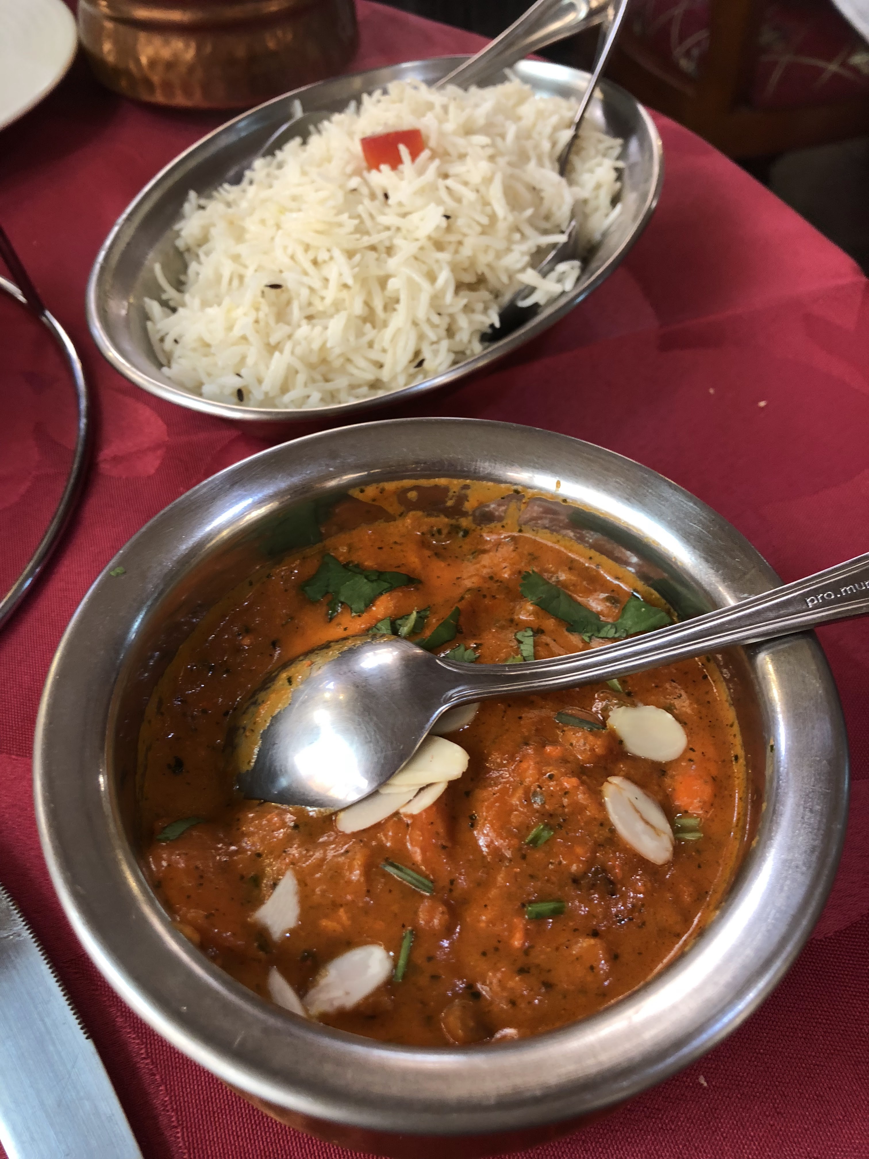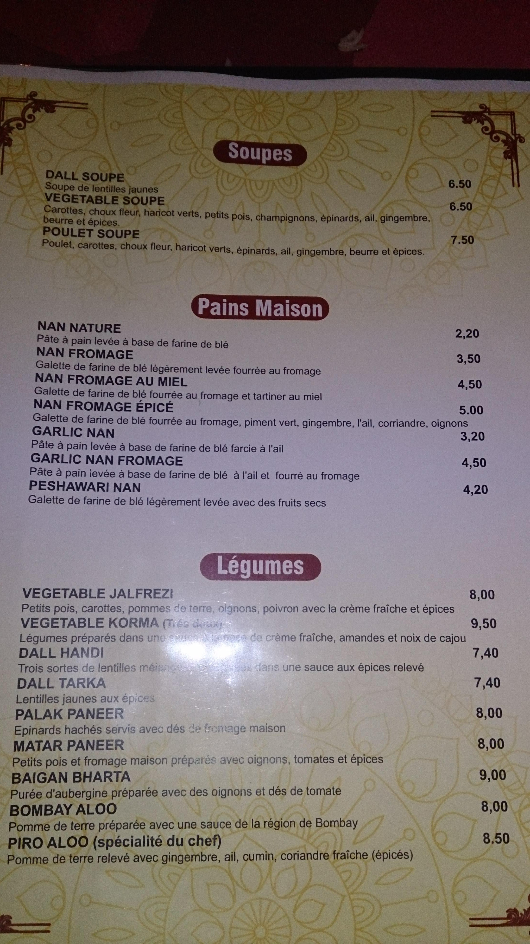Ça été une première et ça sera la dernière TIKKA masala, le plat était trop gras … La soupe lentilles il y a plus d’eau que de lentilles,,, et le dessert trop de sucre et peu de sauveur …très bonne accueil par la jeune fille qui devrait s’améliorer en français on avait du mal à comprendre sa description des plats 95€ a 3 personnes