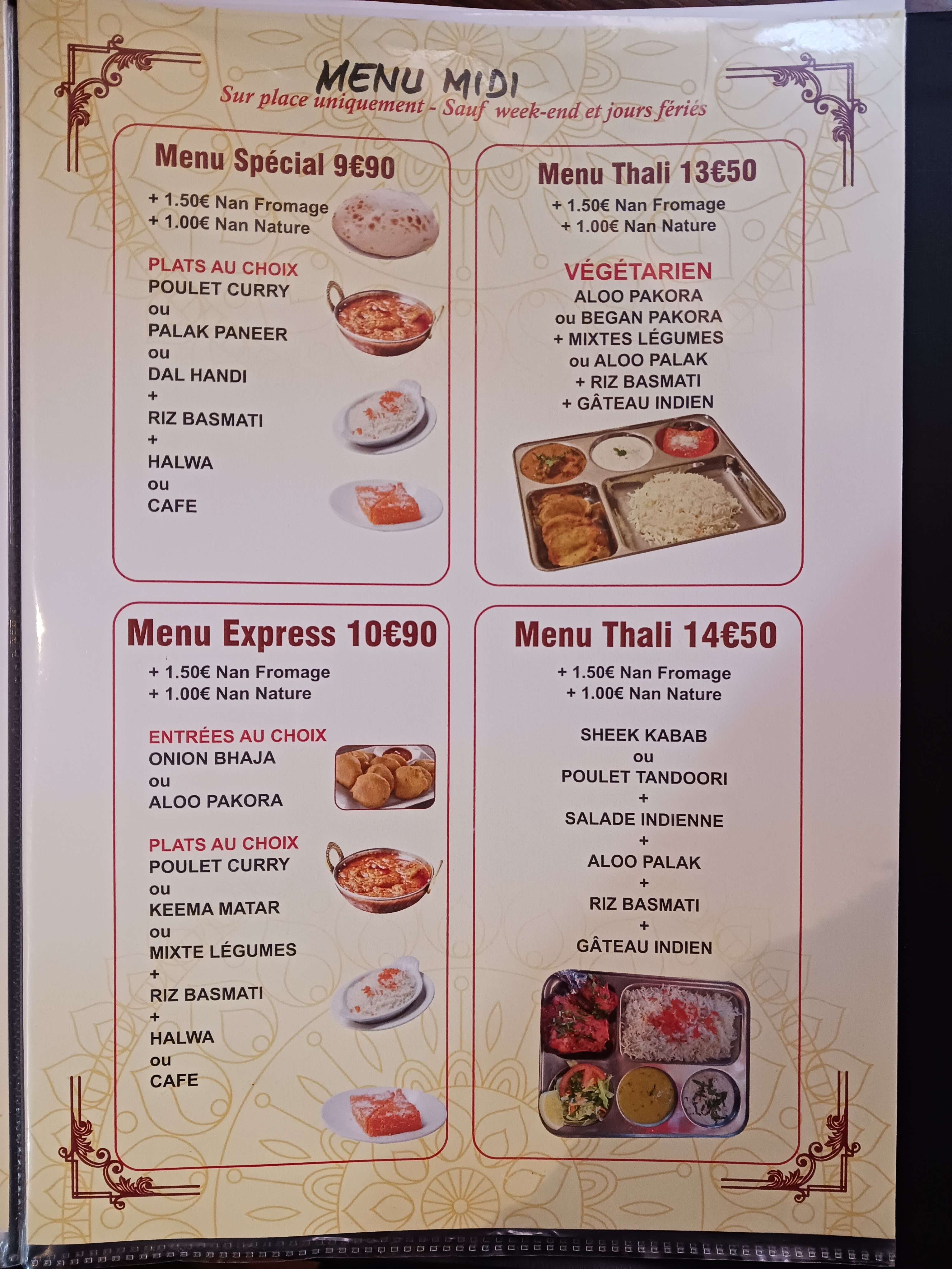 Bon. Gouteux. Teste et aime : agneau korma, menu midi, cheese naan pimente