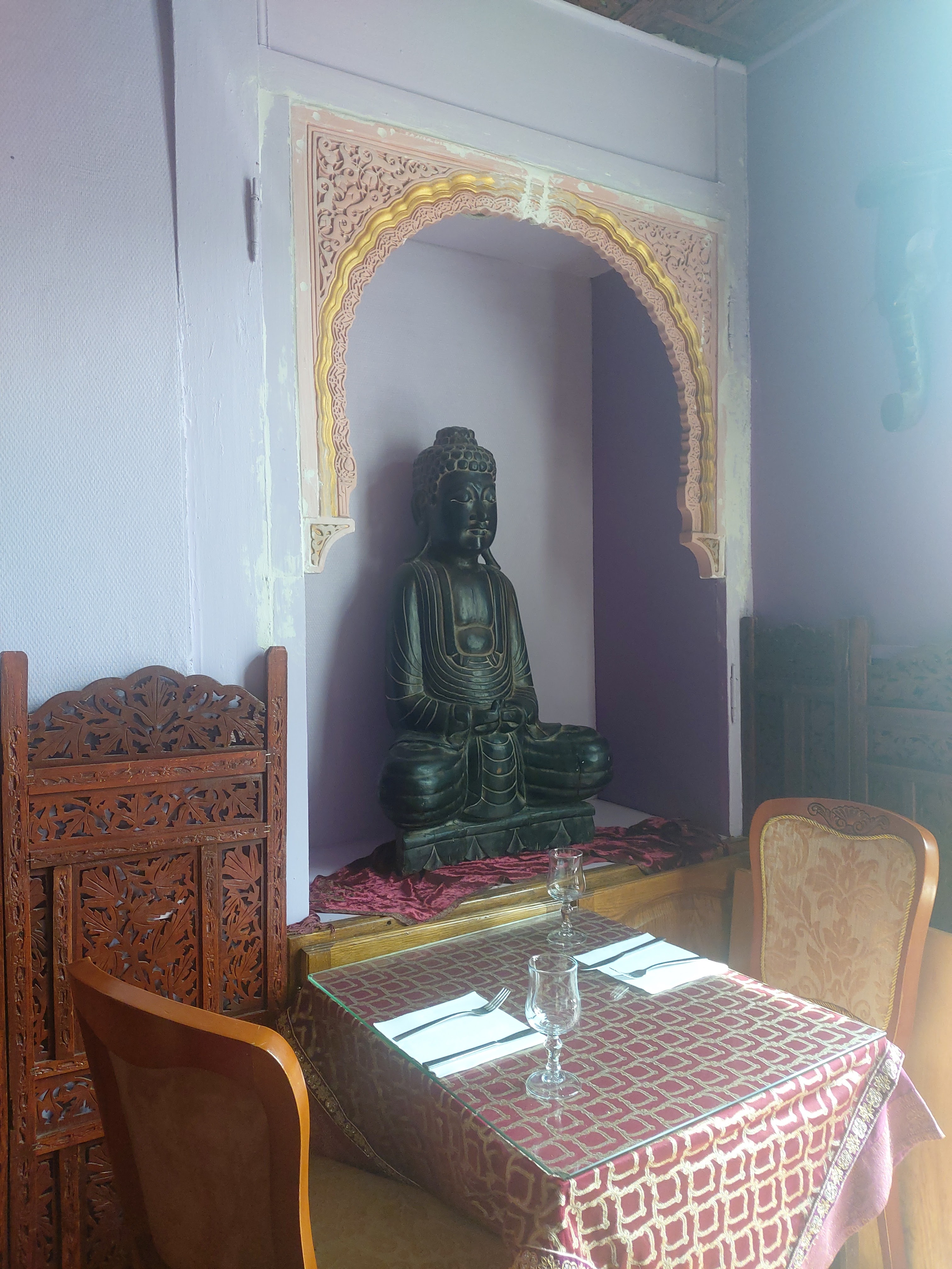 Petit resto sympa avec une déco pas trop kitsch. Cuisine savoureuse et bien servie. Le service a été rapide et notre jeune serveuse agréable. Un bon indien pour un déjeuner ou dîner exotique.